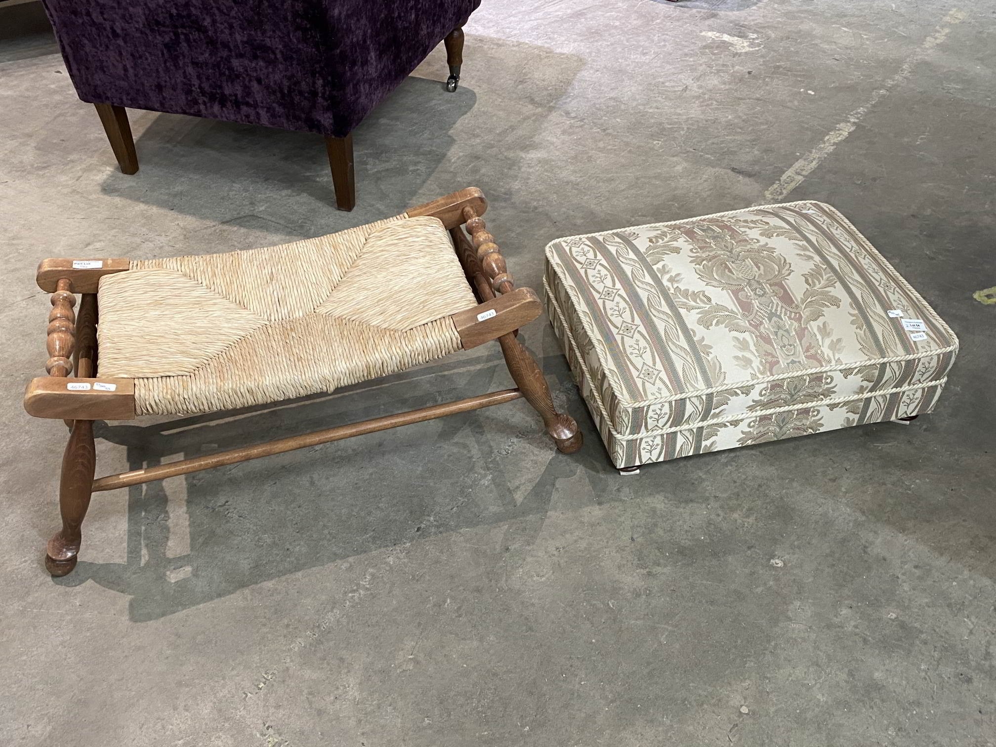 Upholstered footstool 18H 55W 46D & an Arts & Crafts oak, rush seated stool 33H 80W 33D