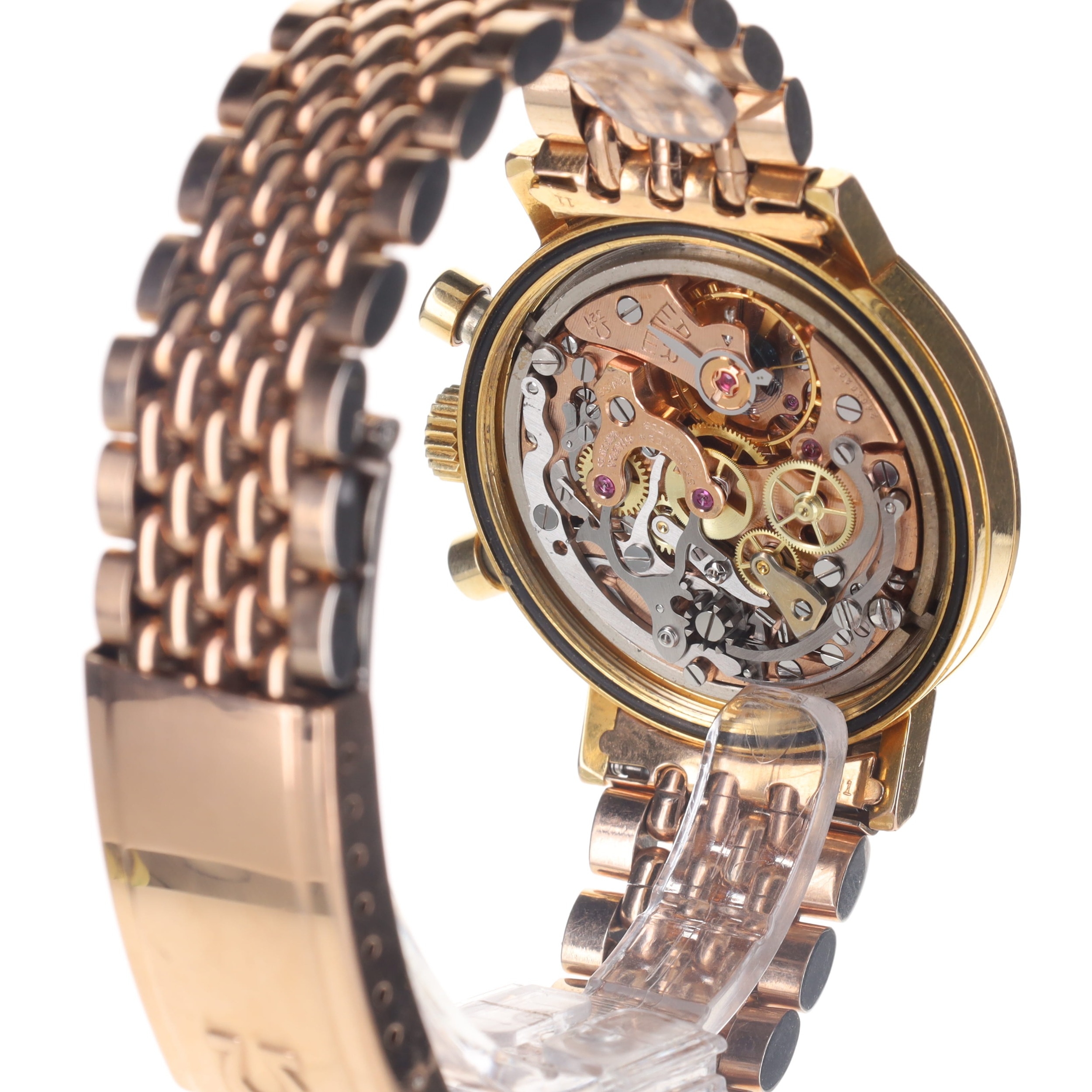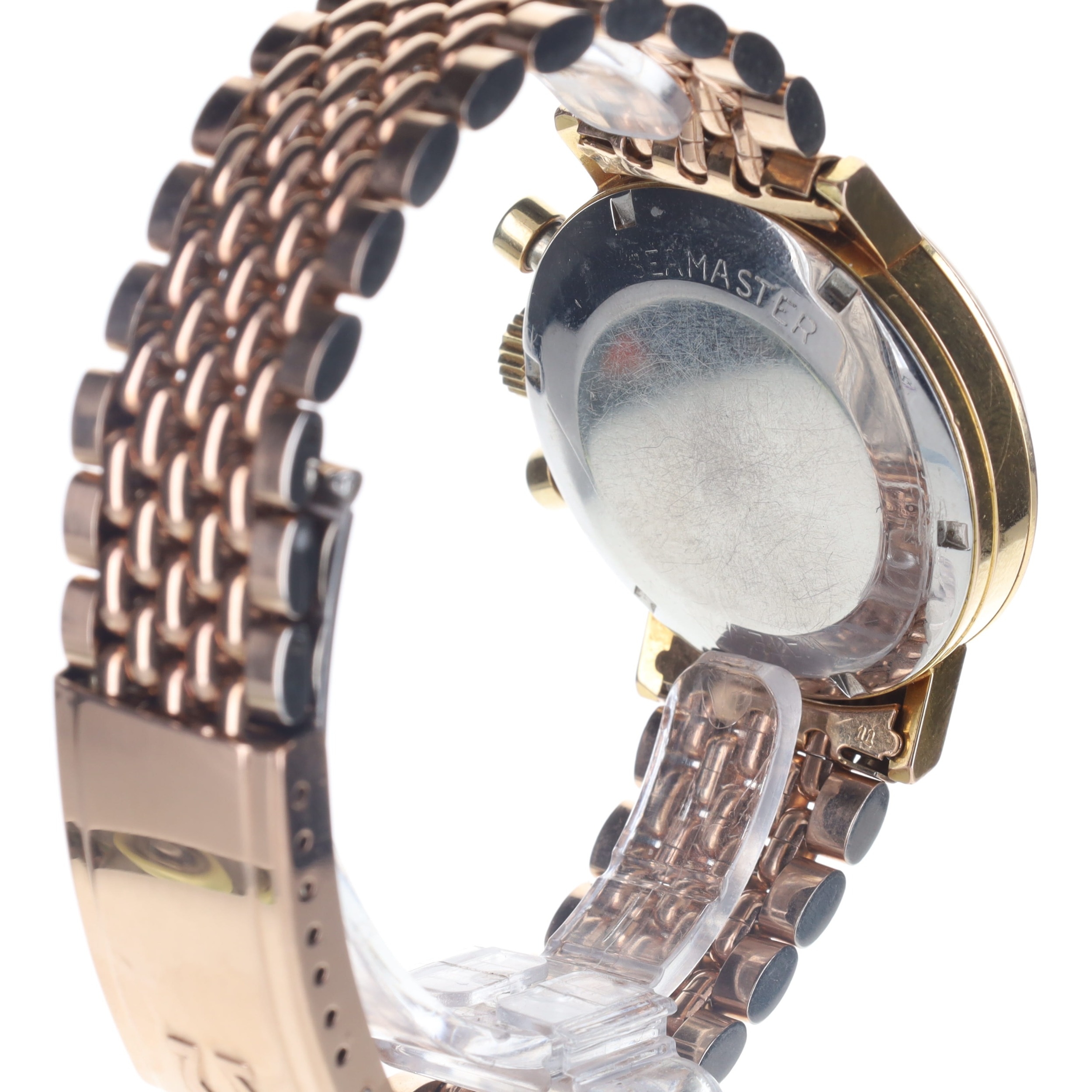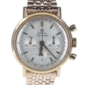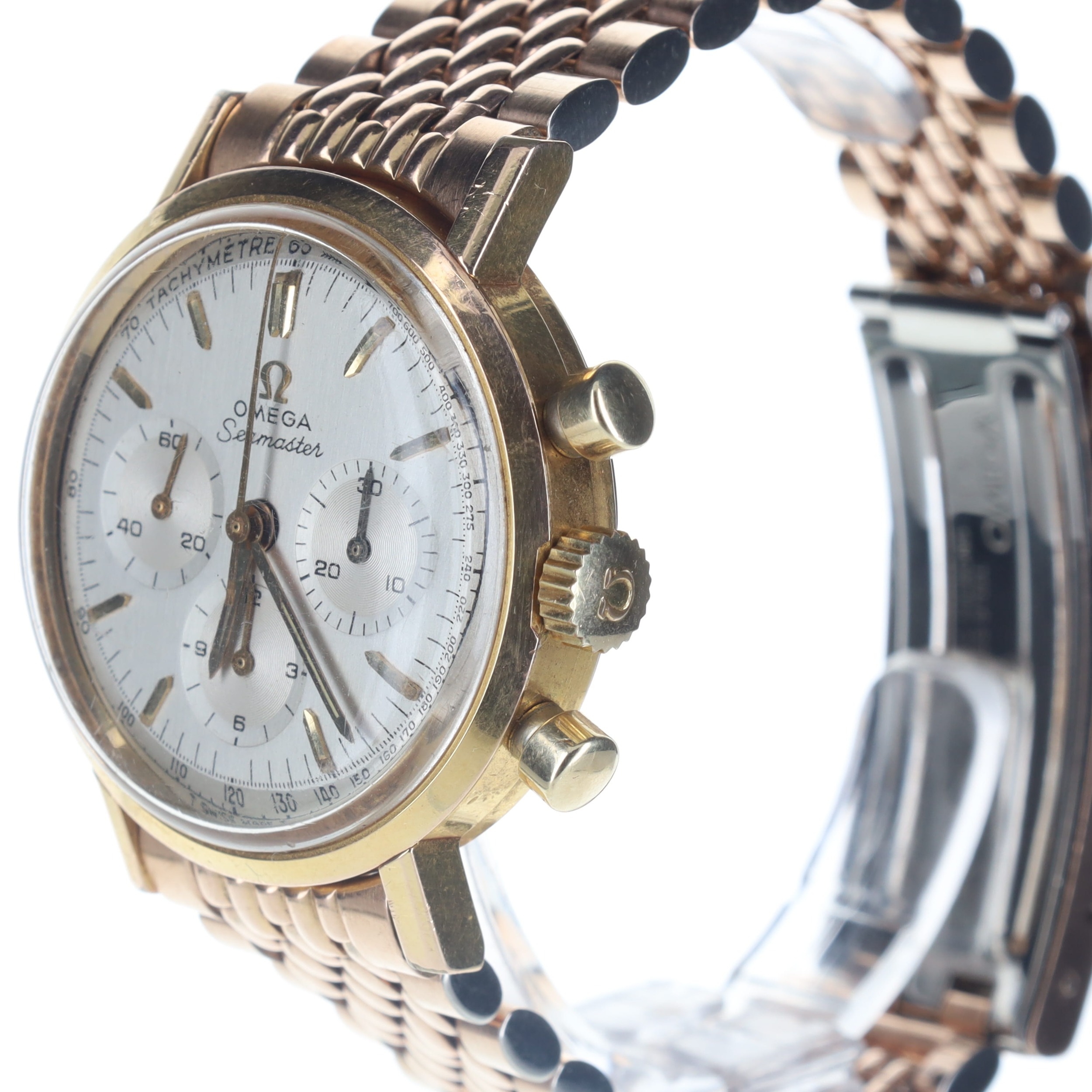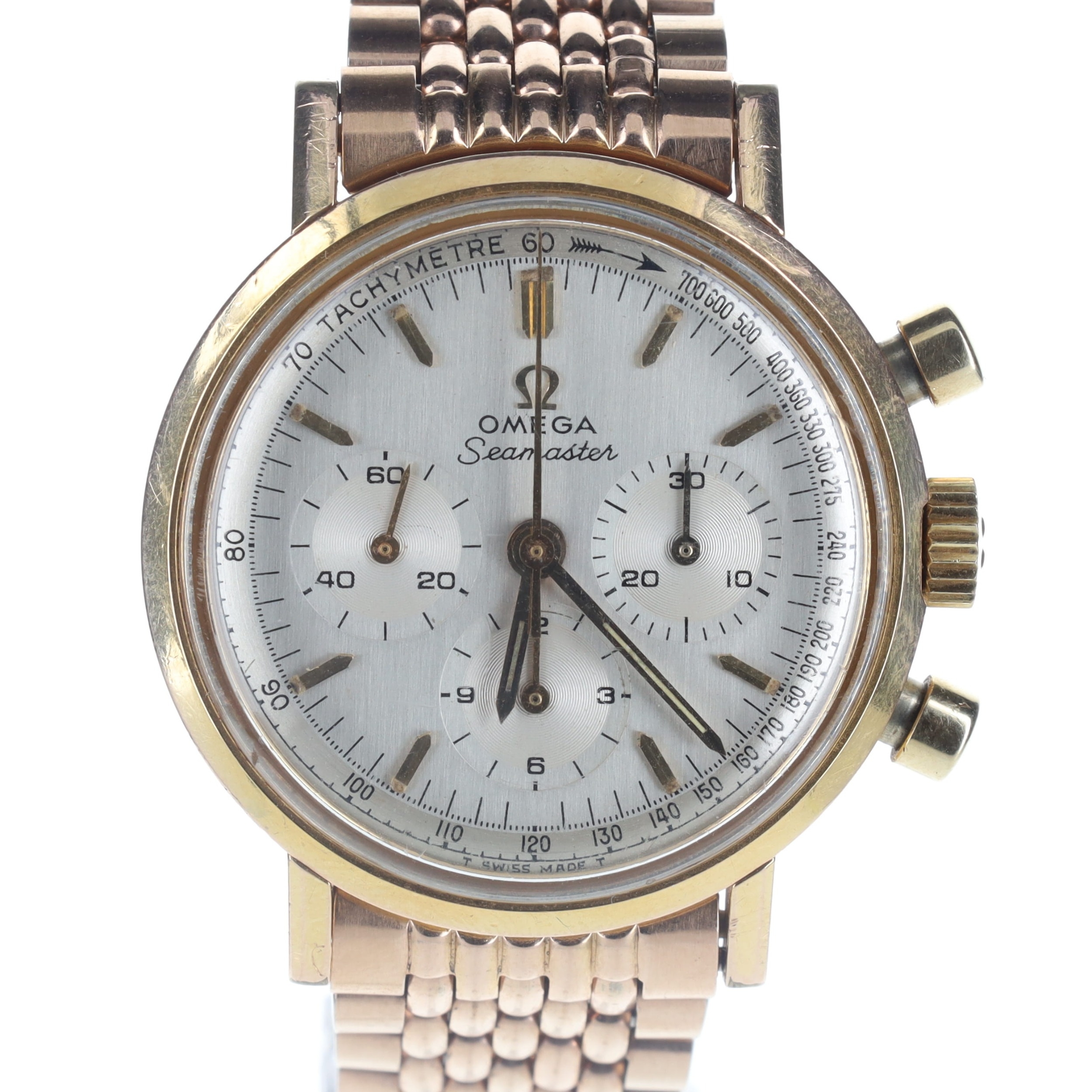 Omega - Seamaster Chronograph Watch. Omega Cal. 321 hand -wind chronograph movement. The case is made of gold-plated base metal with an aftermarket Omega beads of rice bracelet ref. 1502. An acrylic crystal. White dial w/ white sub-dials for elapsed minutes & hours. Chronograph function. Watch reference number 105.005-66. The watch is working, winds & runs but may require servicing due to top pusher being slightly stuck. Box & papers are not included.