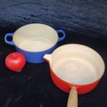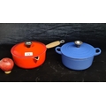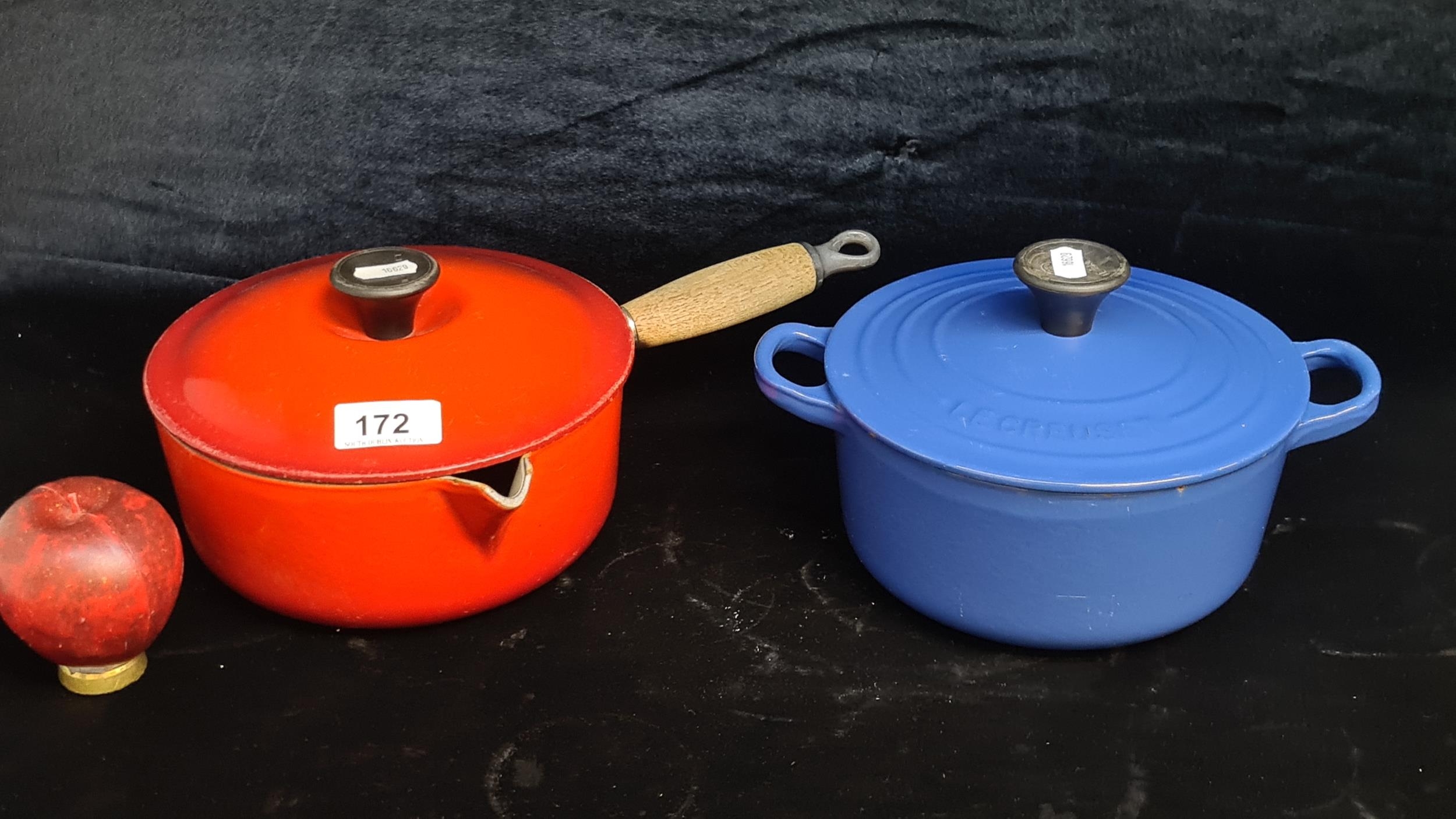 Two cast iron Le Creuset items including a lidded casserole dish and lidded saucepan. Both in very good condition.