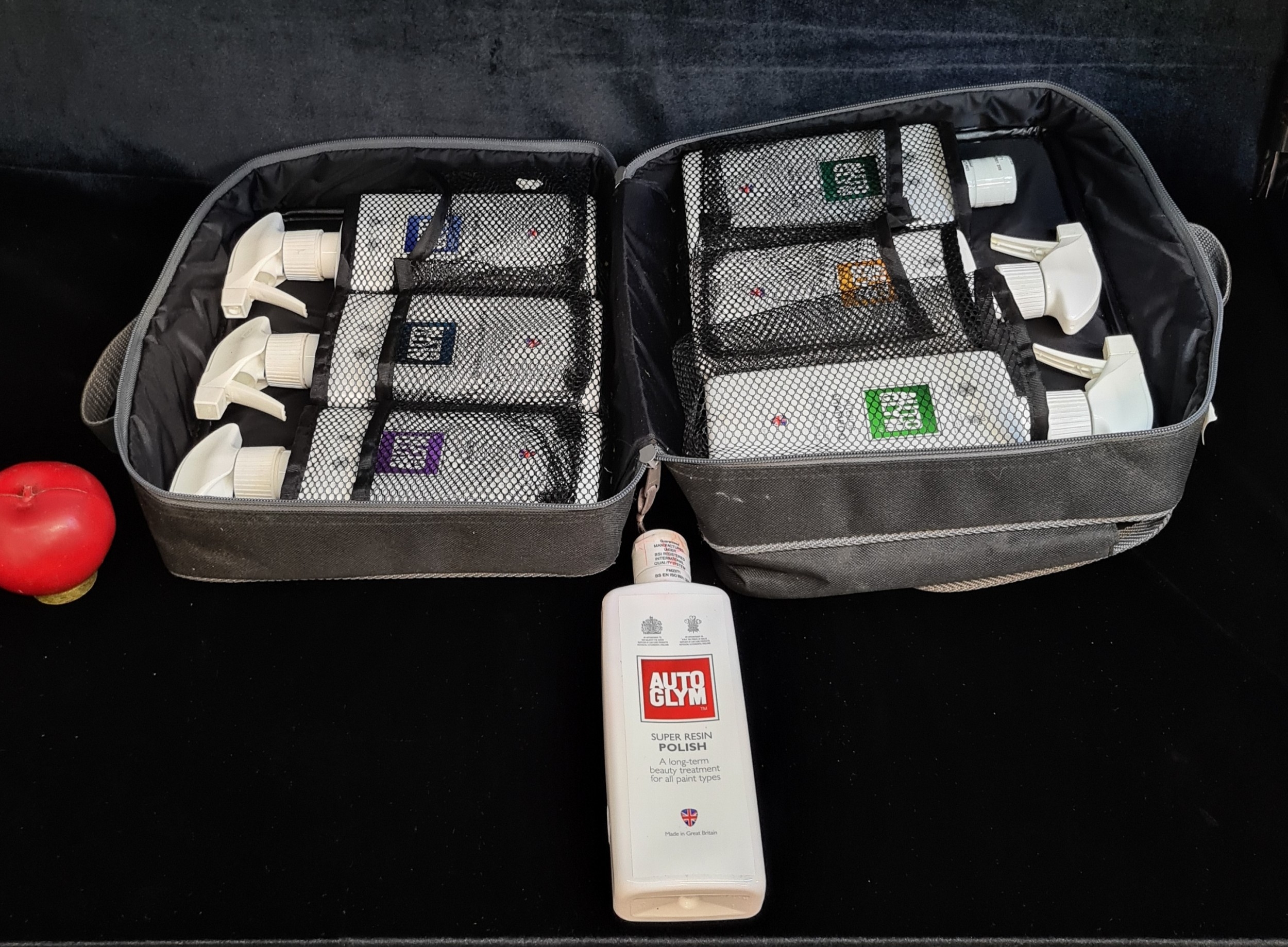 A new Volkswagen Auto Glym car cleaning accessory kit comprised of custom wheel cleaner, super resin polish, fast glass, interior shampoo etc. All comprised within A Lifeshine Auto Glym carrying bag. RRP €120