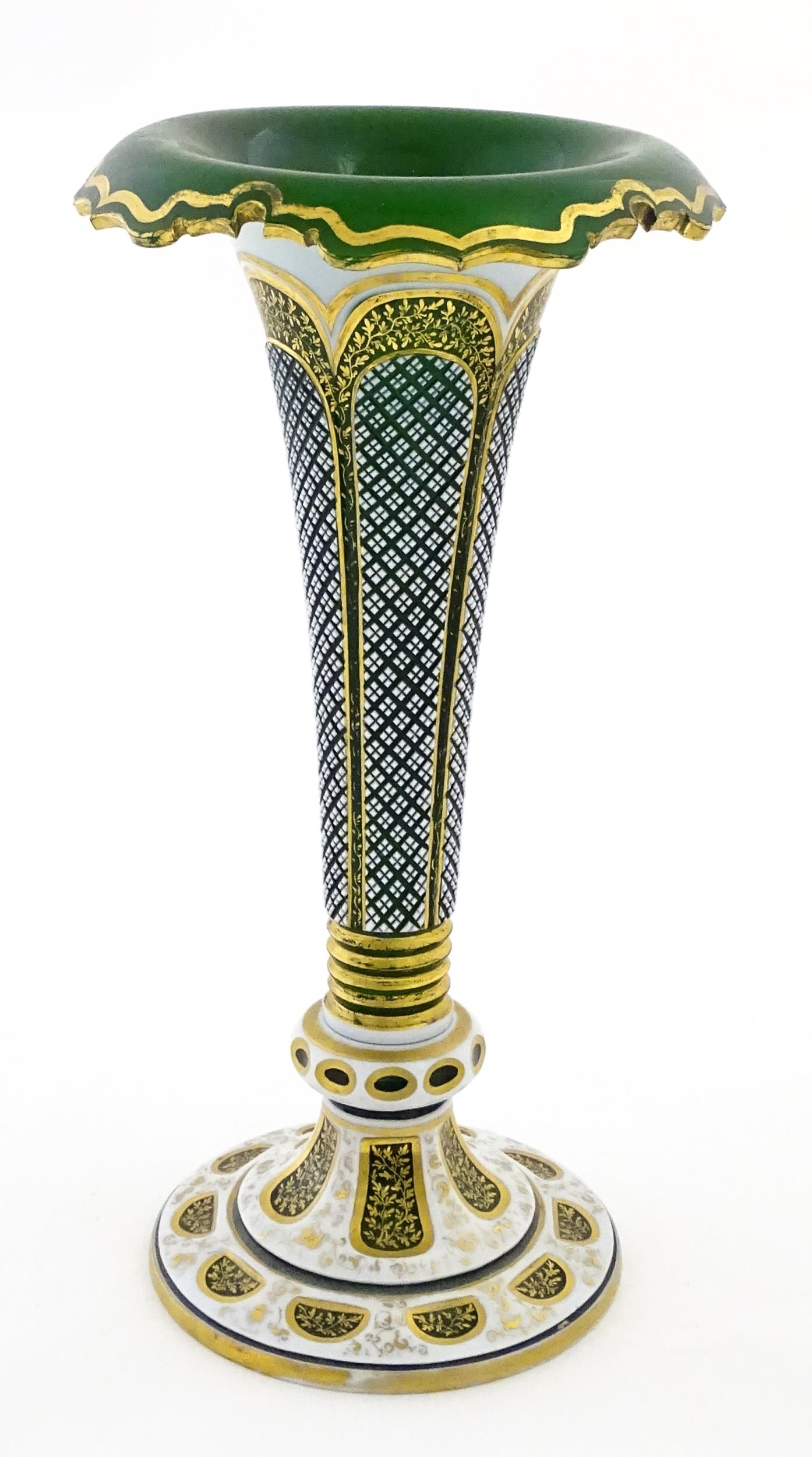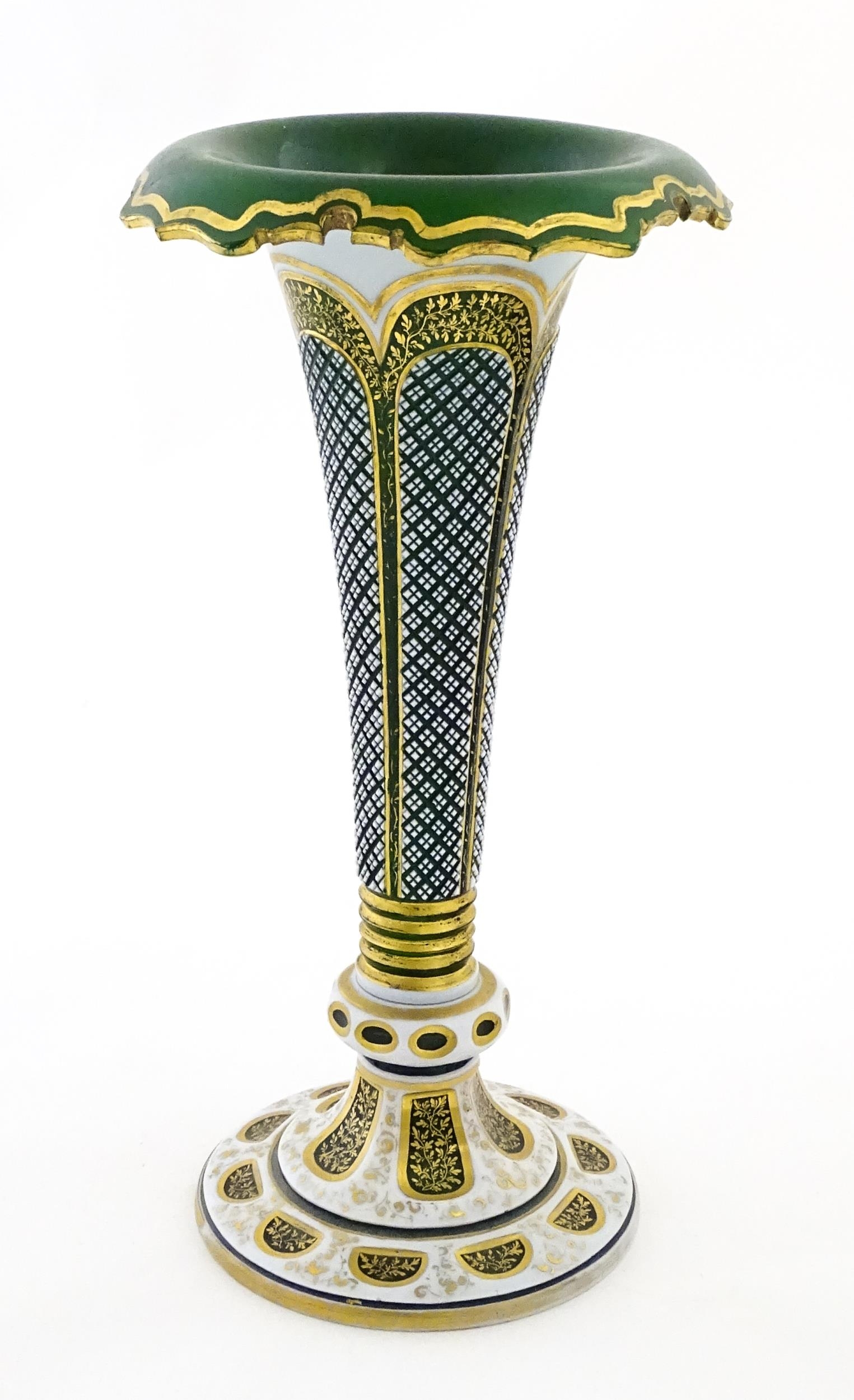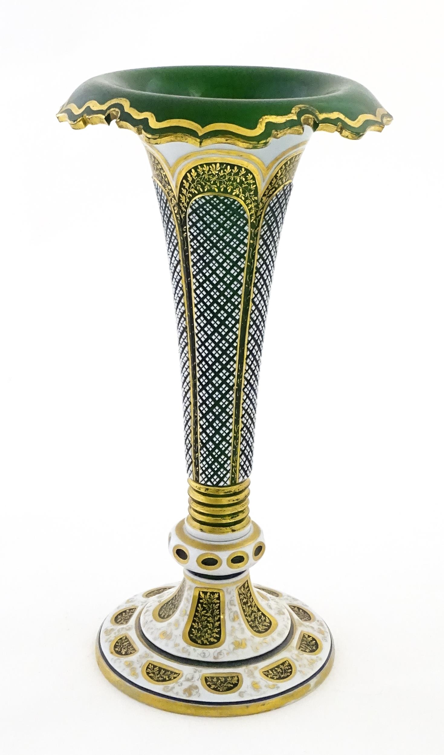A Bohemian green glass vase of flared form with white overlay and gilt detail. Approx. 12 1/4" high