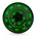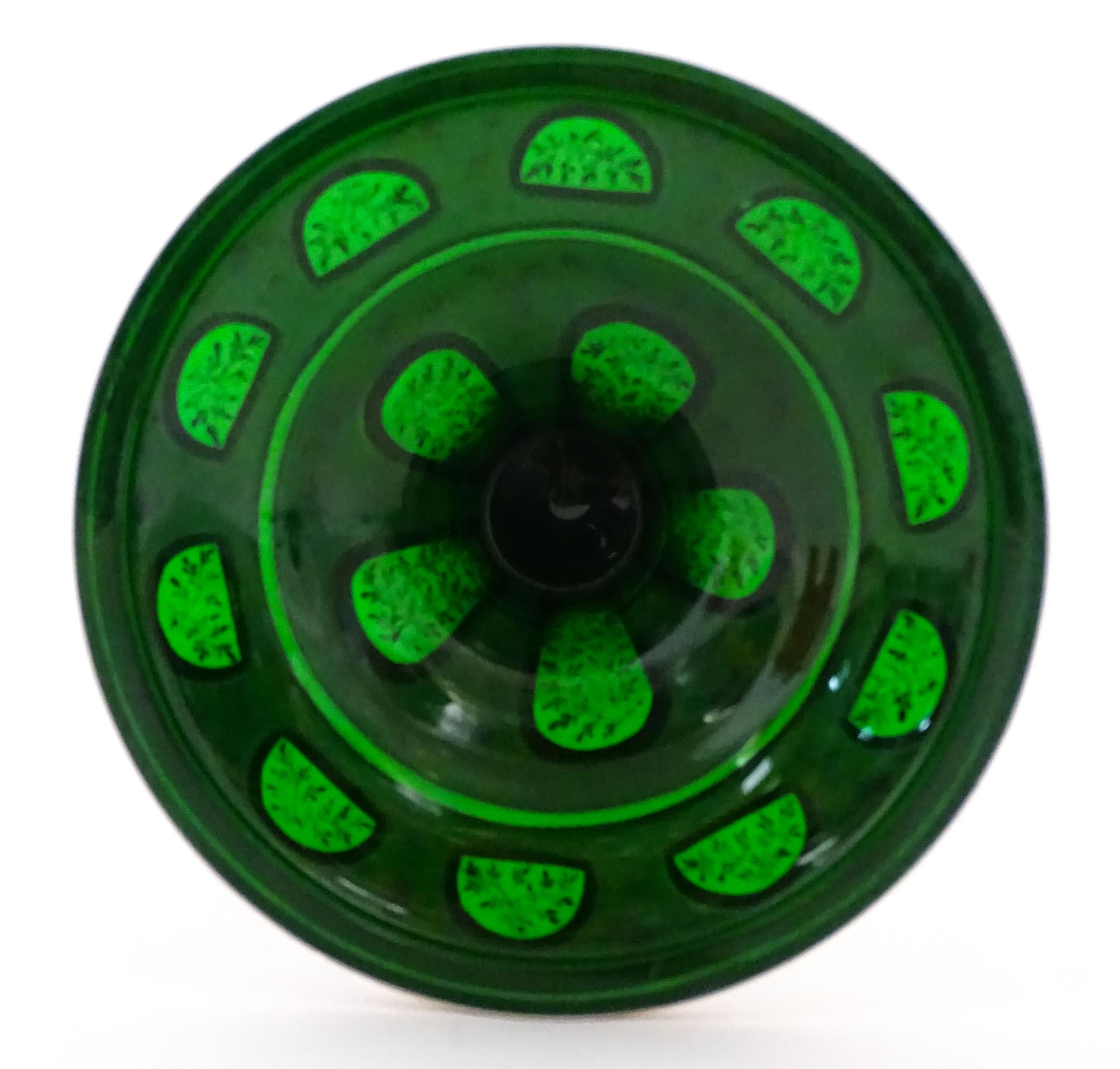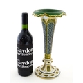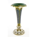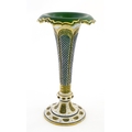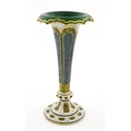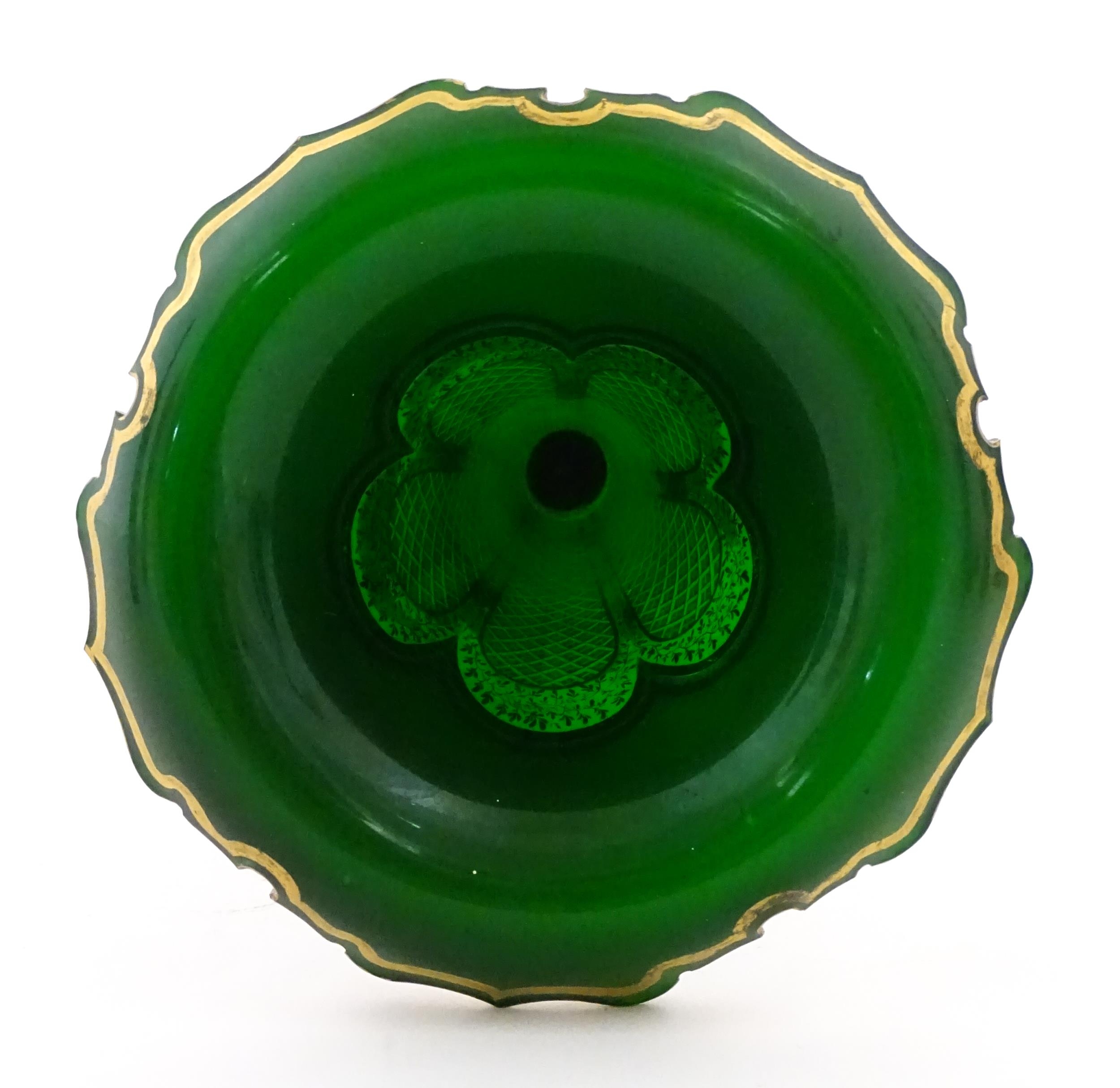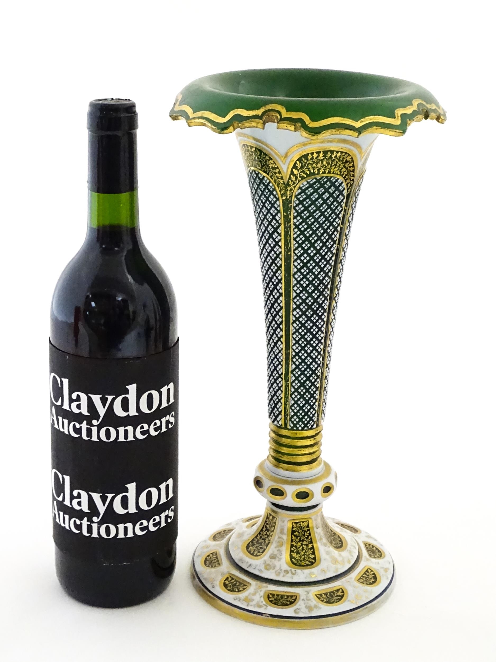 A Bohemian green glass vase of flared form with white overlay and gilt detail. Approx. 12 1/4" high