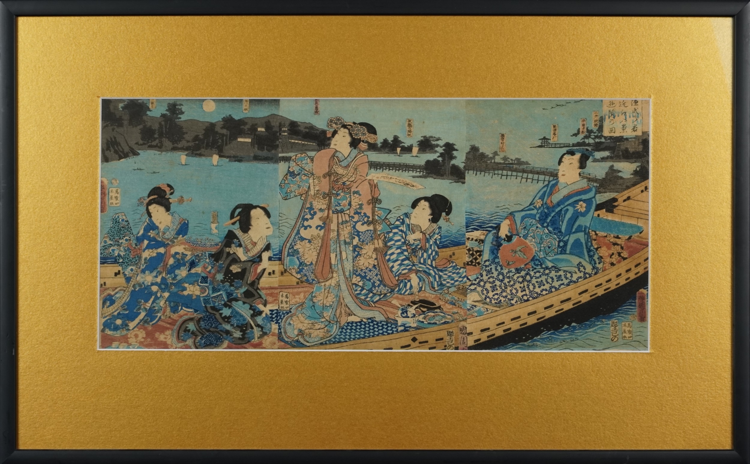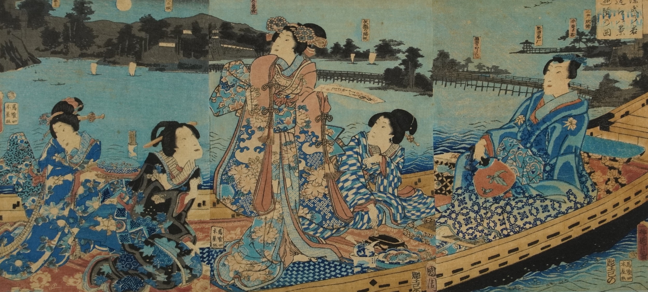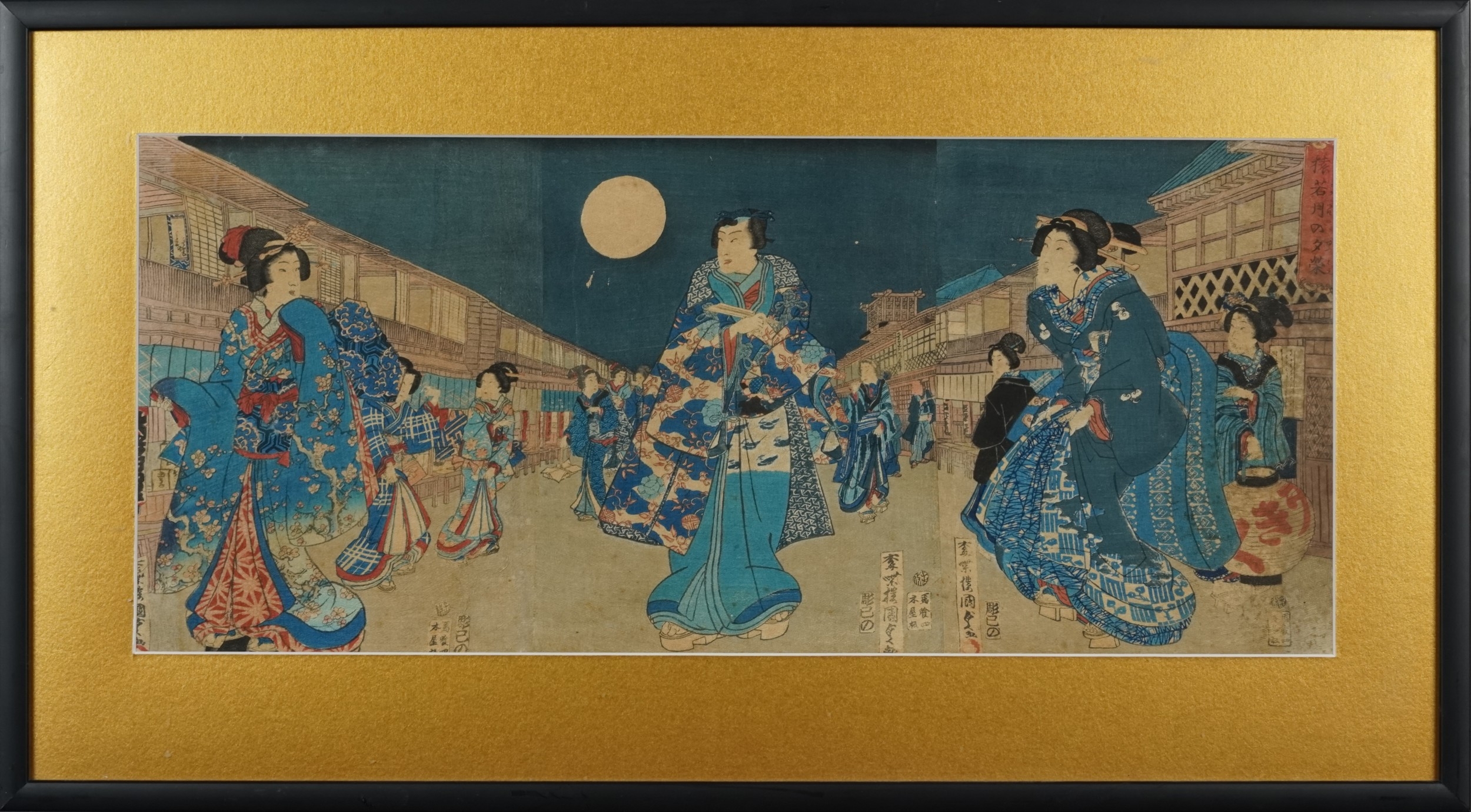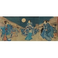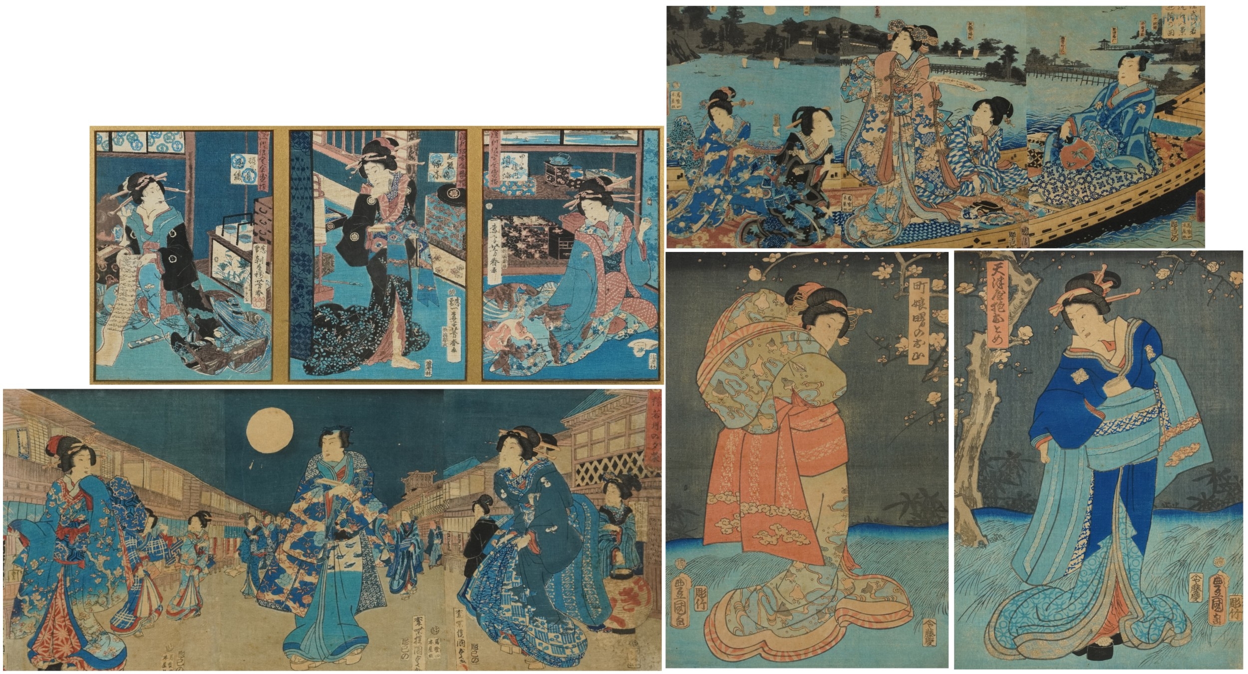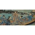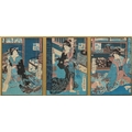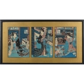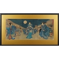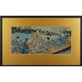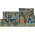 Five Japanese woodblock prints bearing signatures, Utagawa Kunisada, two Utagawa Yoshiharu and Toyahara Kunichika, each framed and glazed, the largest 21cm x 45cm.
