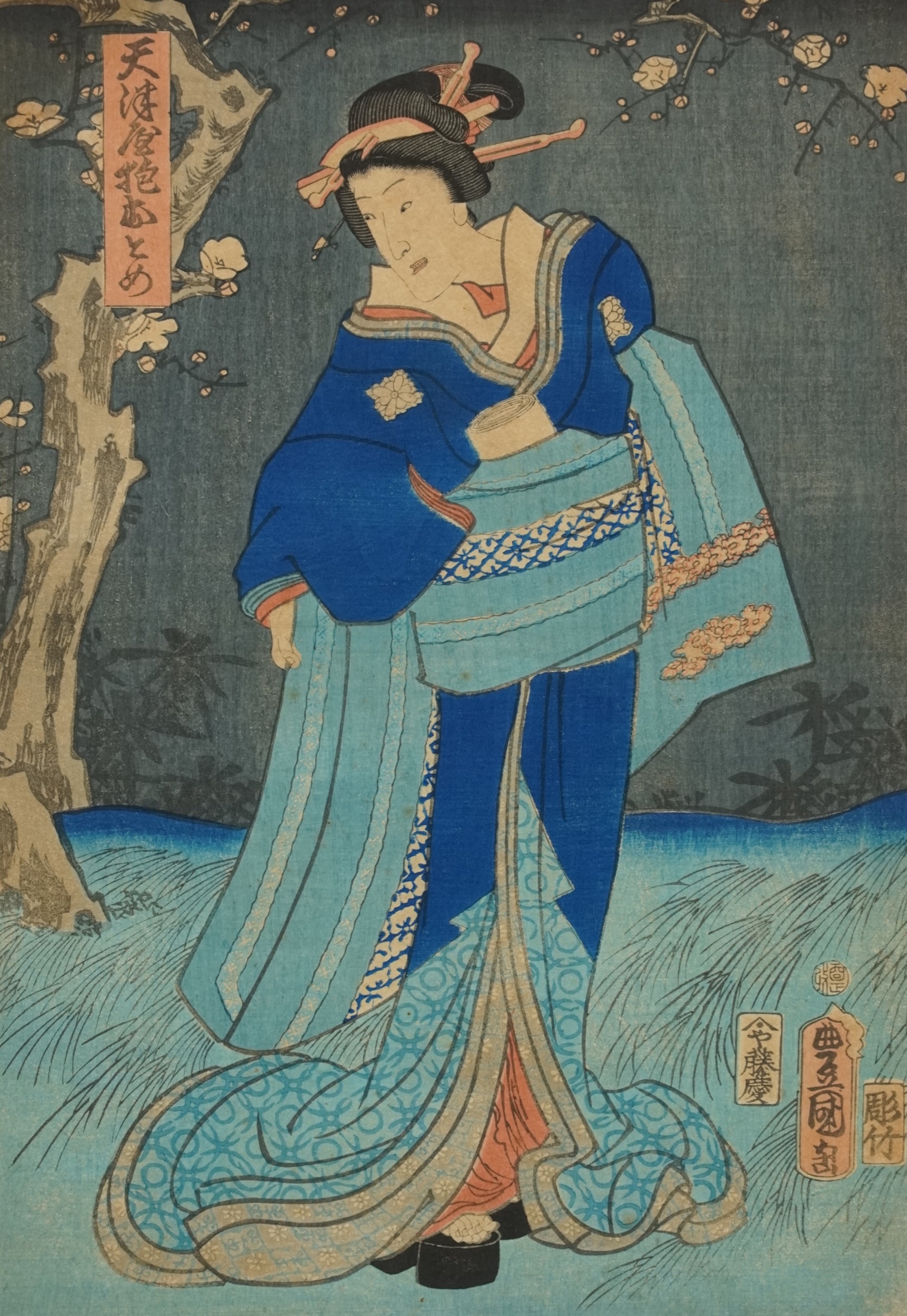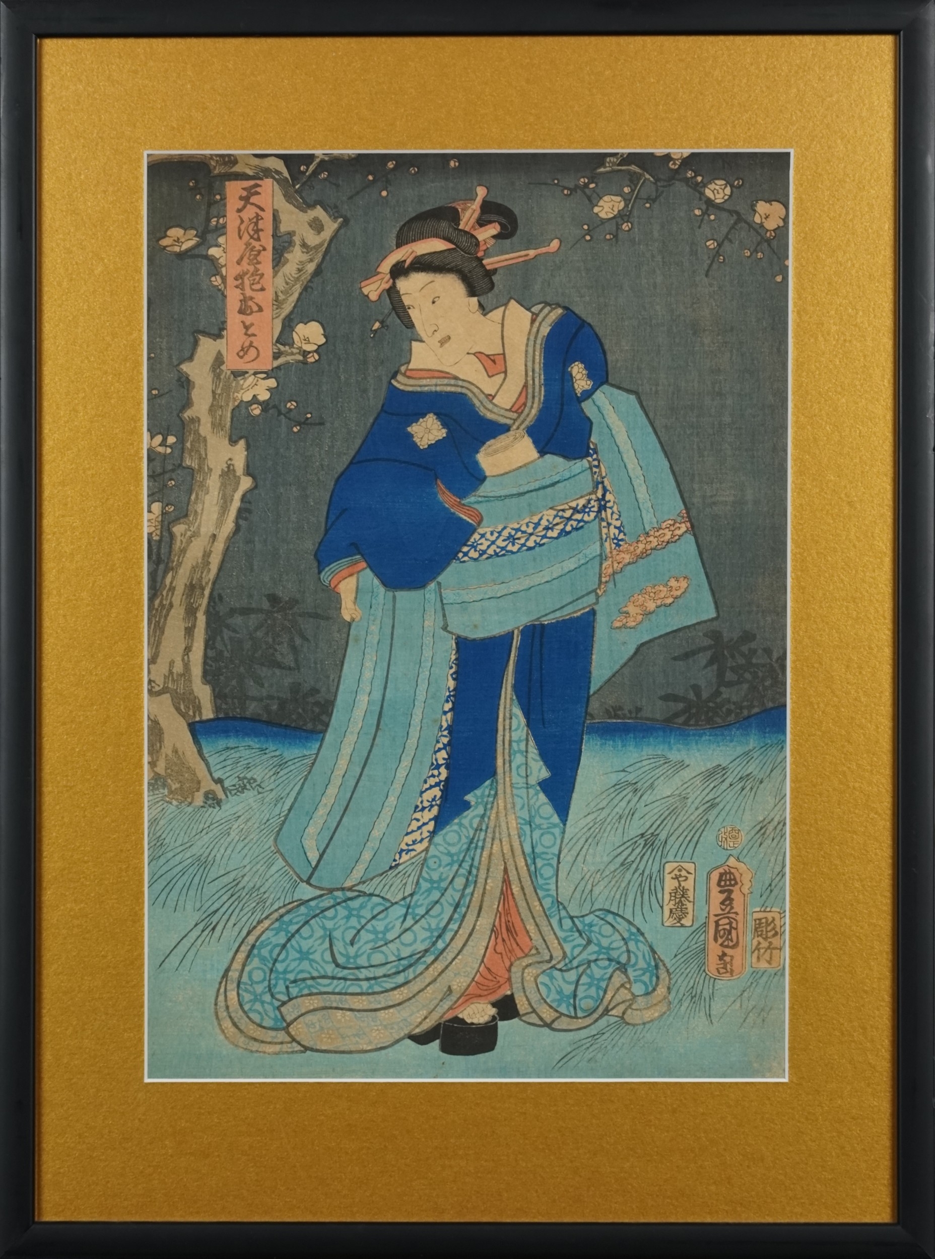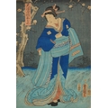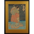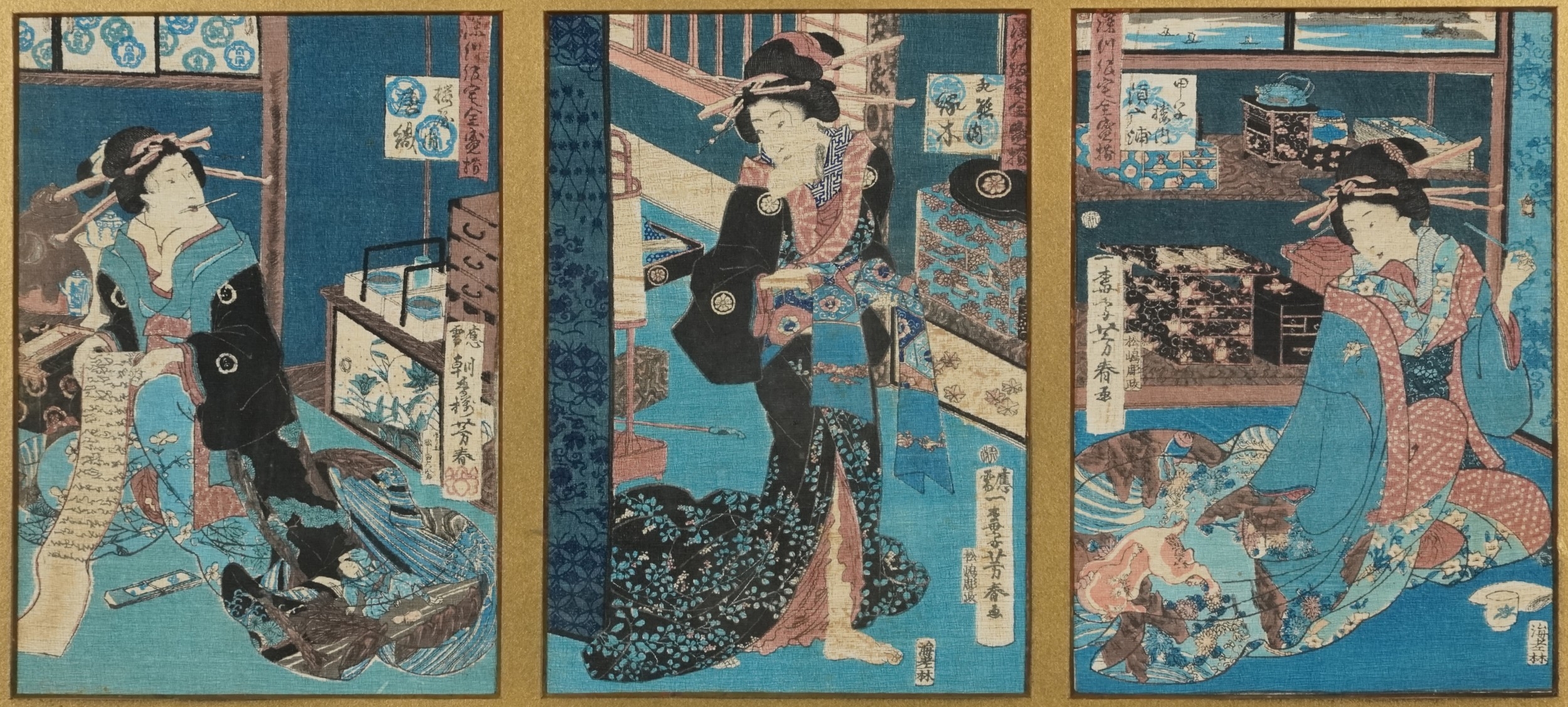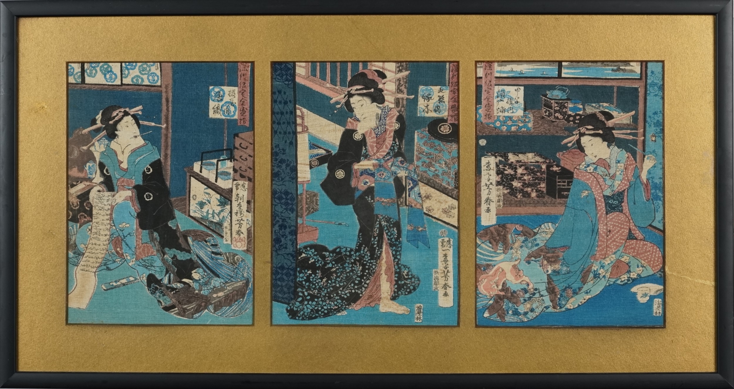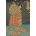 Five Japanese woodblock prints bearing signatures, Utagawa Kunisada, two Utagawa Yoshiharu and Toyahara Kunichika, each framed and glazed, the largest 21cm x 45cm.
