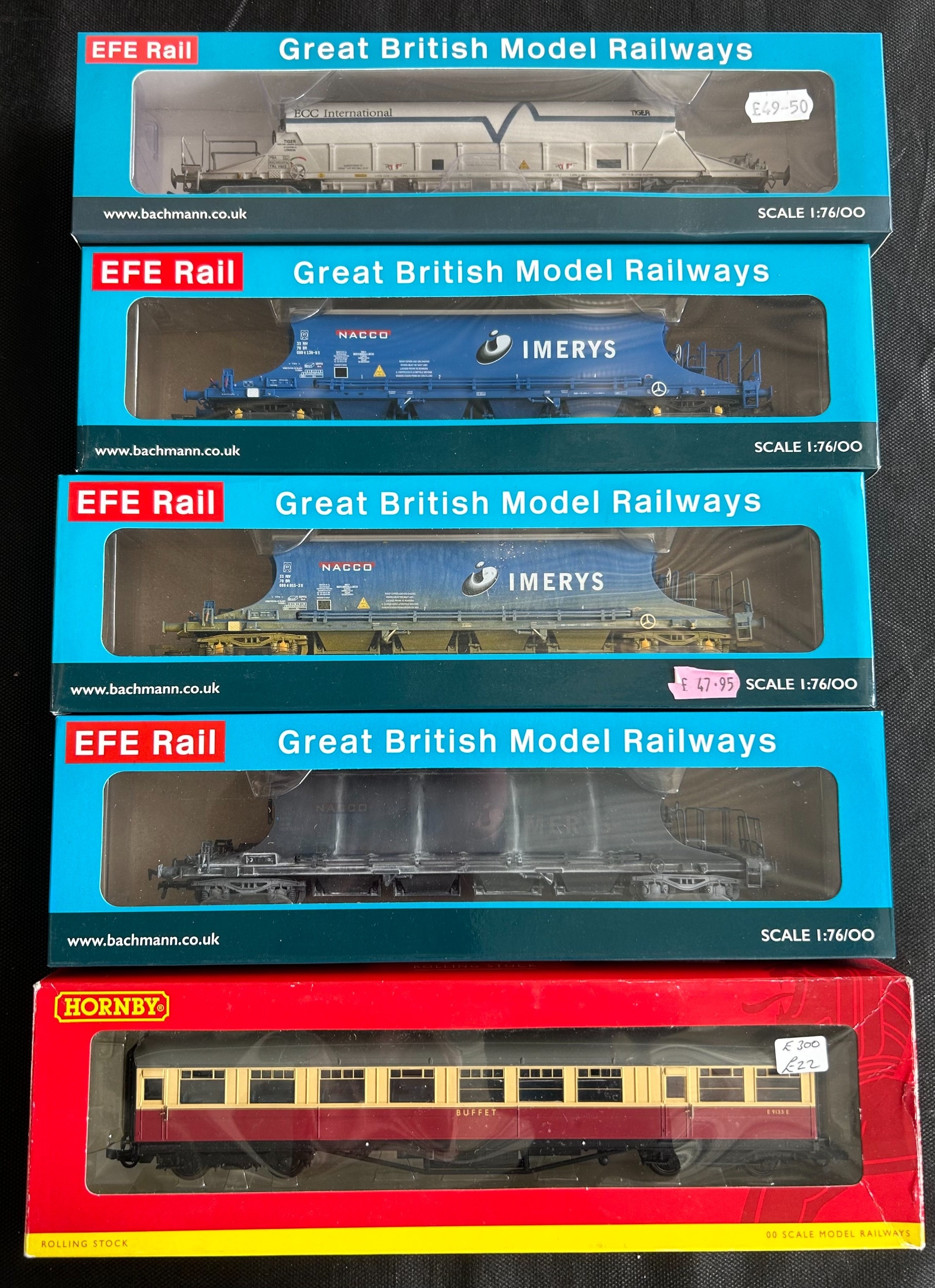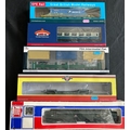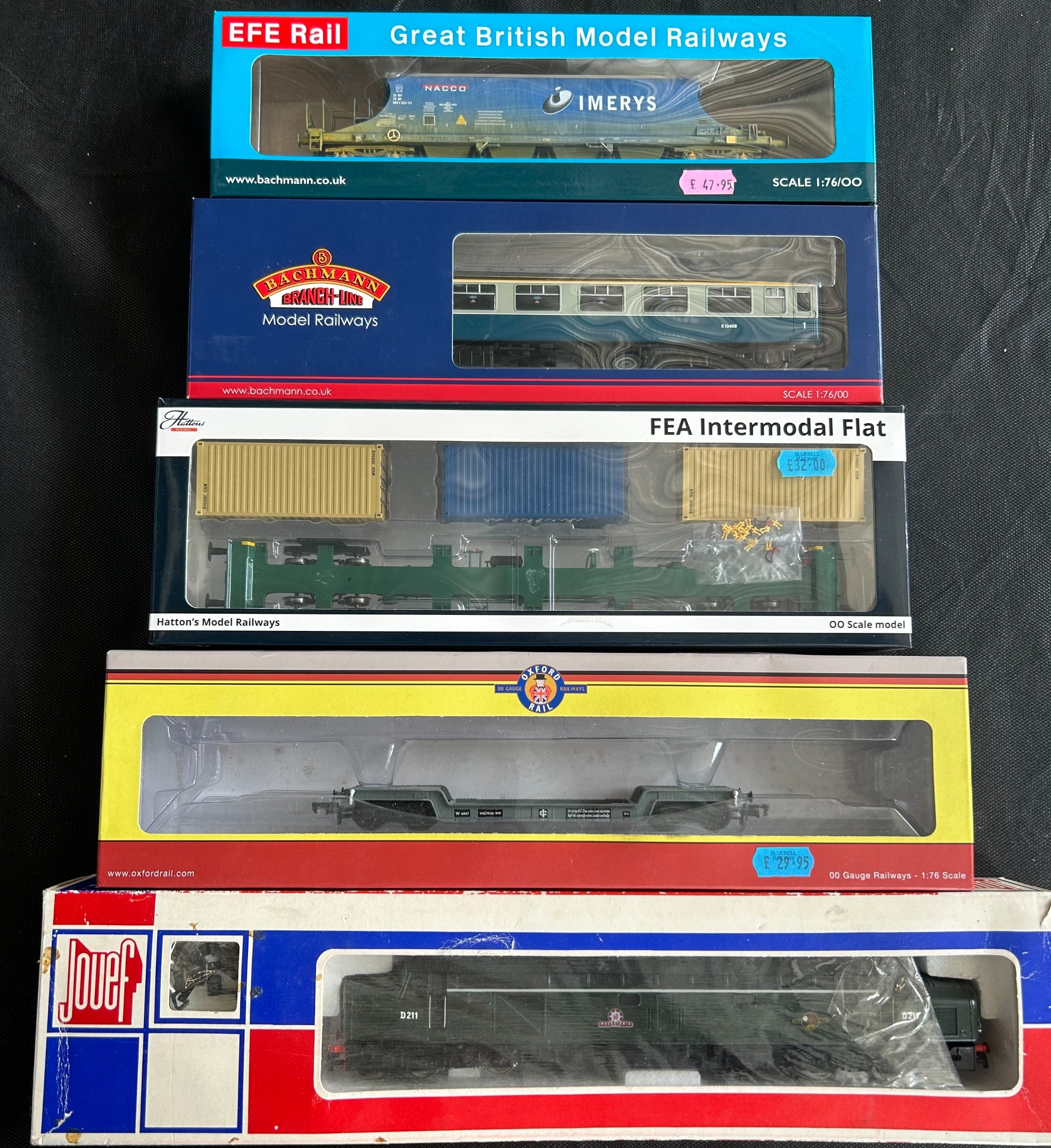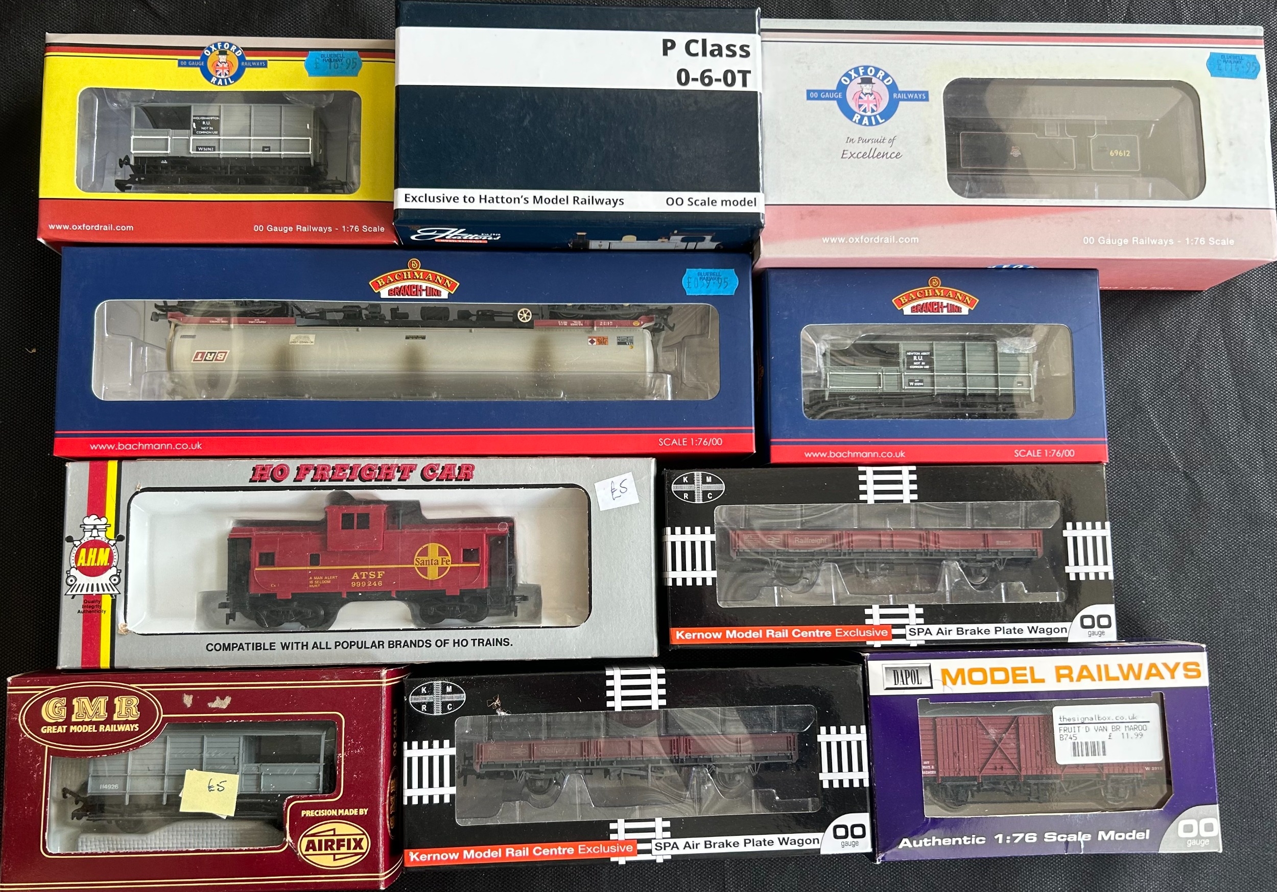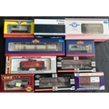 A quantity of OO Railway. A Hatton's BR P. Class 0-6-0 tank locomotive, 31027 (H4-P-007). Oxford Rail BR N7 Class 0-6-2 tank locomotive 69612. Jouef BR Class 40 1-Co-Co-1 diesel electric, 'Mauritania' D211. Together with 5x EFE Rail - 4x JIA NACCO bogie wagons and a PBA Tiger Clay wagon. 2x passenger coaches - a Hornby BR Buffet Car and a Bachmann BR Mk2A FK coach. 9 freight wagons including a Hattons FEA Intermodal Flat. A Bachmann 100T TEA bogie tank wagon. Oxford Rail Warwell A Diamond bogie. 2x Kernow BR SPA open wagons, etc. Plus AHM HO Caboose. Etc. Plus 2x PECO station 'OVERALL ROOF' packs. All boxed, minor wear. Contents VGC (22).