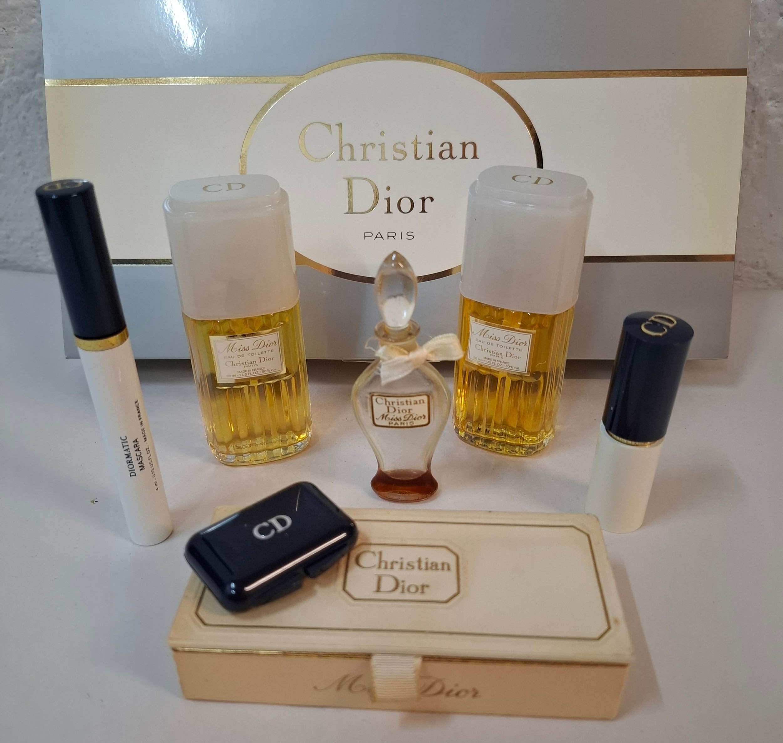 Christian Dior- Two full 30ml bottles of Miss Dior Eau de Toilette, a small partial bottle of Miss Dior together with un-used make-up products. Location:R2.2