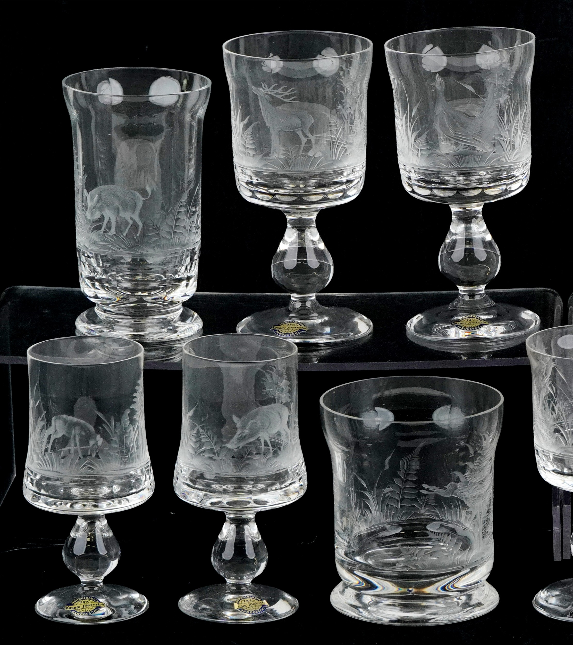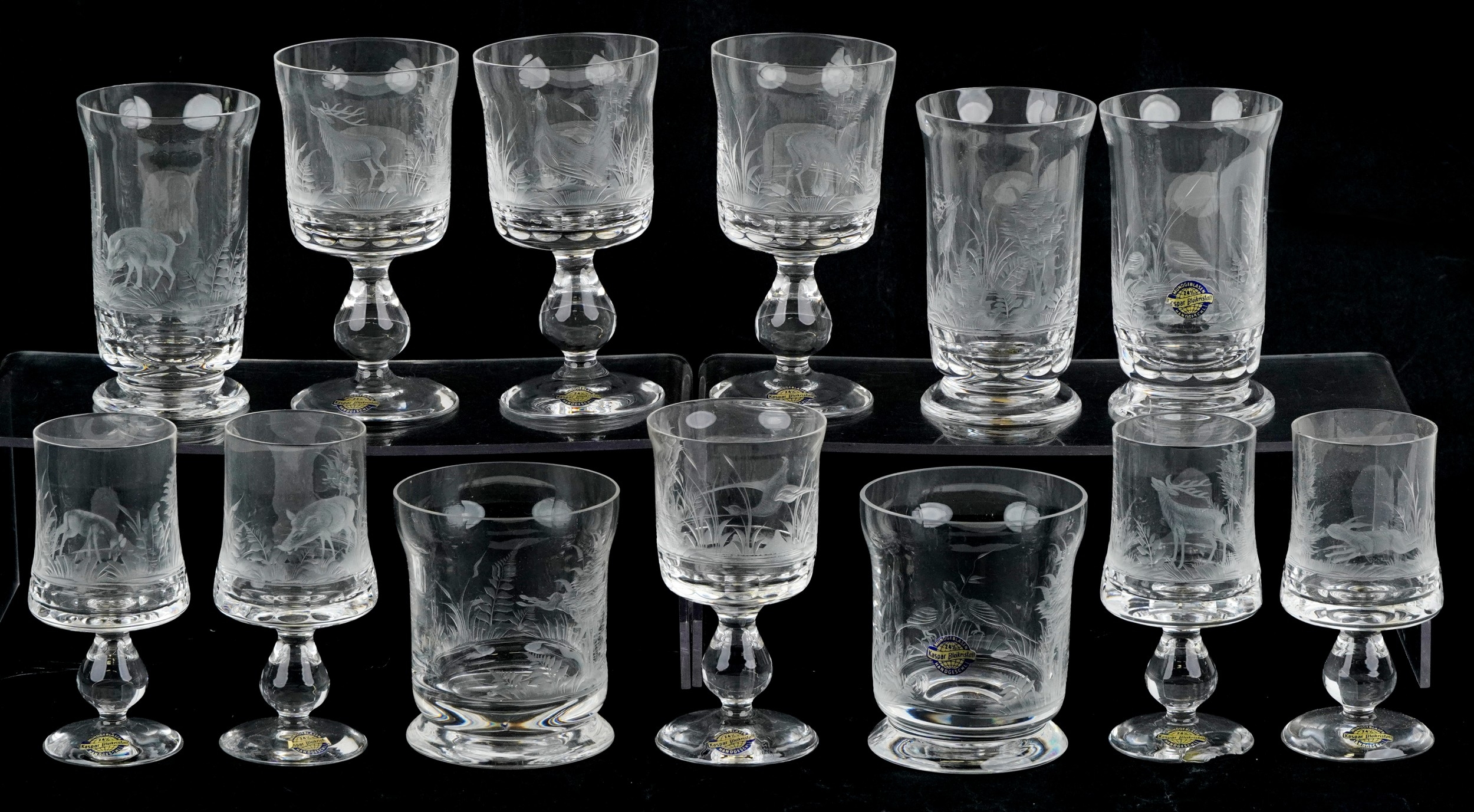 A collection of Kaspar Bleikristall crystal glasses acid etched with game animals, the largest 15cm high.