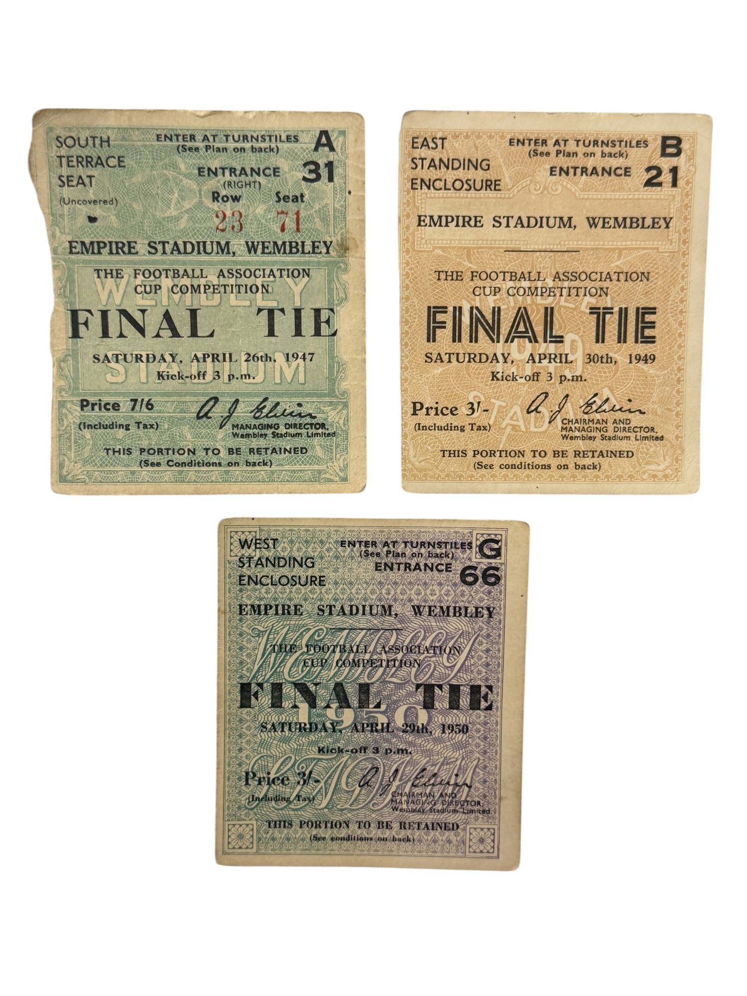 COLLECTION OF FA CUP FINAL FOOTBALL TICKET STUBS, 1947 CHARLTON ATHLETIC VERSUS BURNLEY, 1949 WOLVES VERSUS LEICESTER, 1950 LIVERPOOL VERSUS ARSENAL.