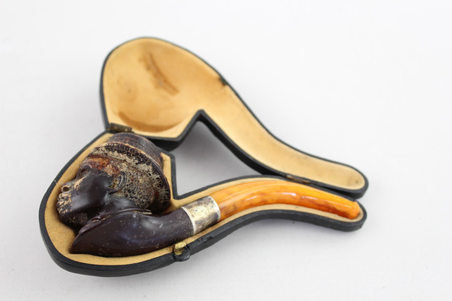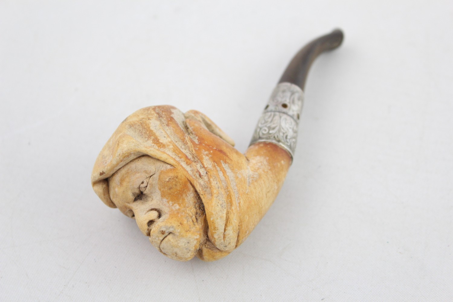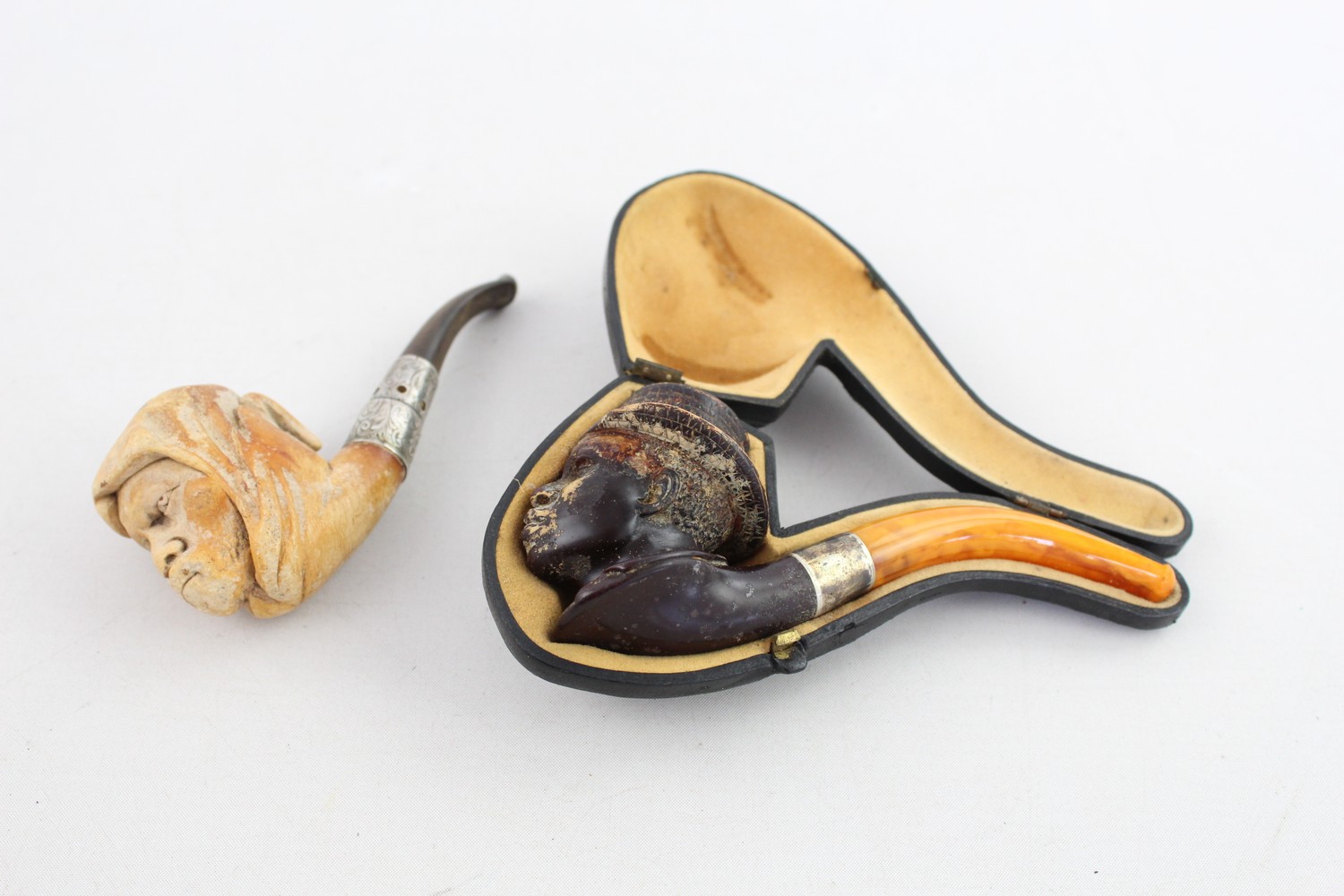 2 x Antique Carved MEERSCHAUM Figural Estate Smoking Pipes Inc SOLID SILVER Mout