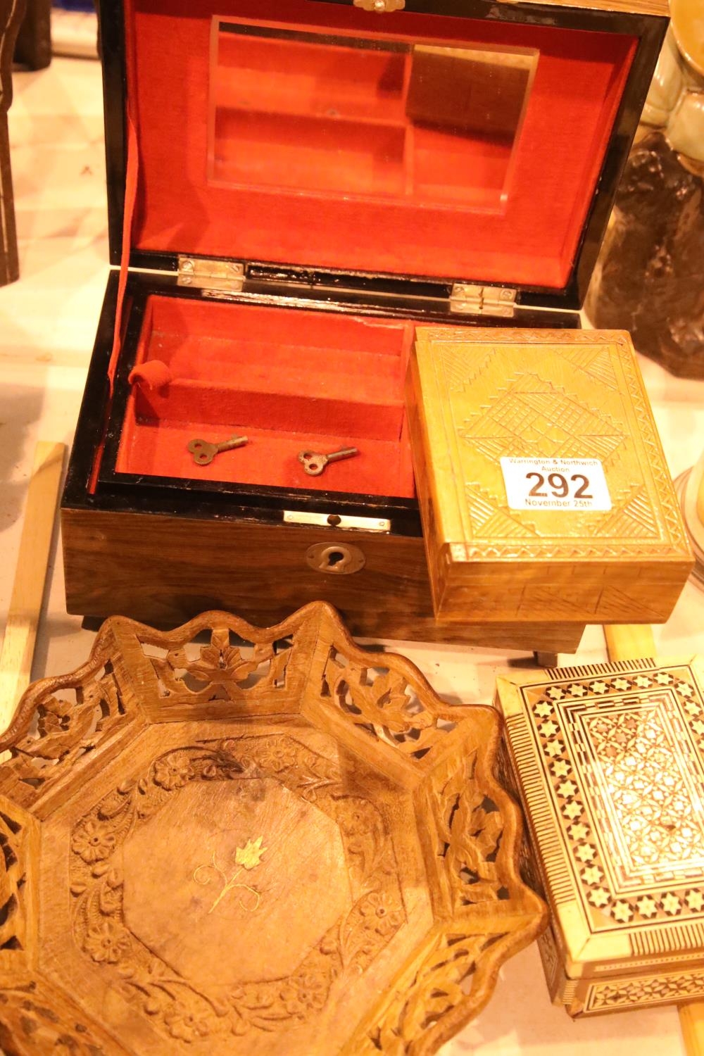 Musical jewellery box, octagonal tray, Indian box and a small box. Not available for in-house P&P