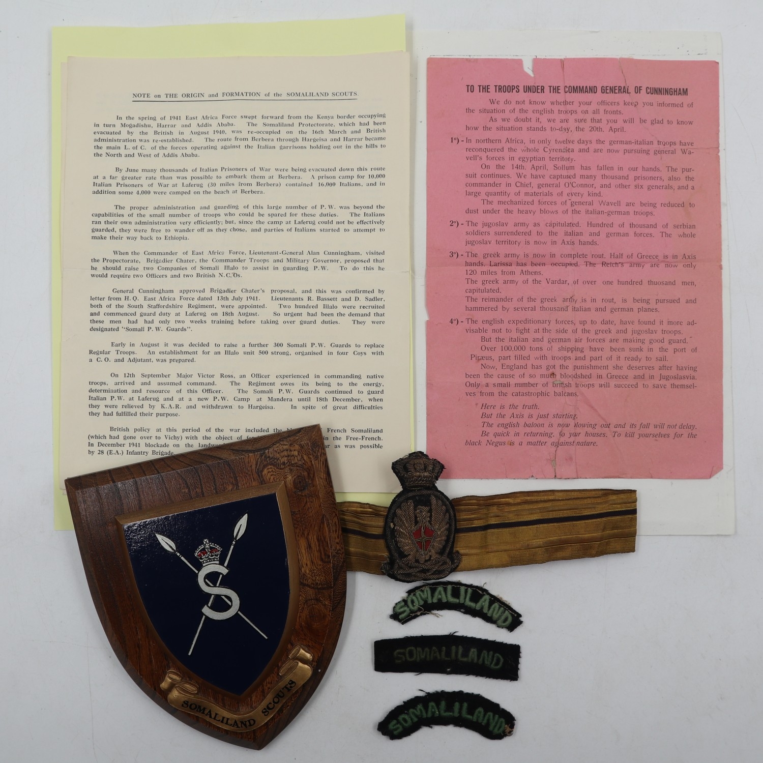 Small collection of items relating to the Somaliland Scouts to include a typewritten history, later plaque, uniform patches and a bullion cap badge. UK P&P Group 1 (£18+VAT for the first lot and £2+VAT for subsequent lots)