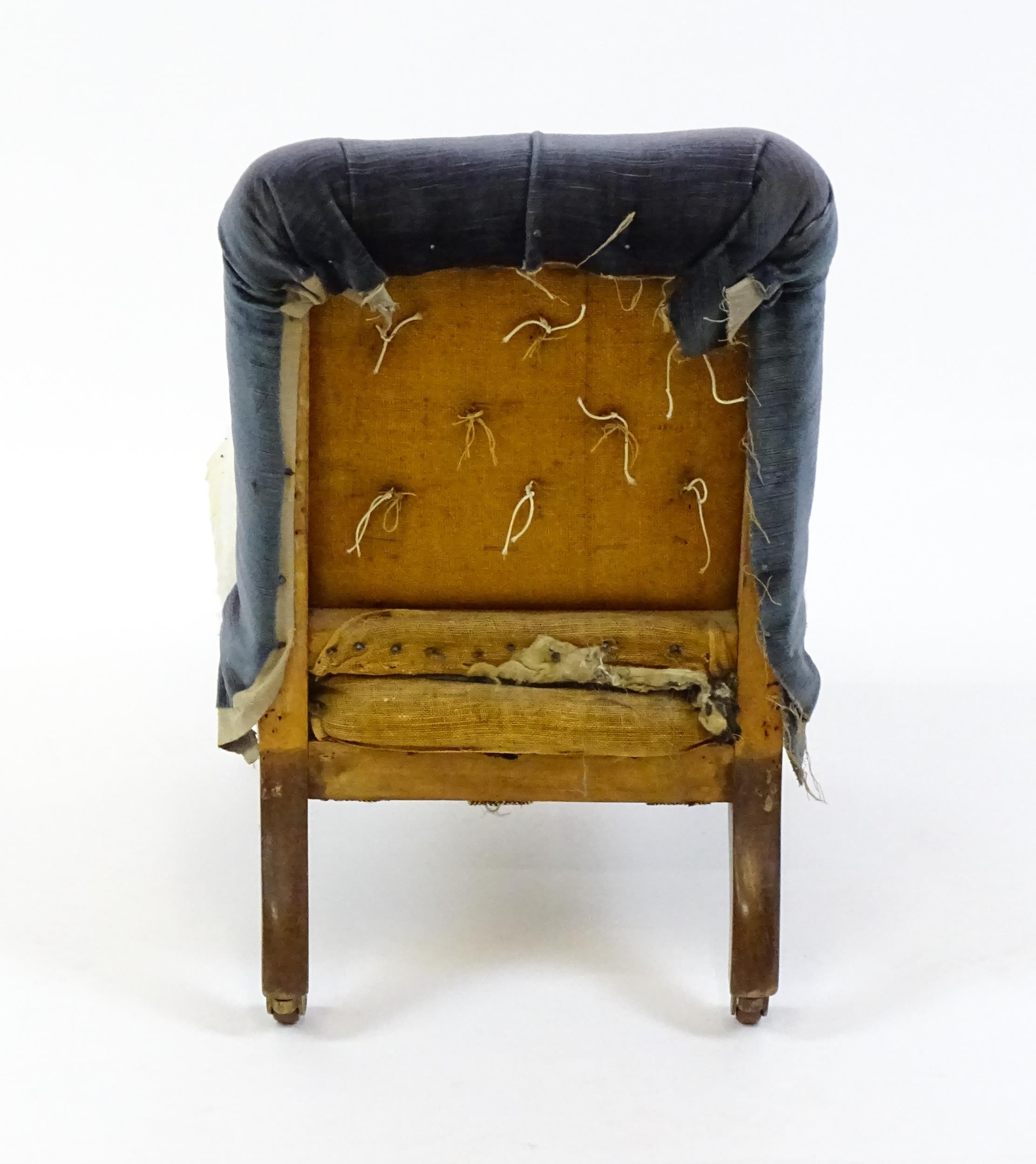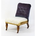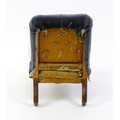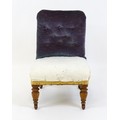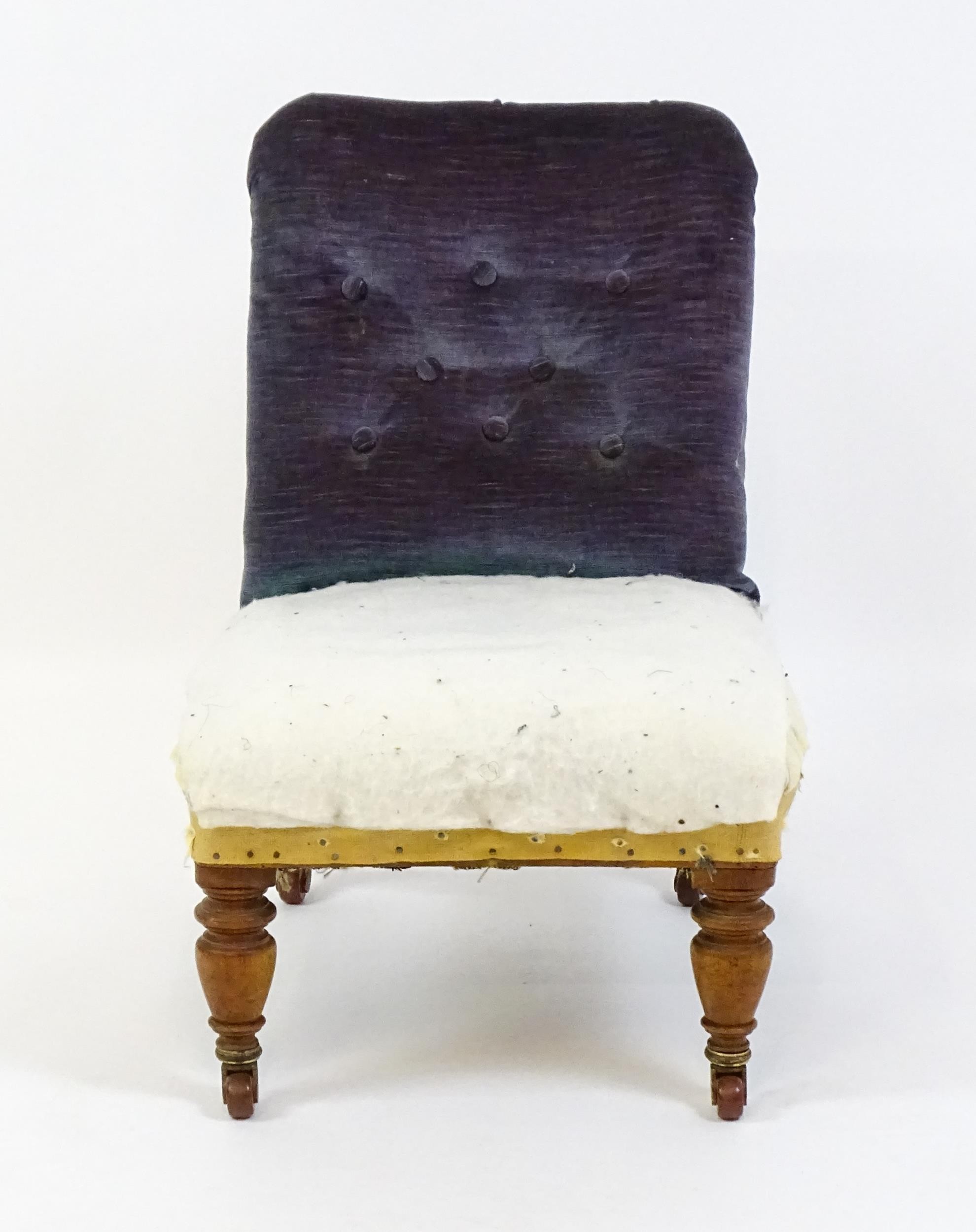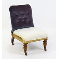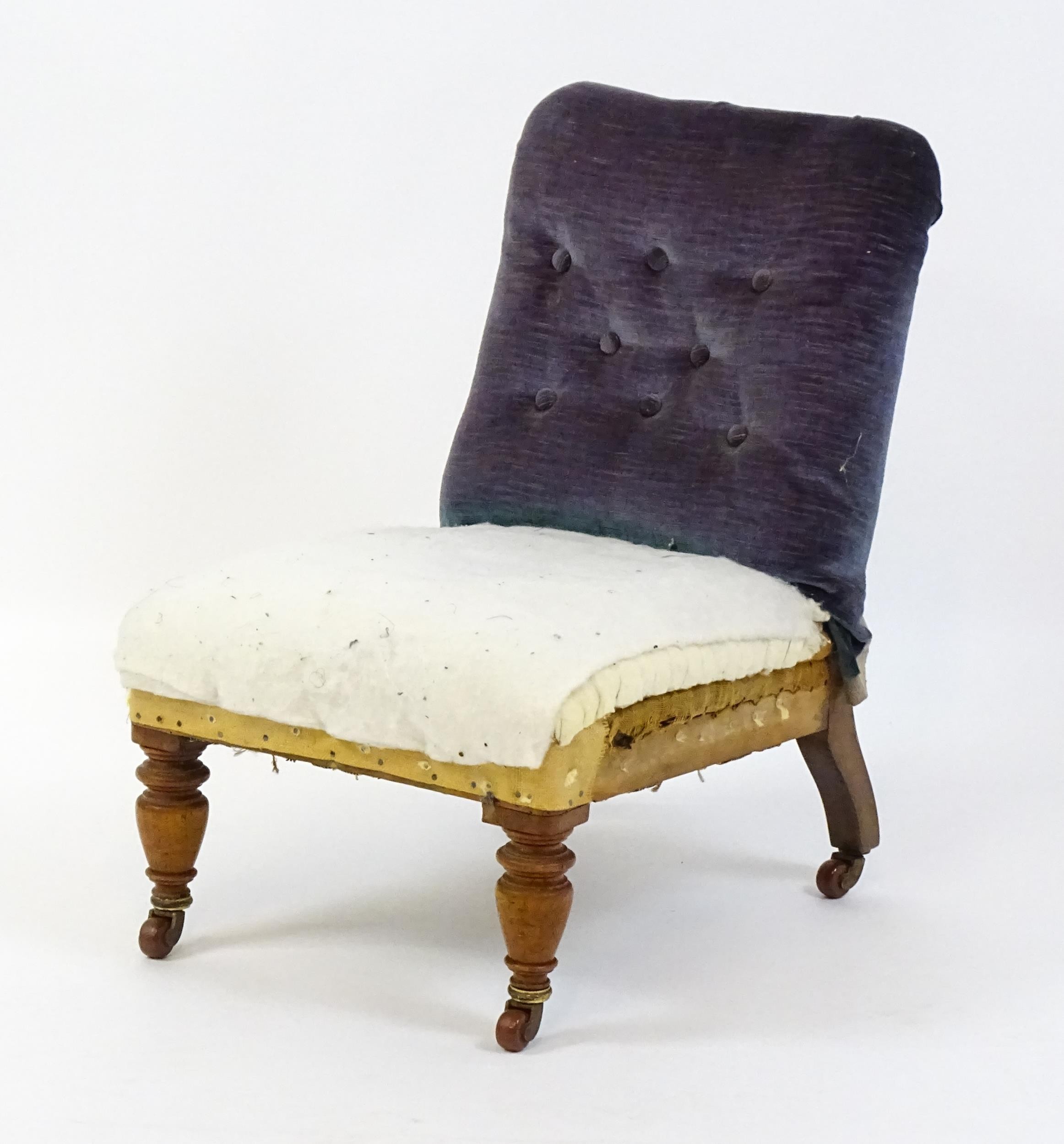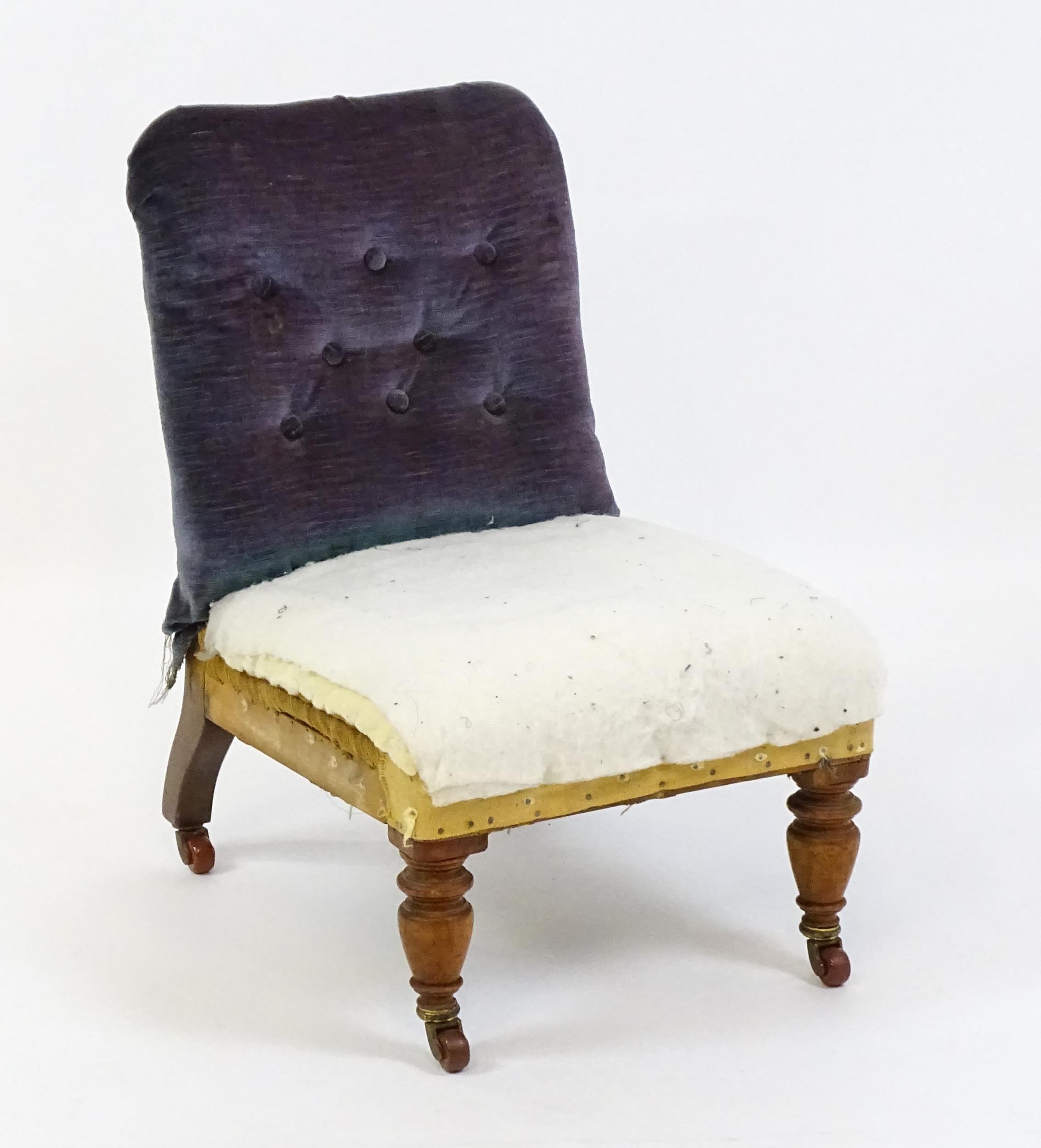 An early 20thC nursing chair with a deep buttoned backrest and sprung seat raised on turned tapering front legs terminating in porcelain castors. 19" wide x 23" deep x 26" high.