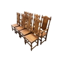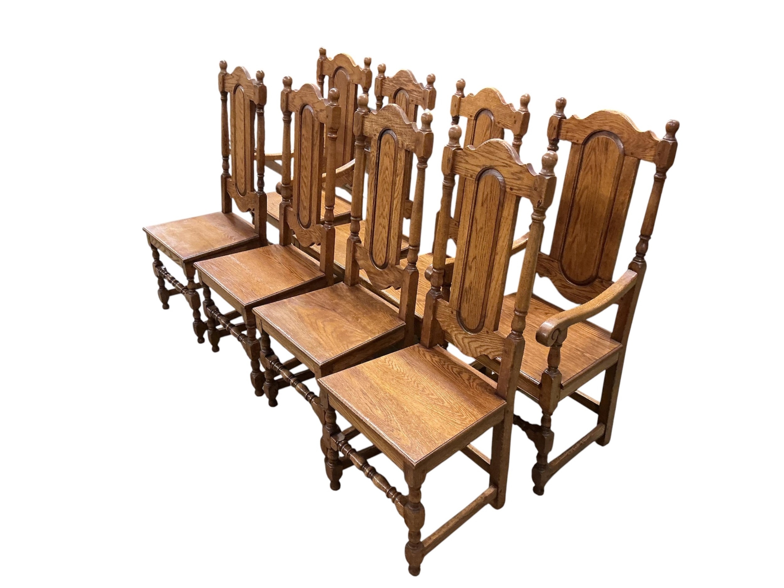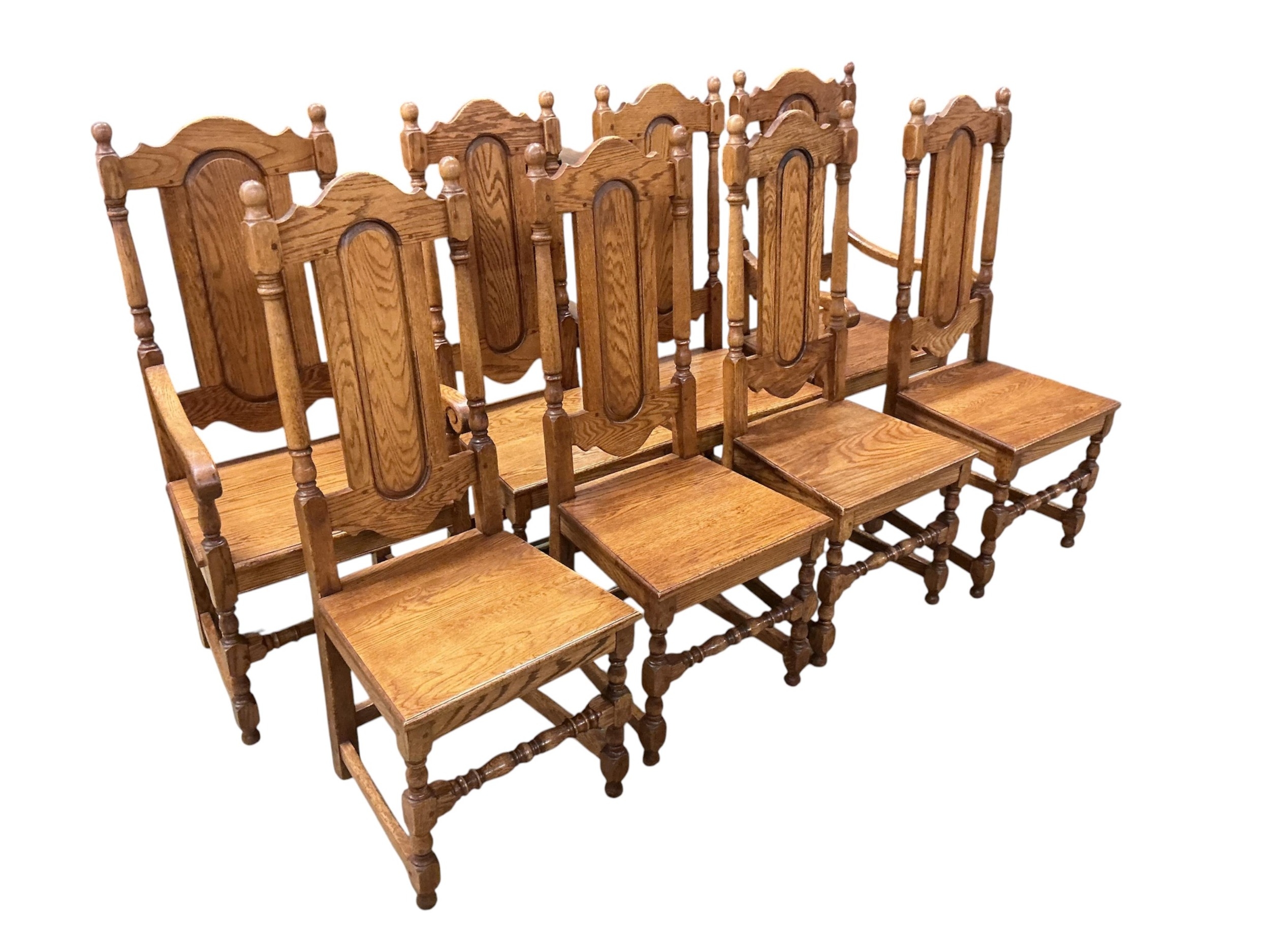 A set of eight 18th century style panelled oak dining chairs, two with arms, largest width 55cm, depth 51cm, height 120cm