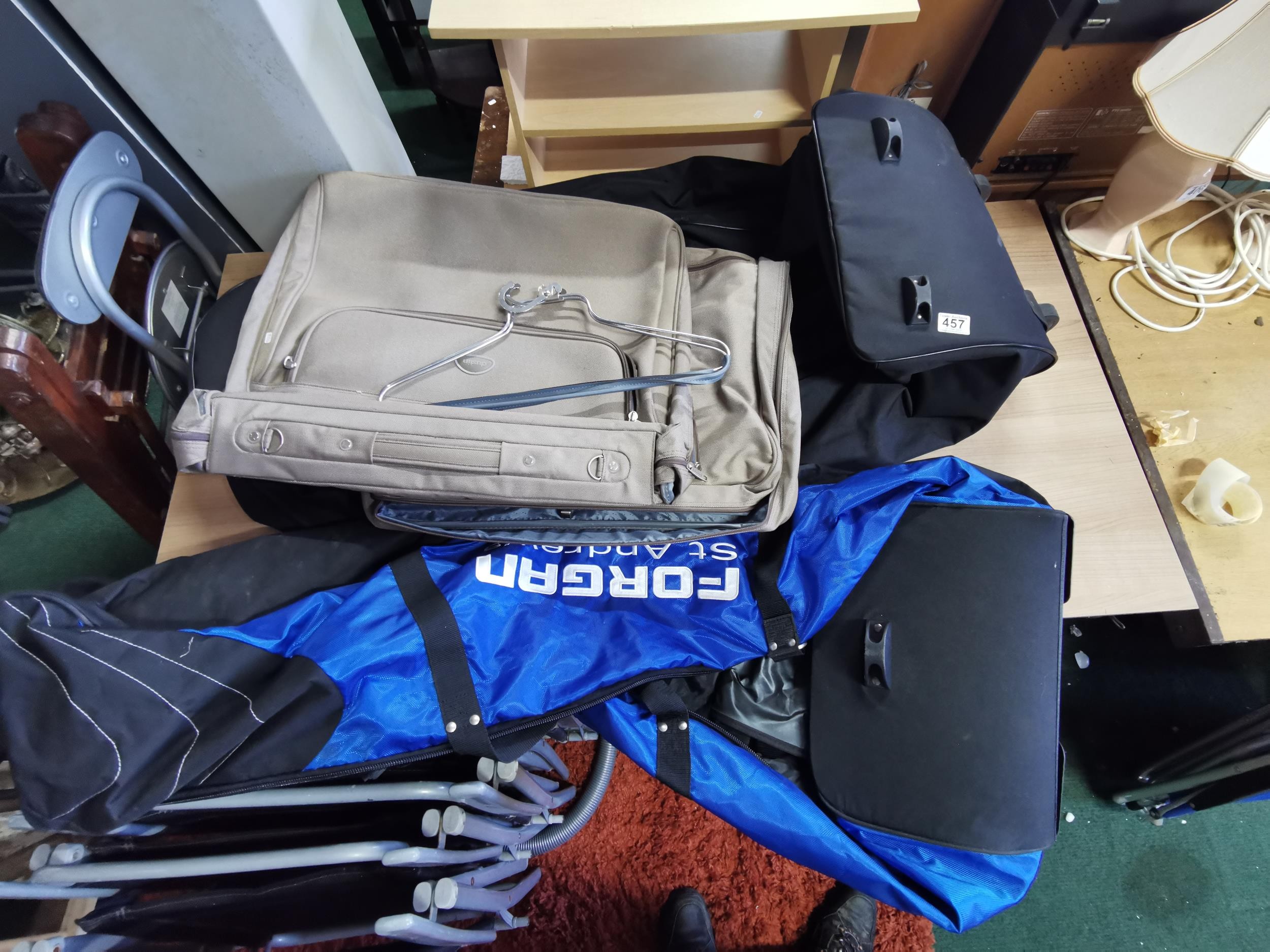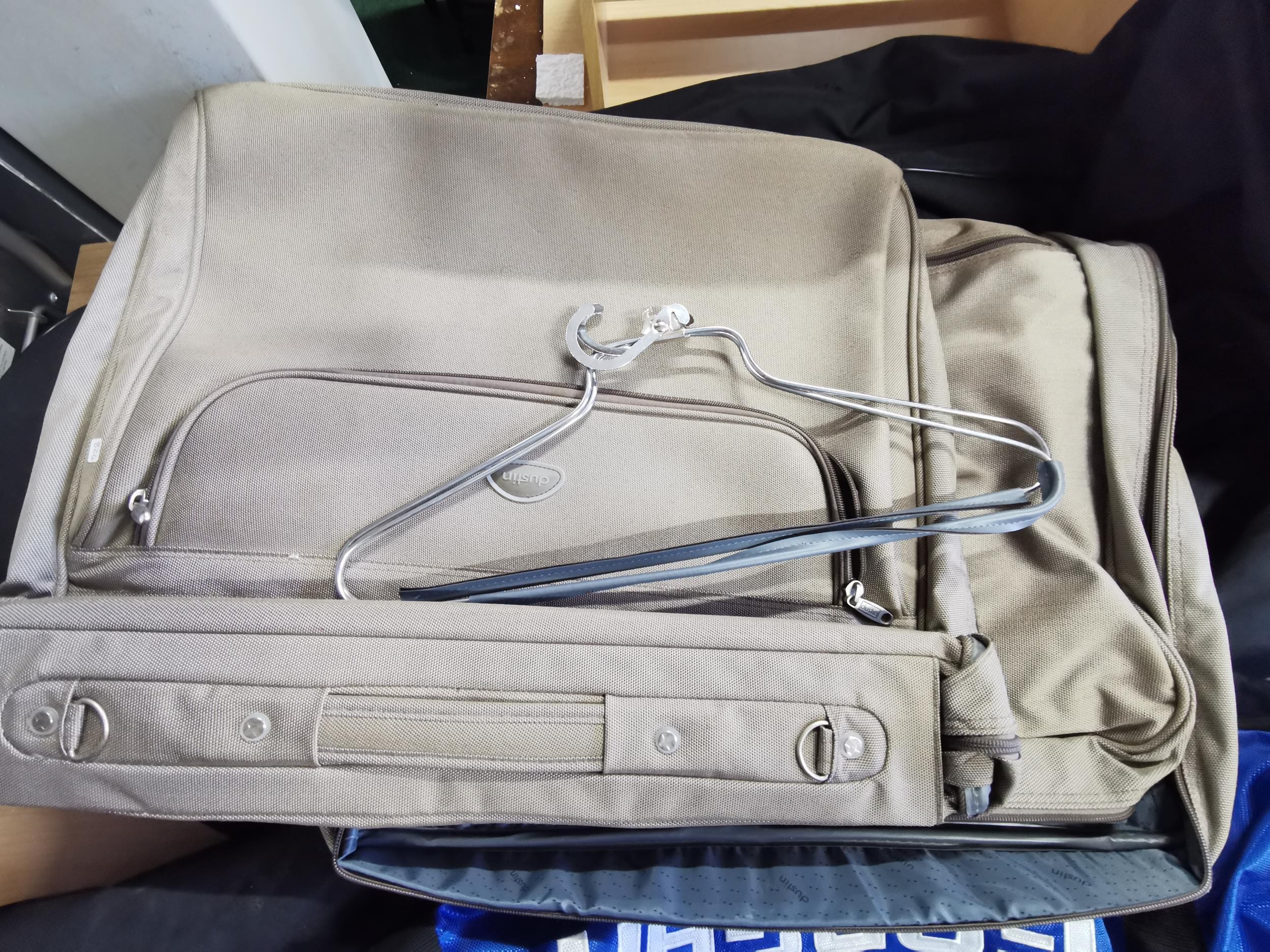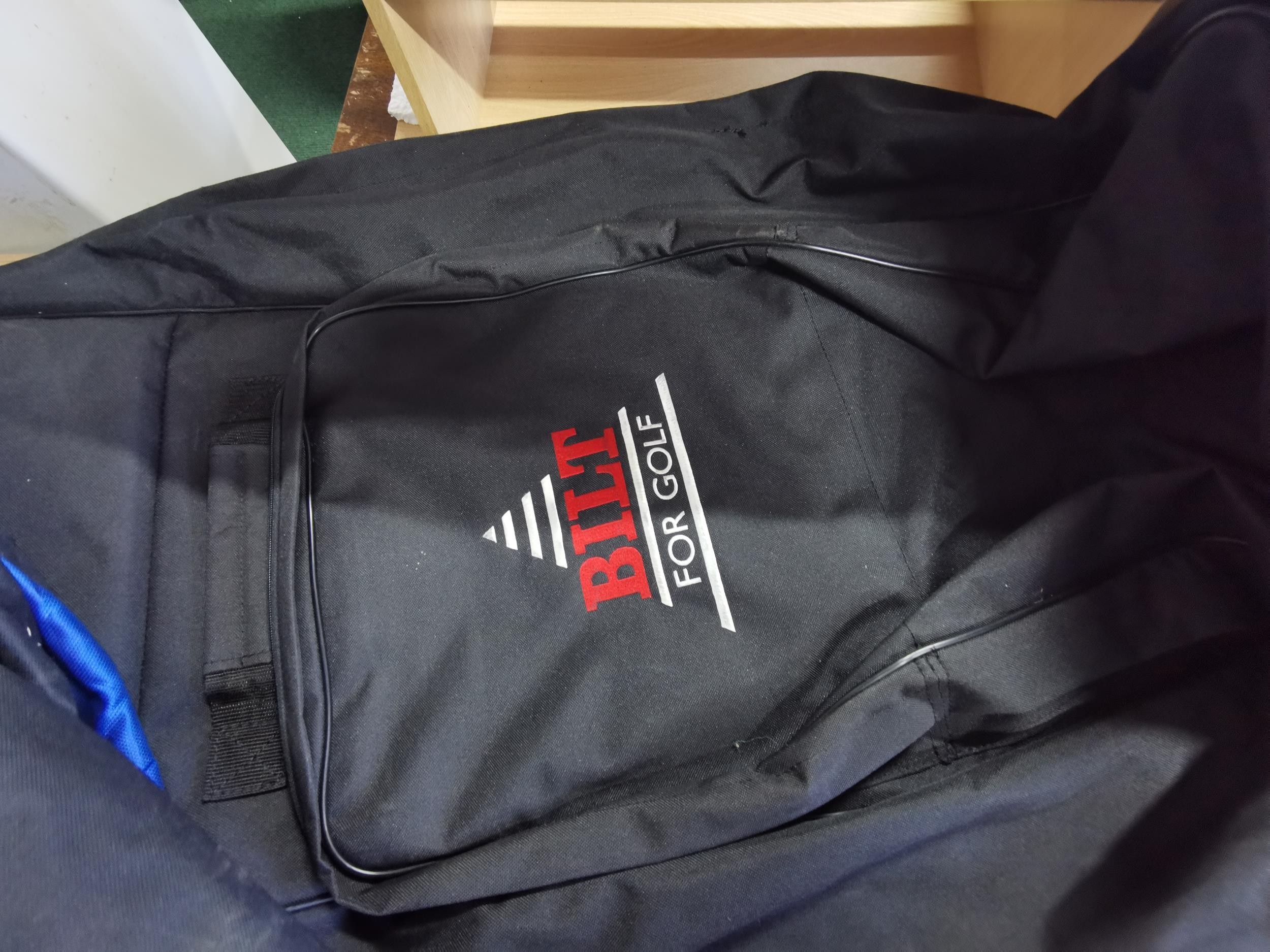 2x waterproof golf bag covers with wheels inserted, one by Forgan St. Andrews along with a pair of Dustin suit bags