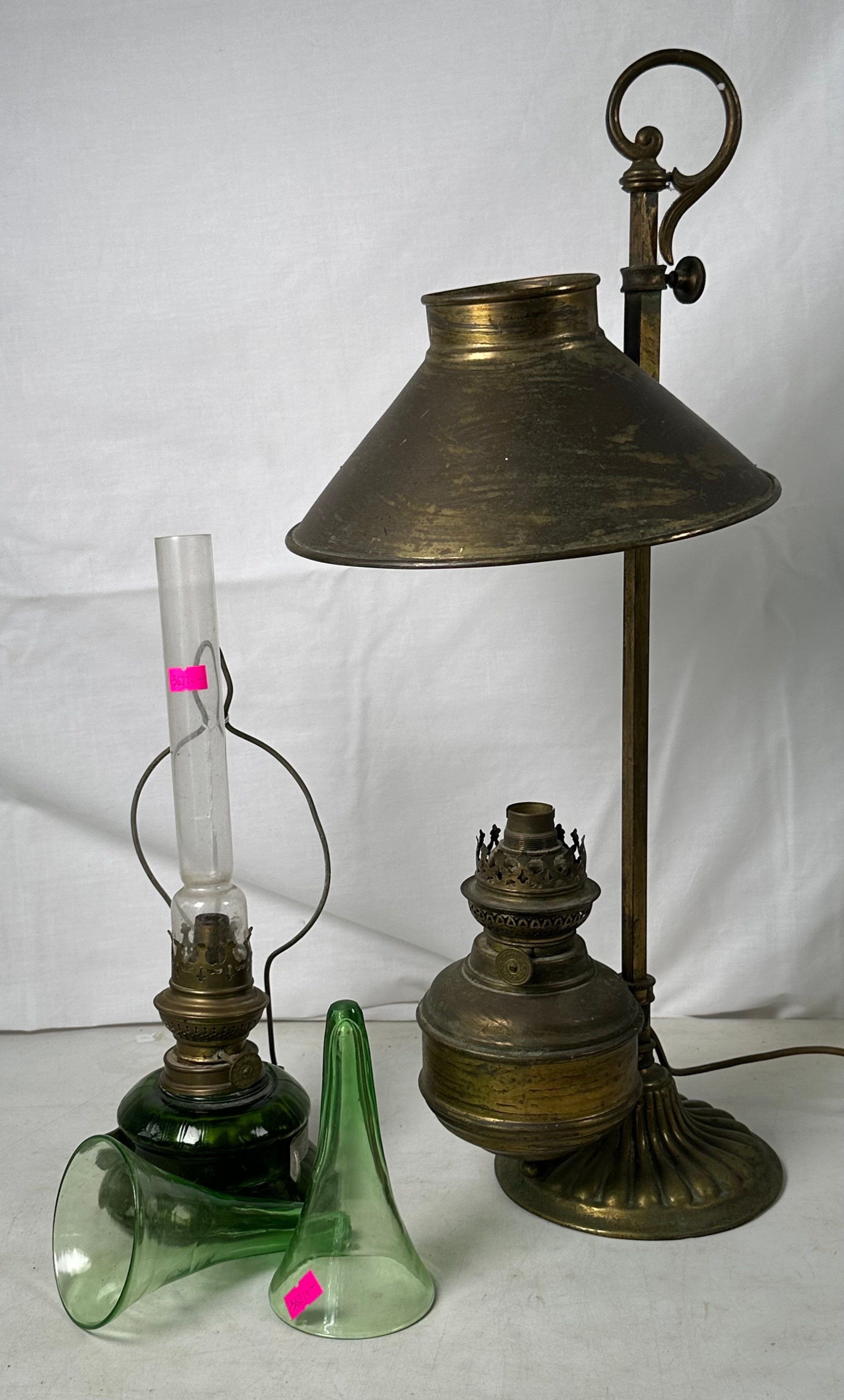 Brass adjustable oil lamp converted to electric, two glass epernes and a green glass oil lamp with hanging bracket