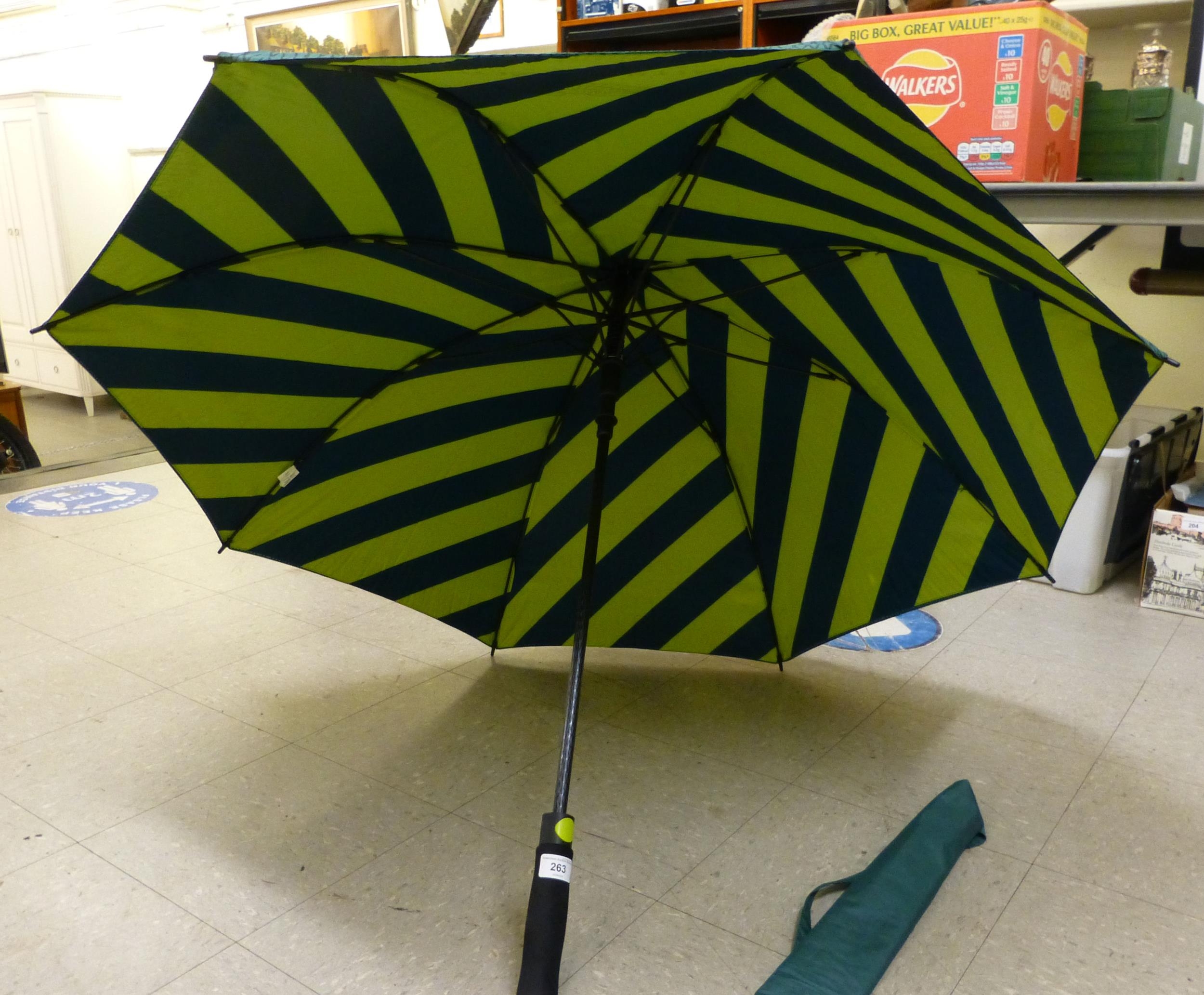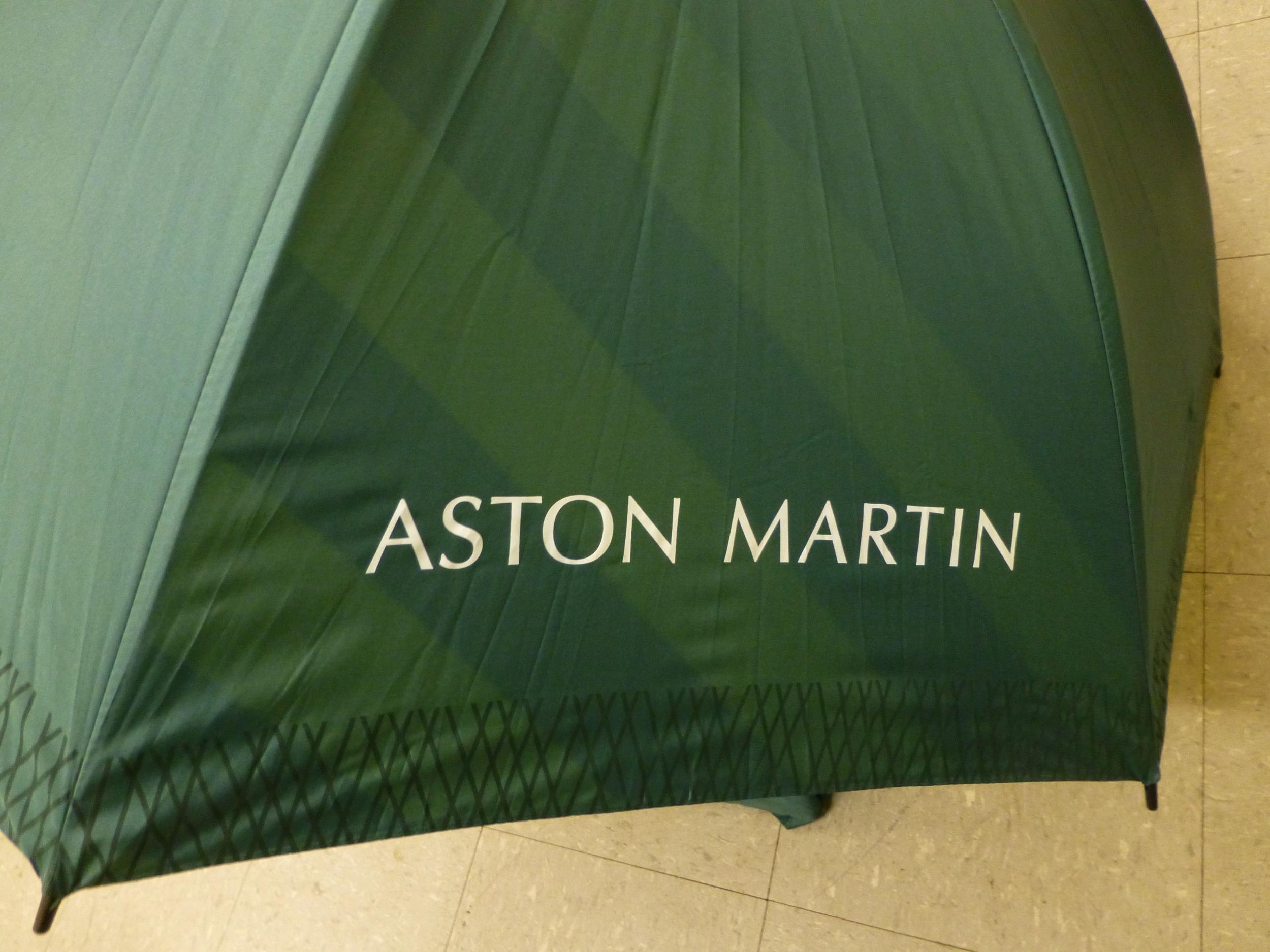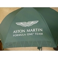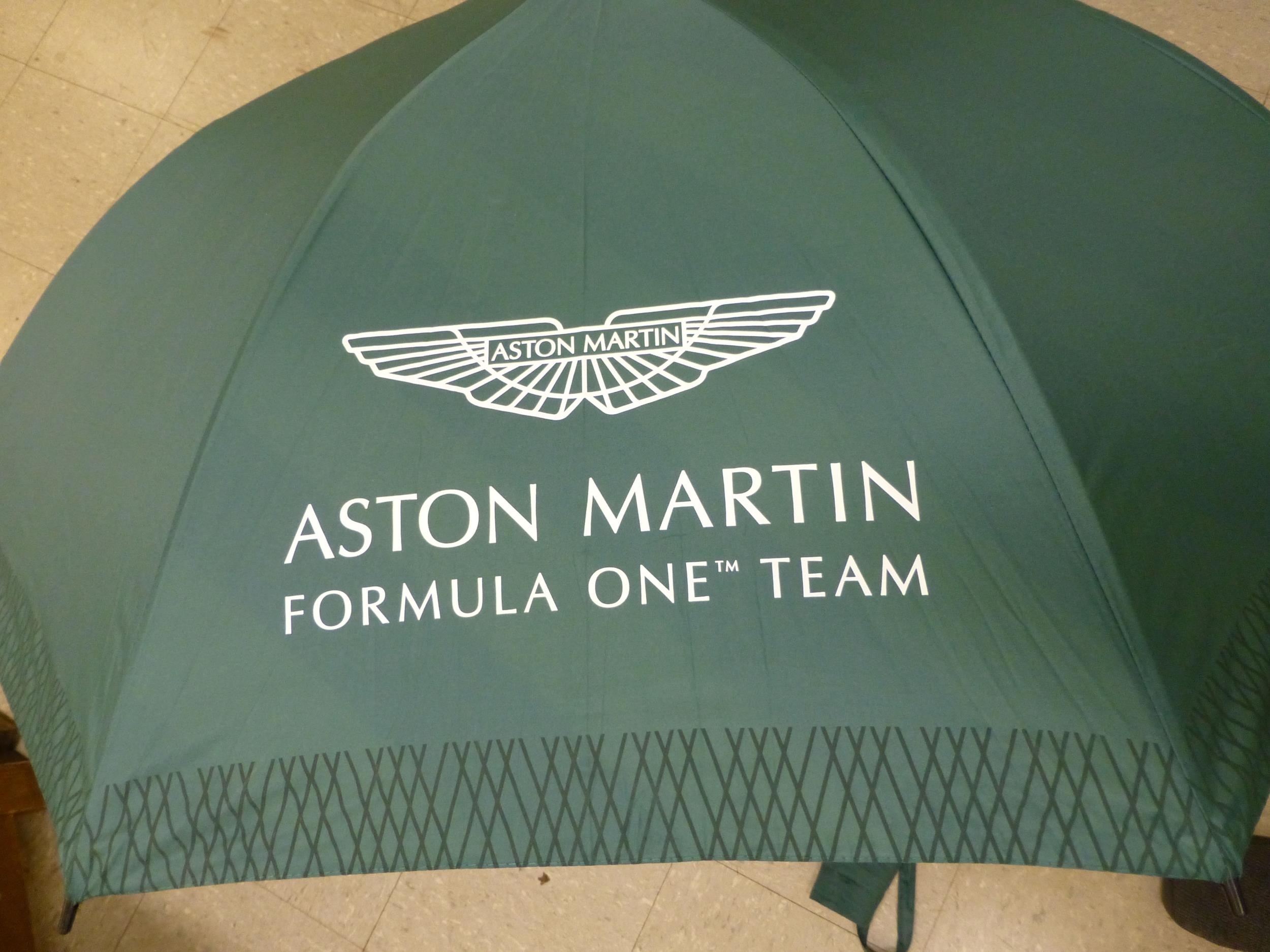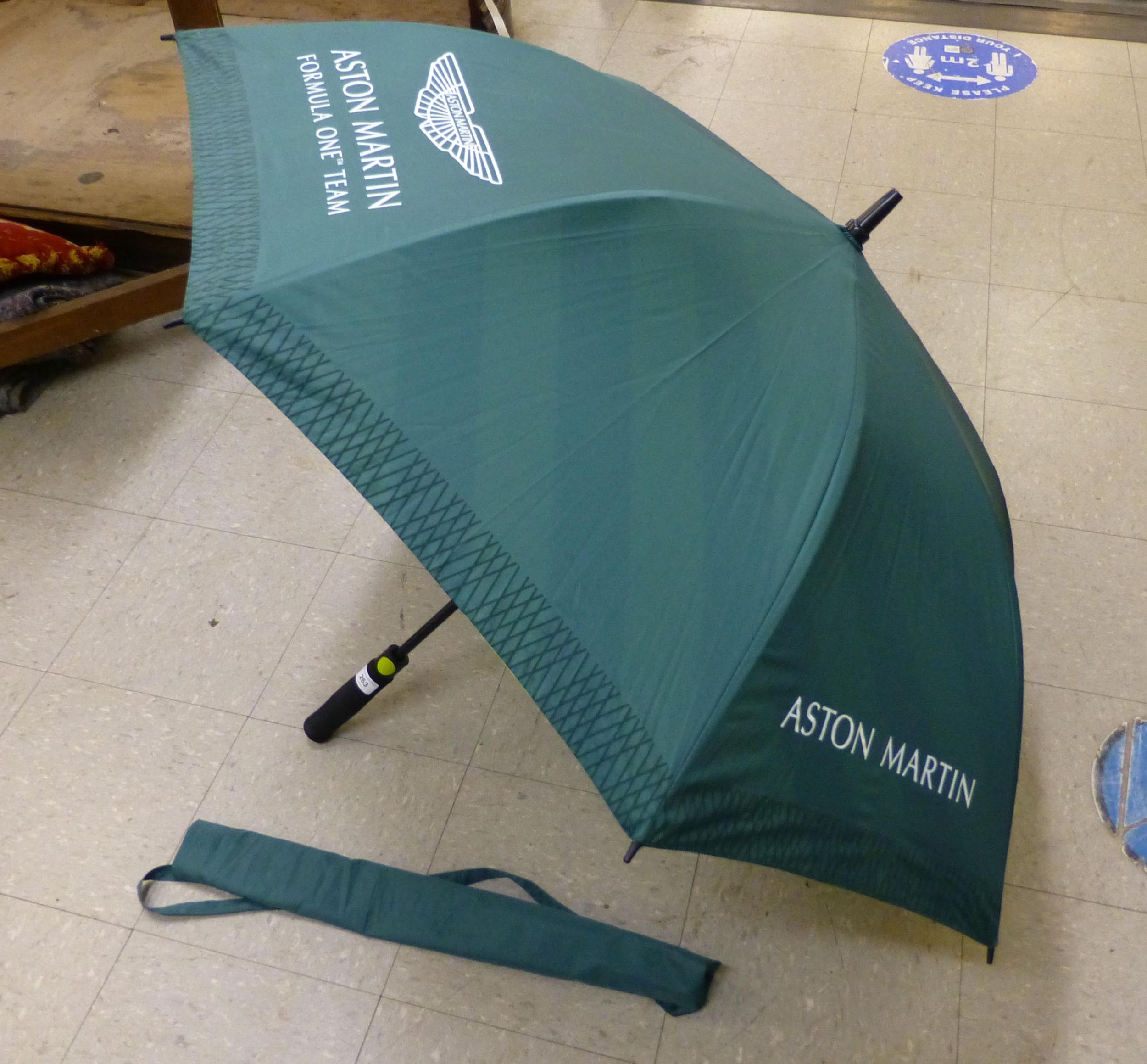 An umbrella inscribed for Aston Martin Formula One Team with protective cover