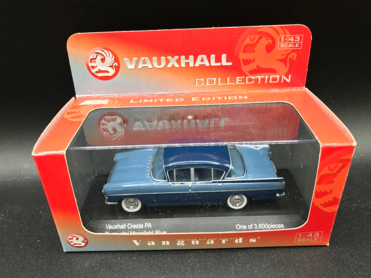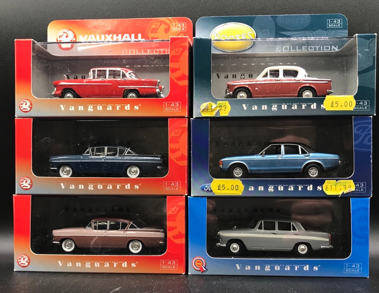 6 Lledo Vanguards 1:43 Scale Cars, Undisturbed from plinths, Including VA 06400 Vauxhall Cresta PA Dusk Rose & Lilac Haze (Case cracked), VA 06407 Vauxhall Cresta PA Bermuda Moonlight Blue, Vauxhall Victor F Series Gypsy Red, VA 06800 Hillman Minx Ember Red & Cream, VA 04400 Austin Cambridge Cumulus Grey & White, VA 05209 Ford Granada Ghia Miami Blue - Diecast Excellent, Boxes Good (6) 1400g