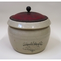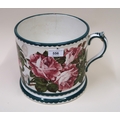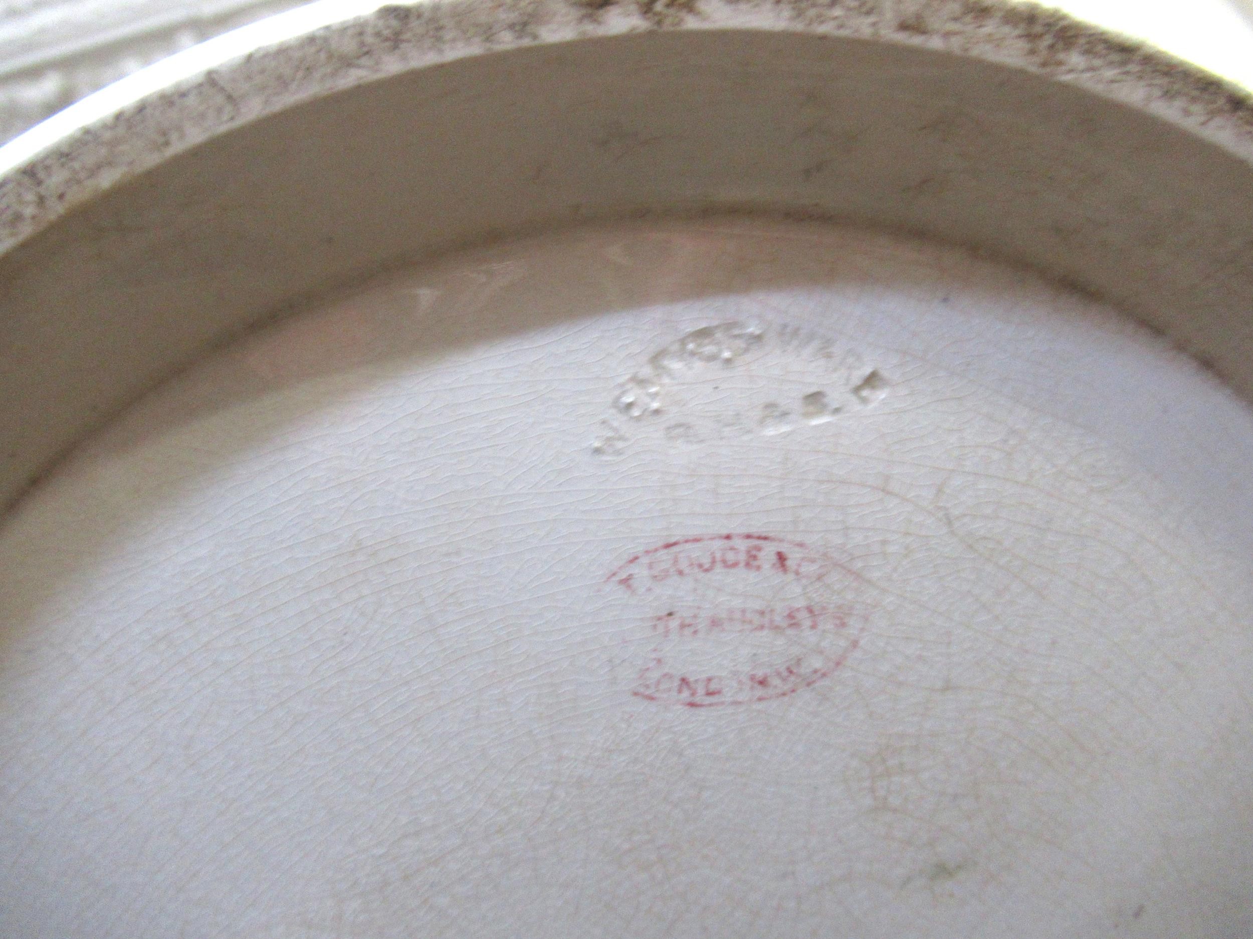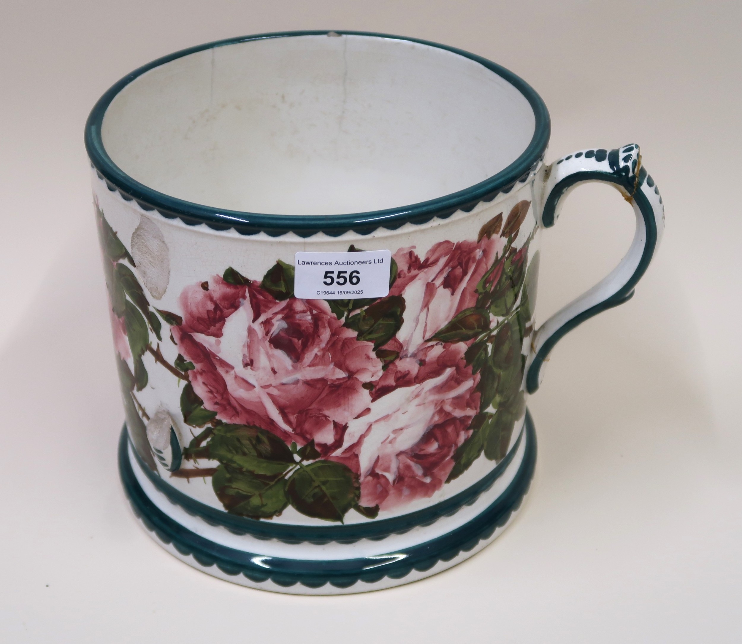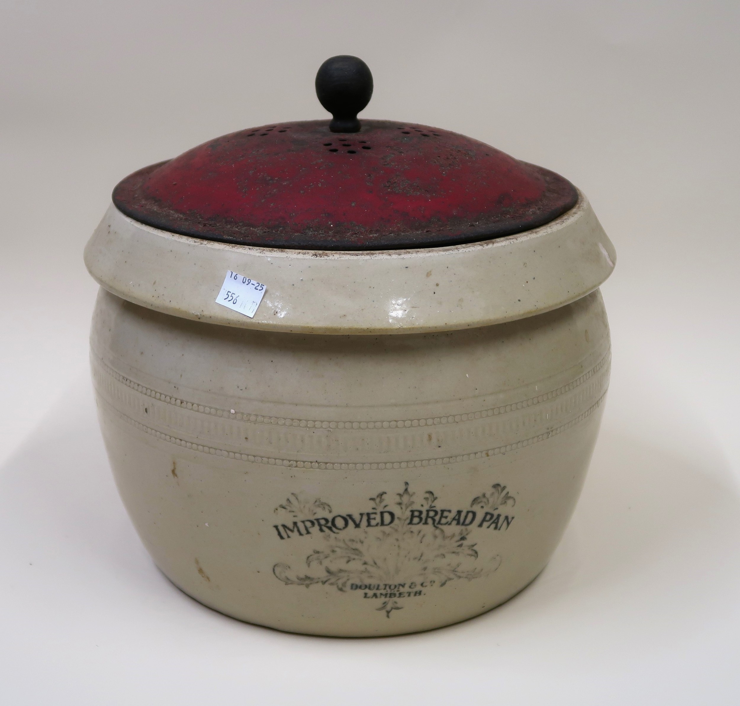 Large Wemyss pottery loving cup painted with roses (extensive damages), 19cm high, together with a Doulton & Company Lambeth stoneware improved bread pan with a metal cover