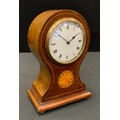 An Edwardian inlaid mahogany balloon timepiece, white dial, bold Roman numerals, manual wind French movement, brass feet, c.1910