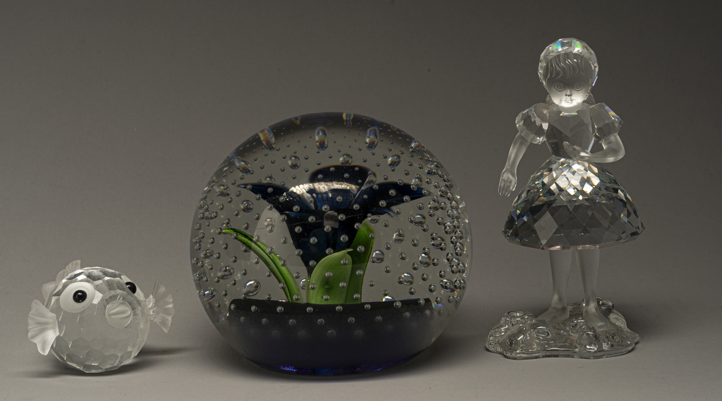 A SWAROVSKI GIRL WITH A BASKET, A FISH AND A CAITHNESS PAPER WEIGHT, BOXED