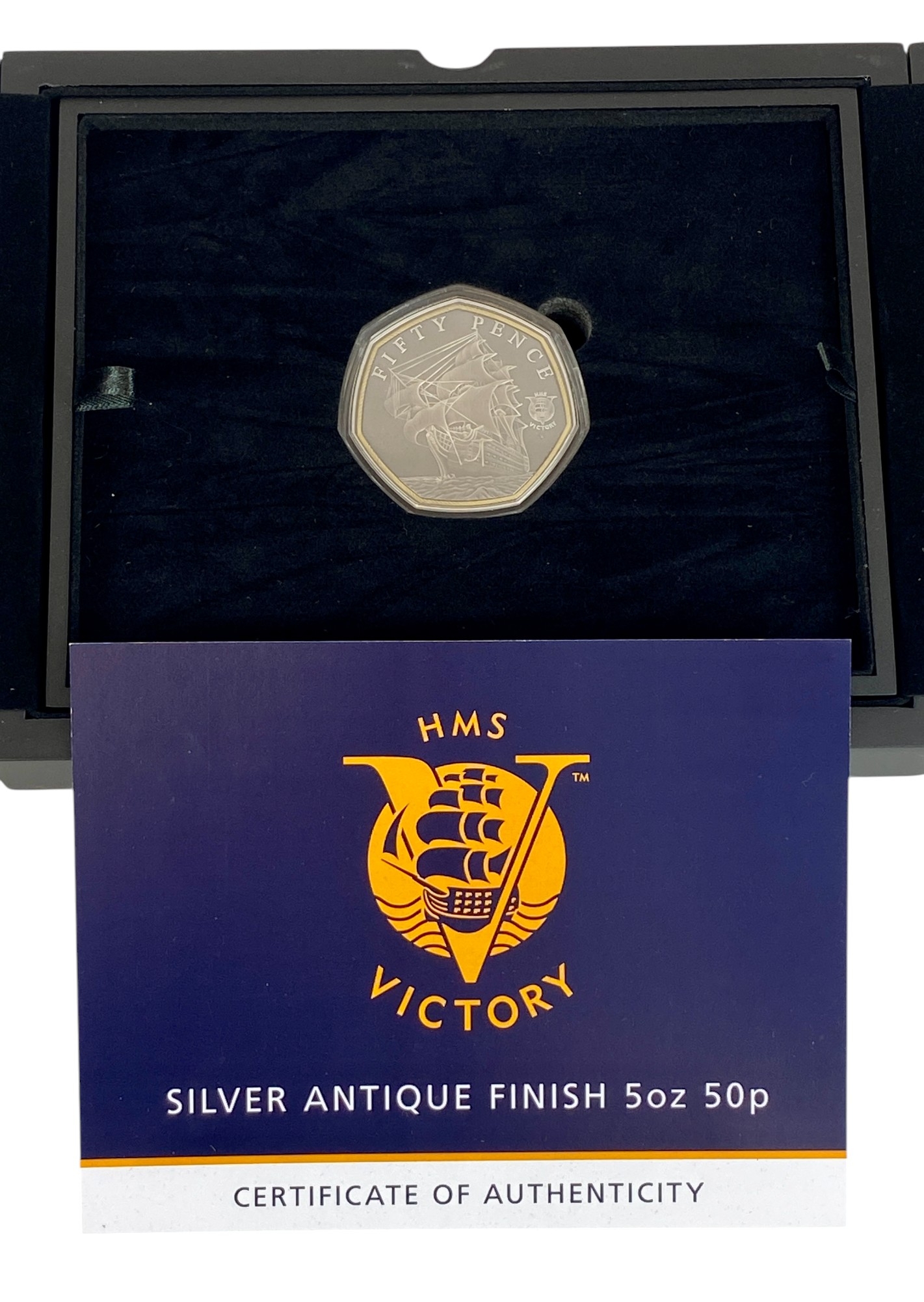 HMS Victory Silver Antique Finish 5 ounce 50 Pence Coin, Cased with Certificate of