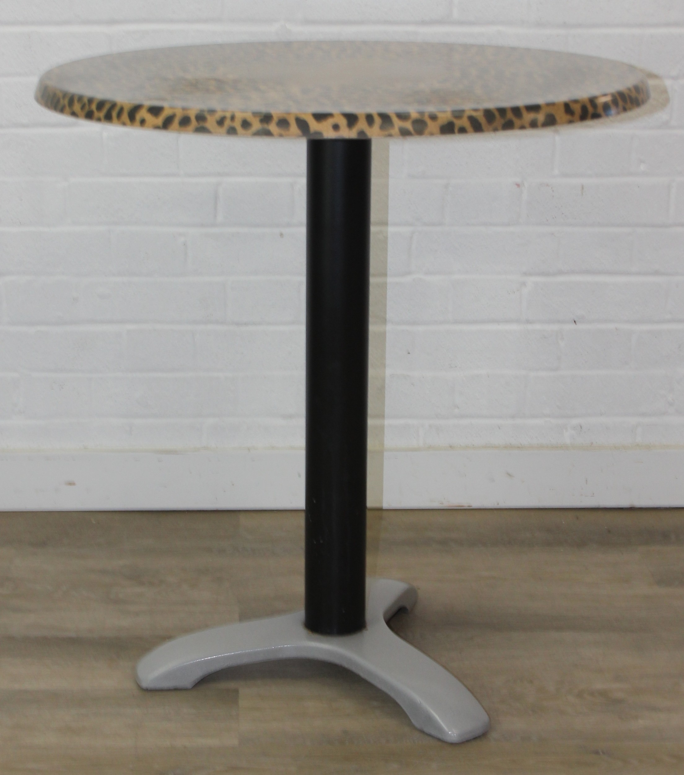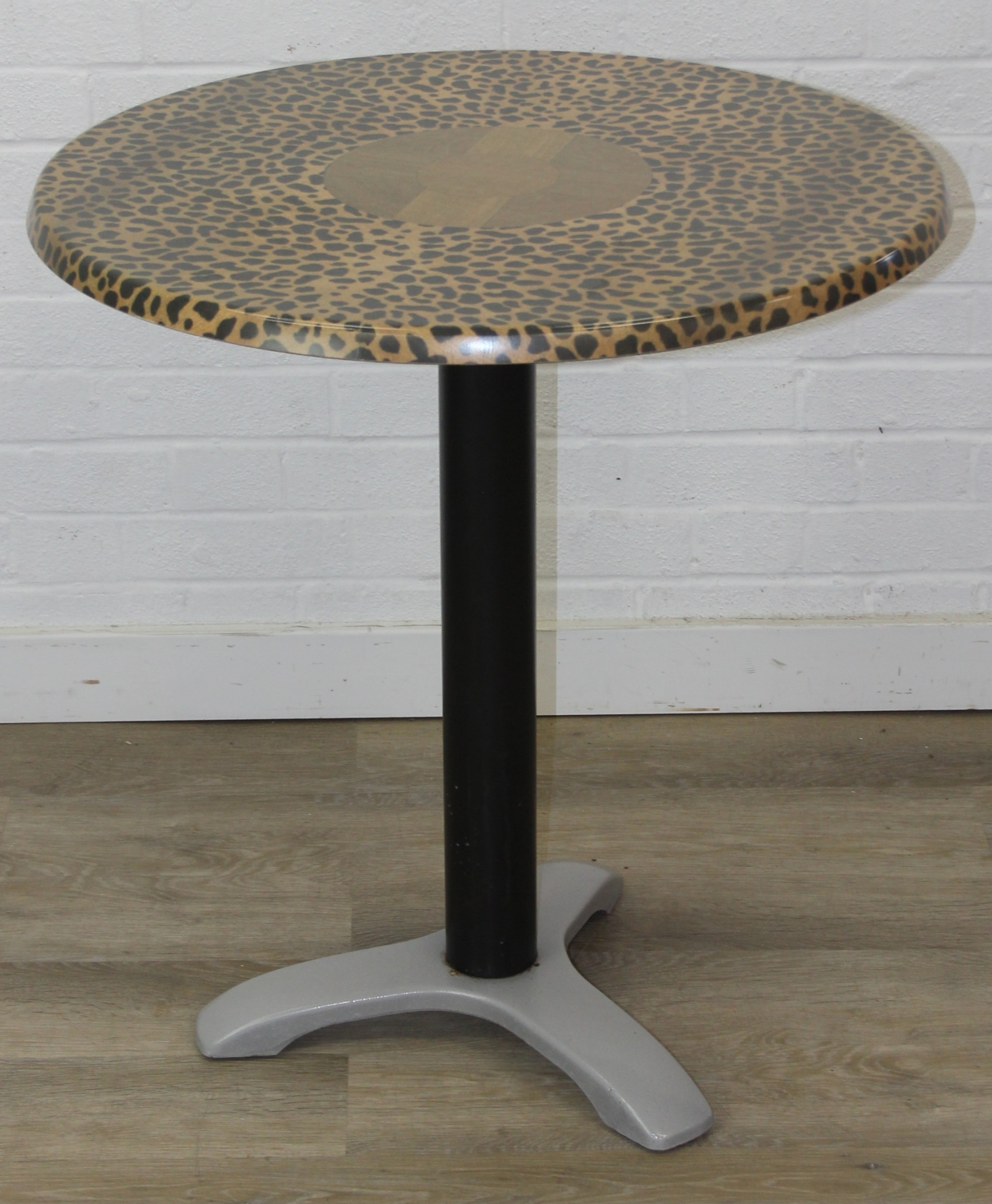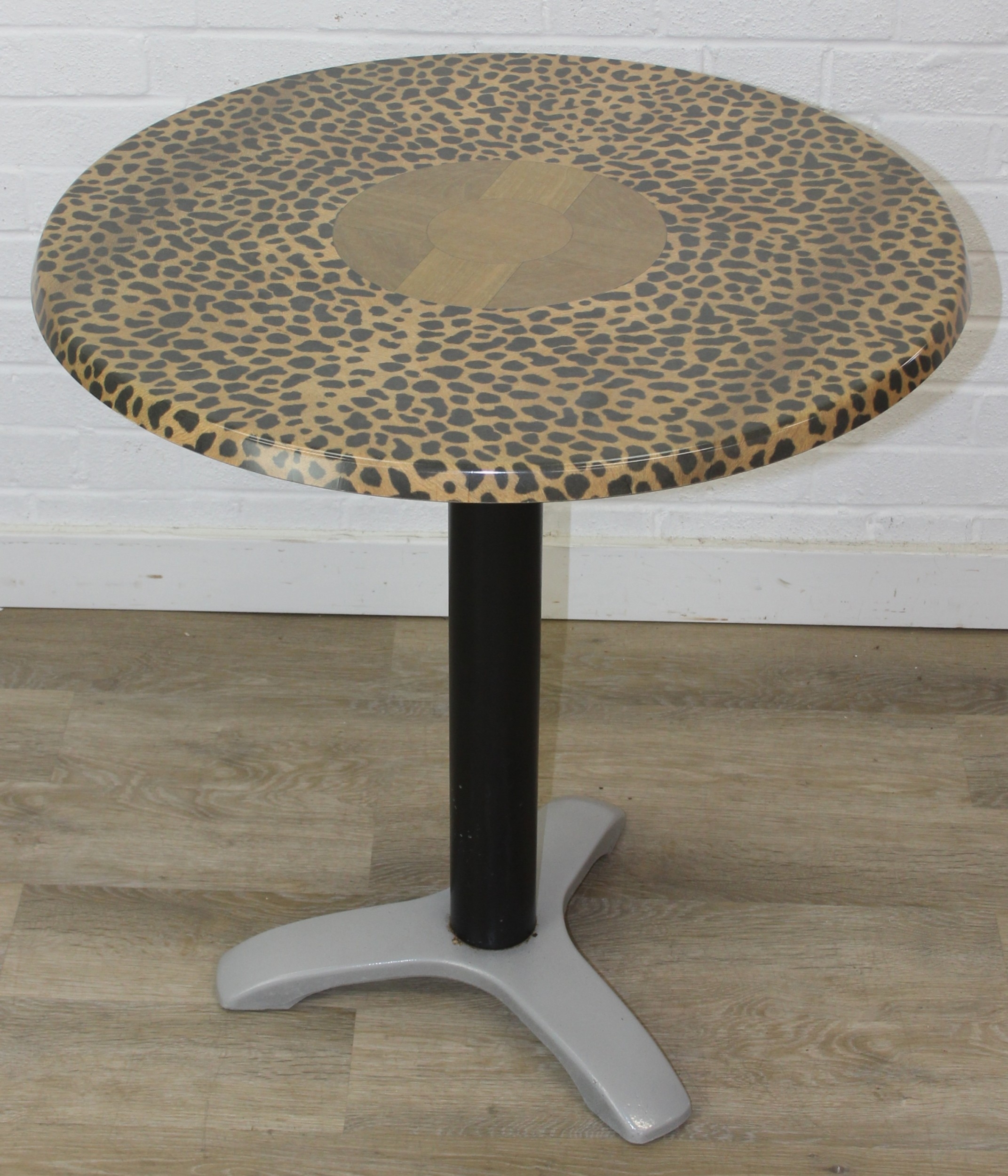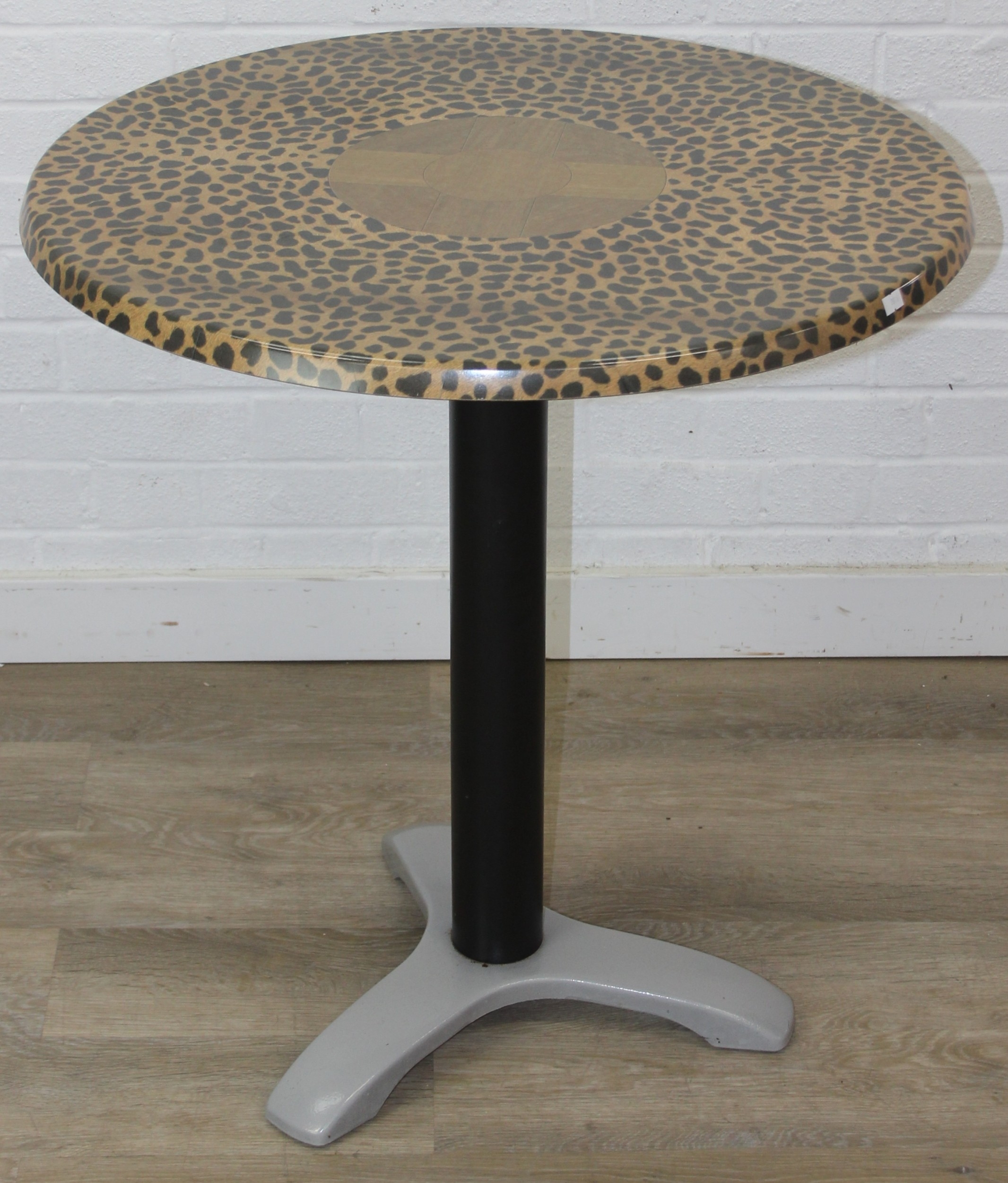 An unusual bistro table with metal base, the table top with cheetah print design, the top by SM France, 70cm in diameter x 75cm tall
