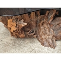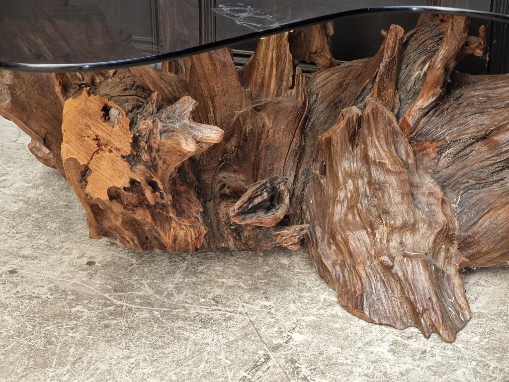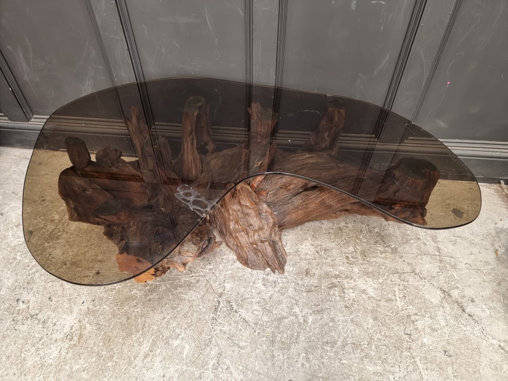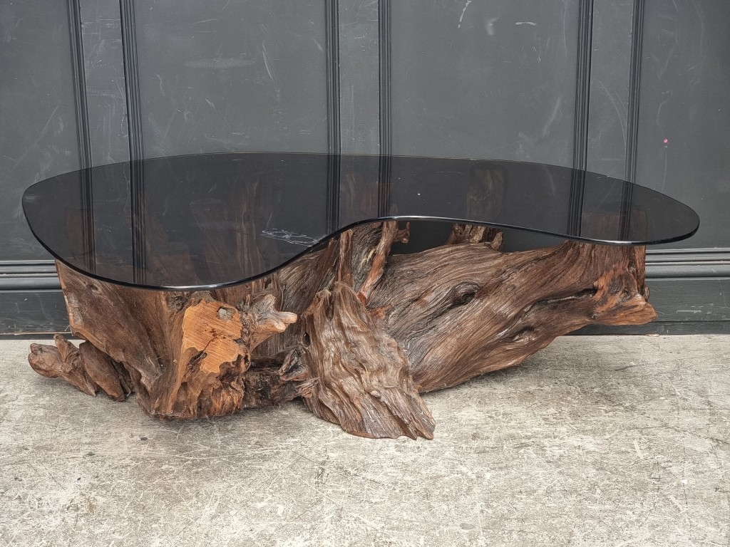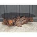 A large root wood and smoked glass top coffee table, 142.5cm wide.
