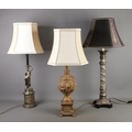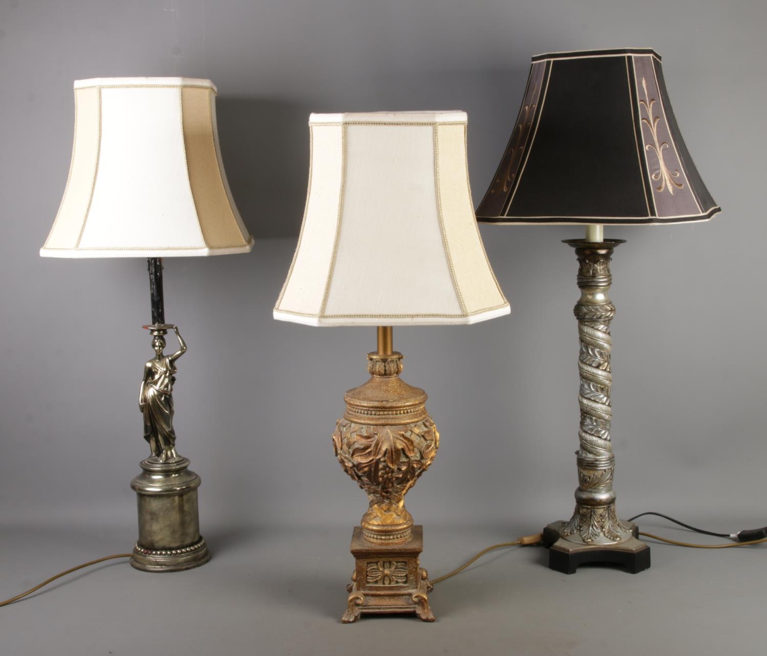 Three table lamps, to include a figural example depicting a lady in a robe holding a tray aloft and another featuring a twisted foliate column.