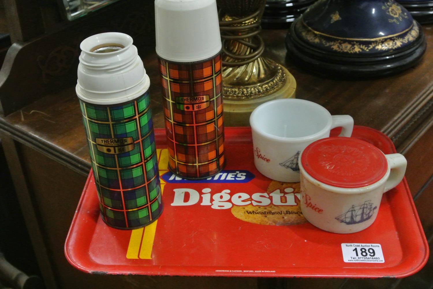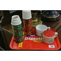 A Small Tray of Collectibles to include Thermos Flasks