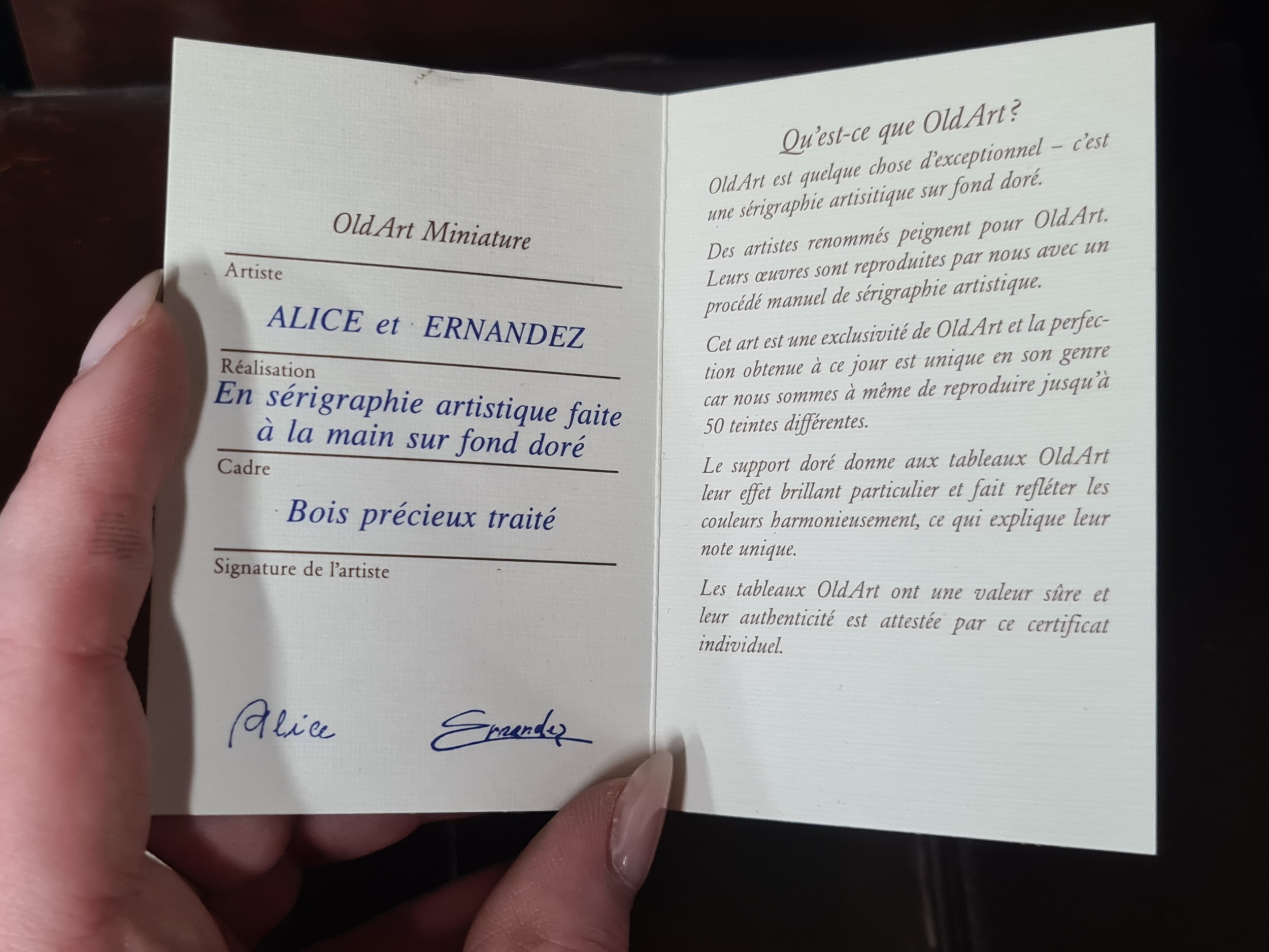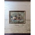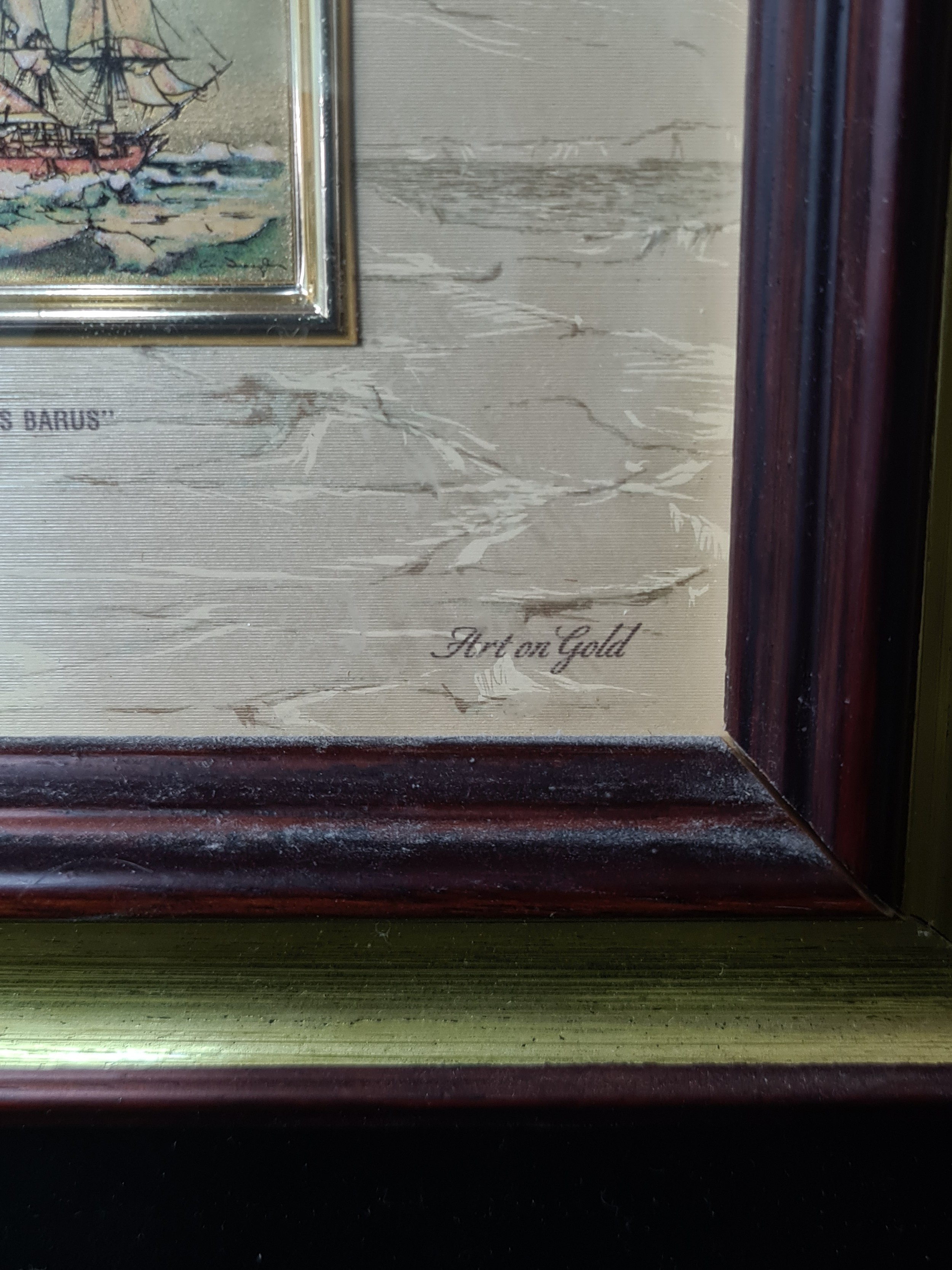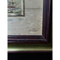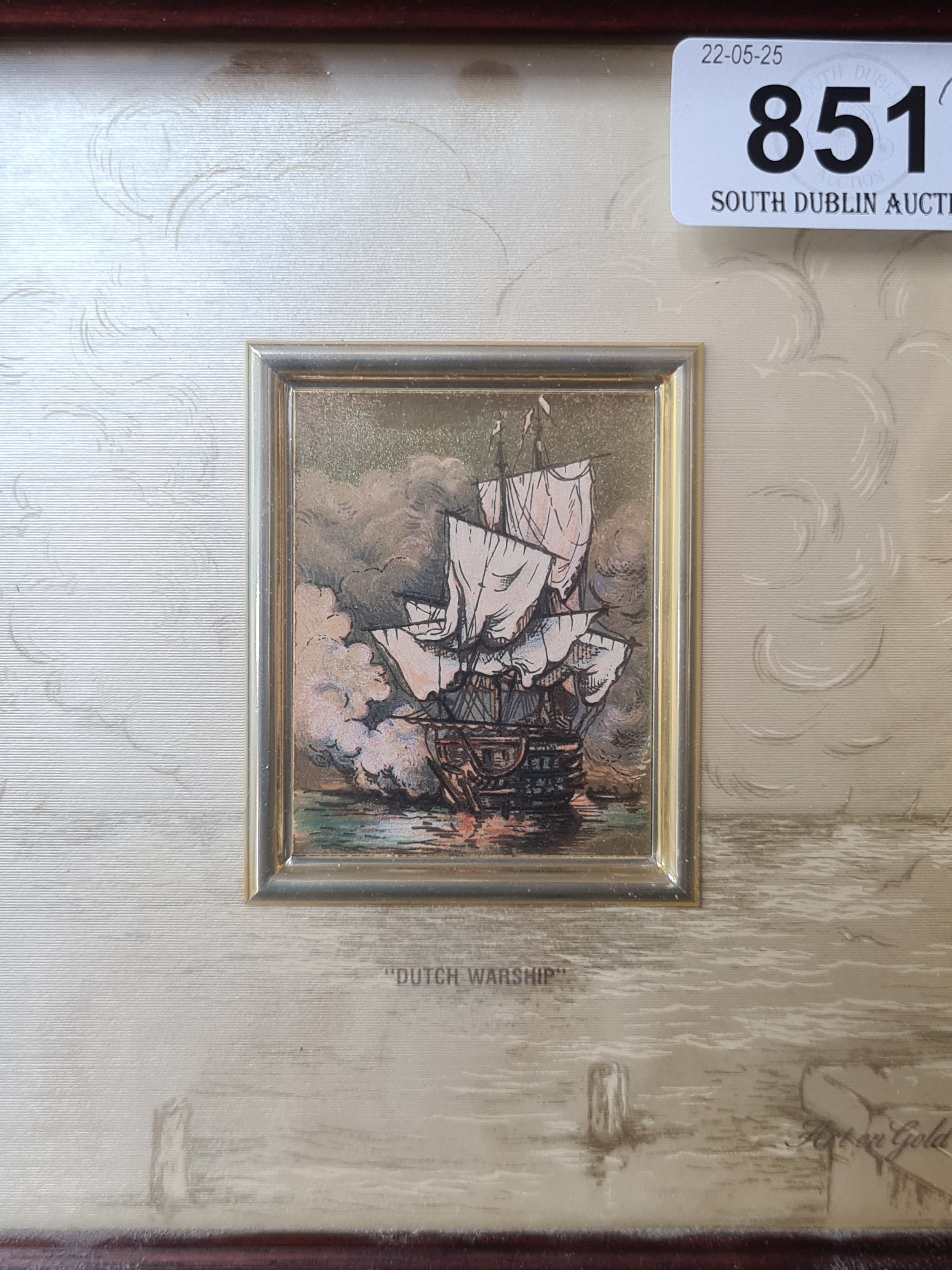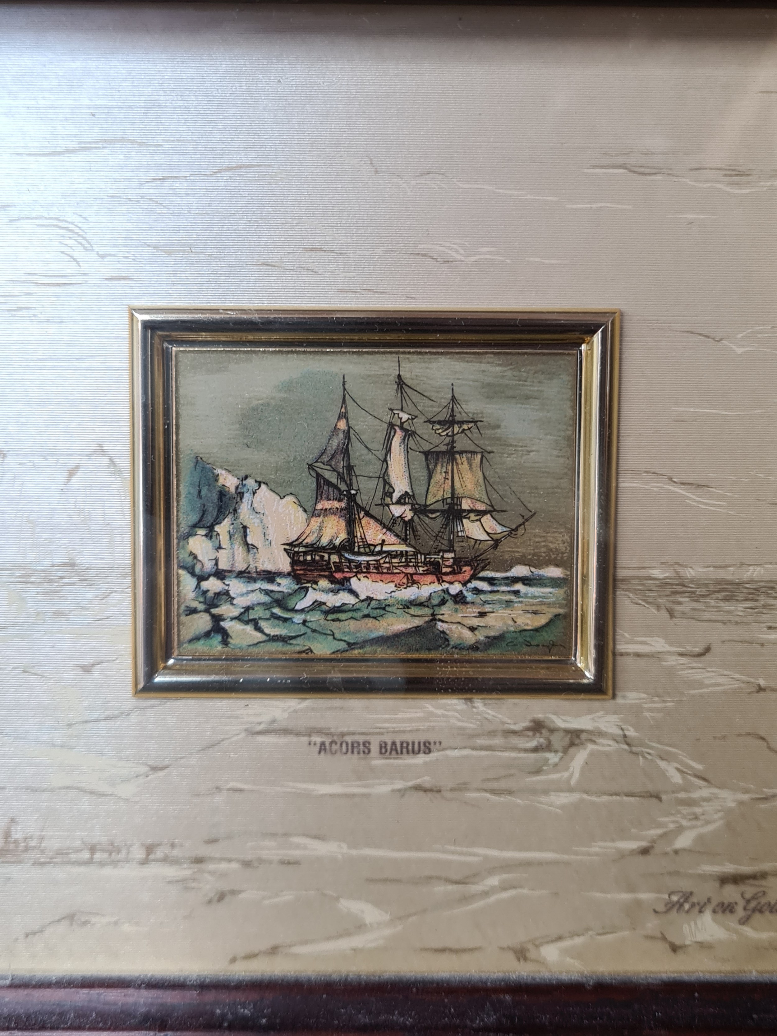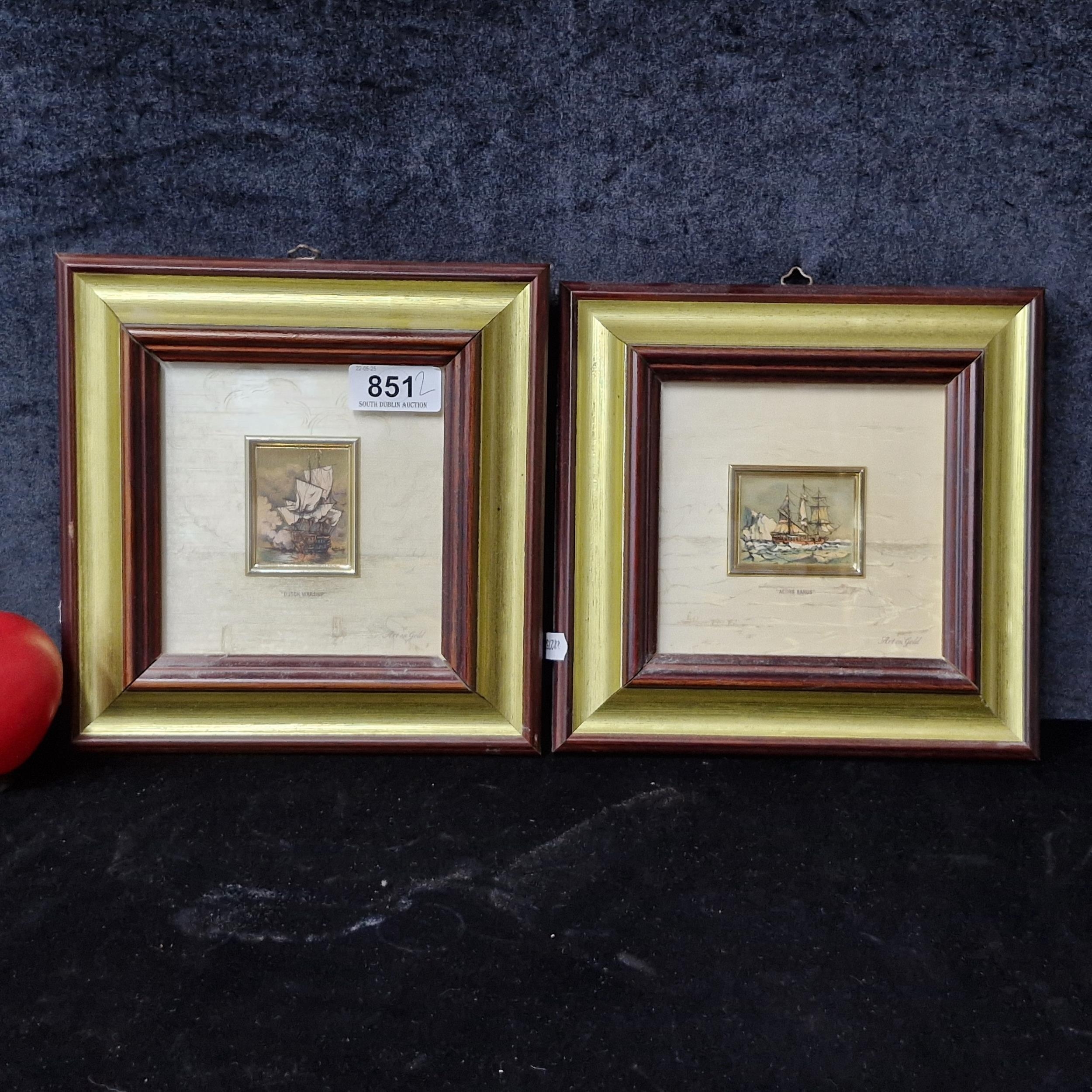 Star Lot: A wonderful pair of 'Alice et Ernandez' handmade artistic silkscreen printing on gold background titled 'Acors Barus' and 'Dutch Warship'. Features nautical scenes. Signed to each with Certificate of authenticity to verso. Housed in matching wooden gilt frames behind glass.