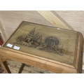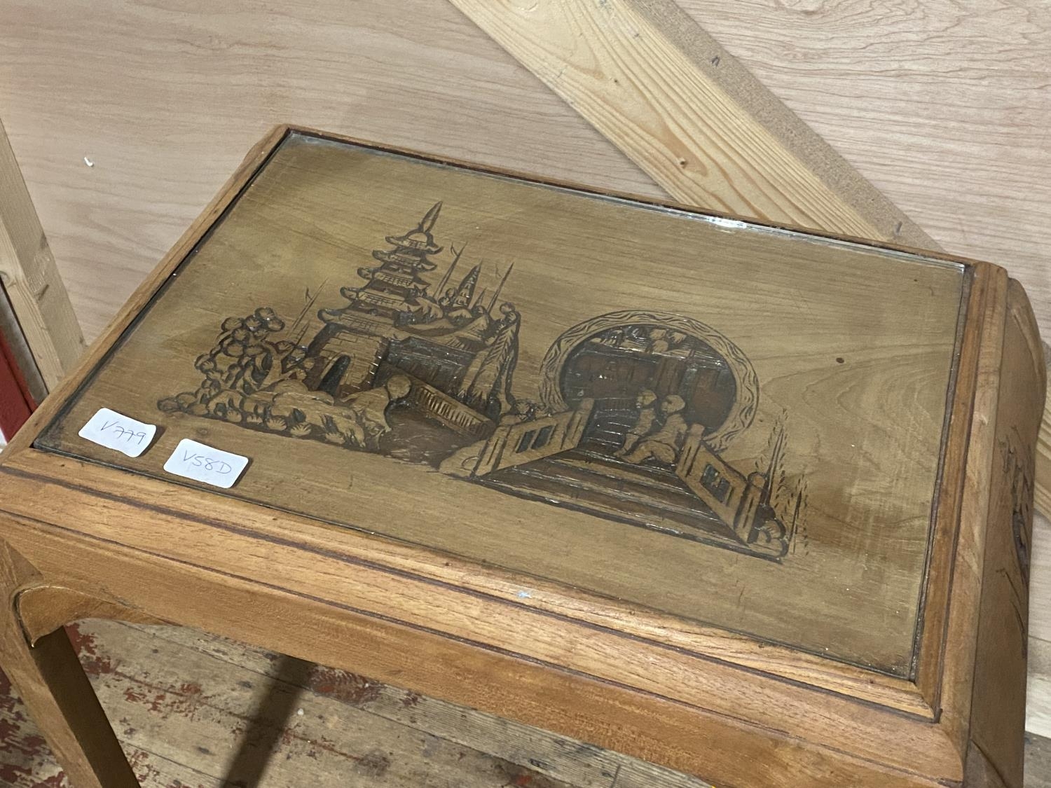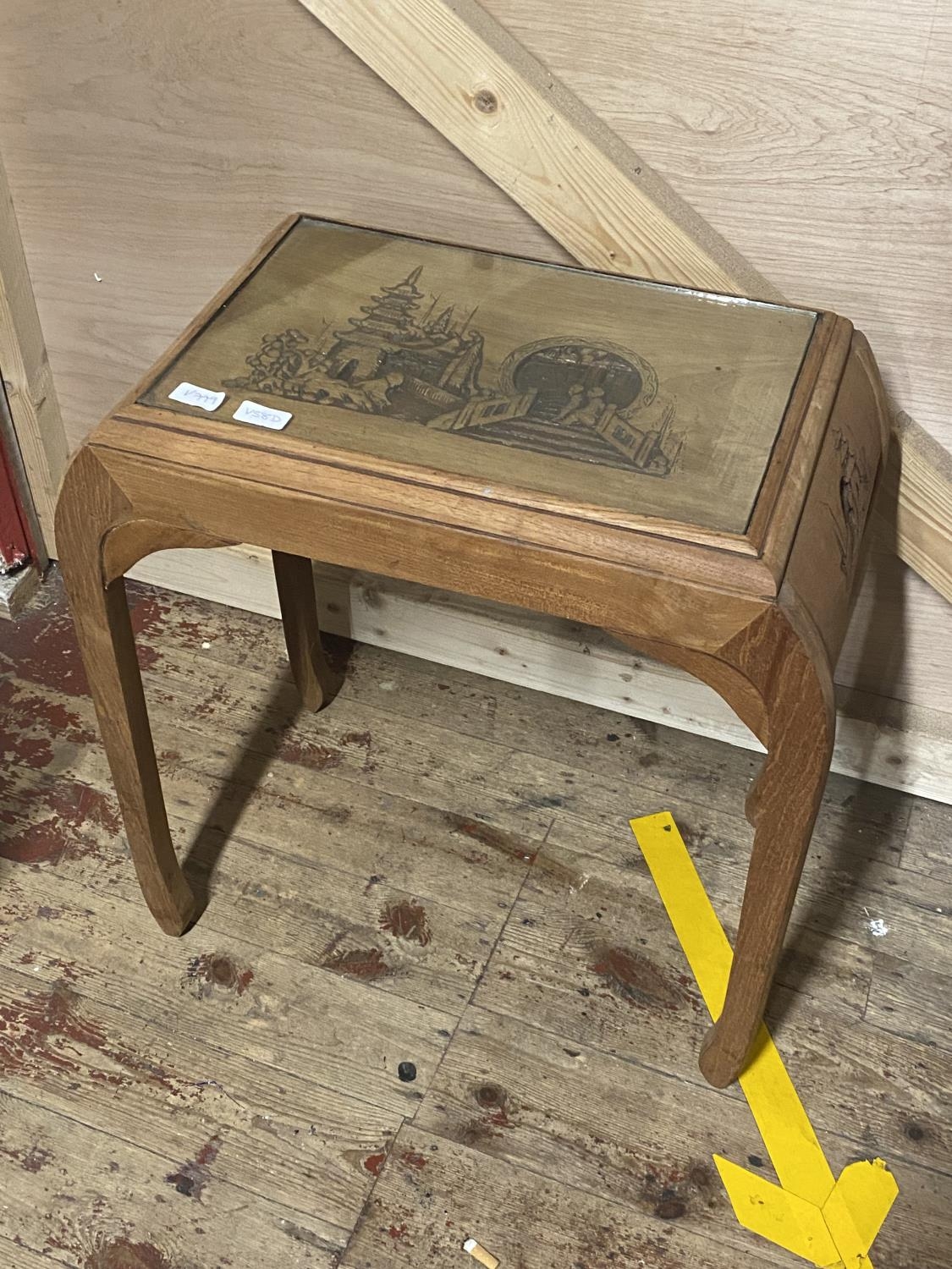A Chinese themed table with glass insert H65x60x37cm, shipping unavailable