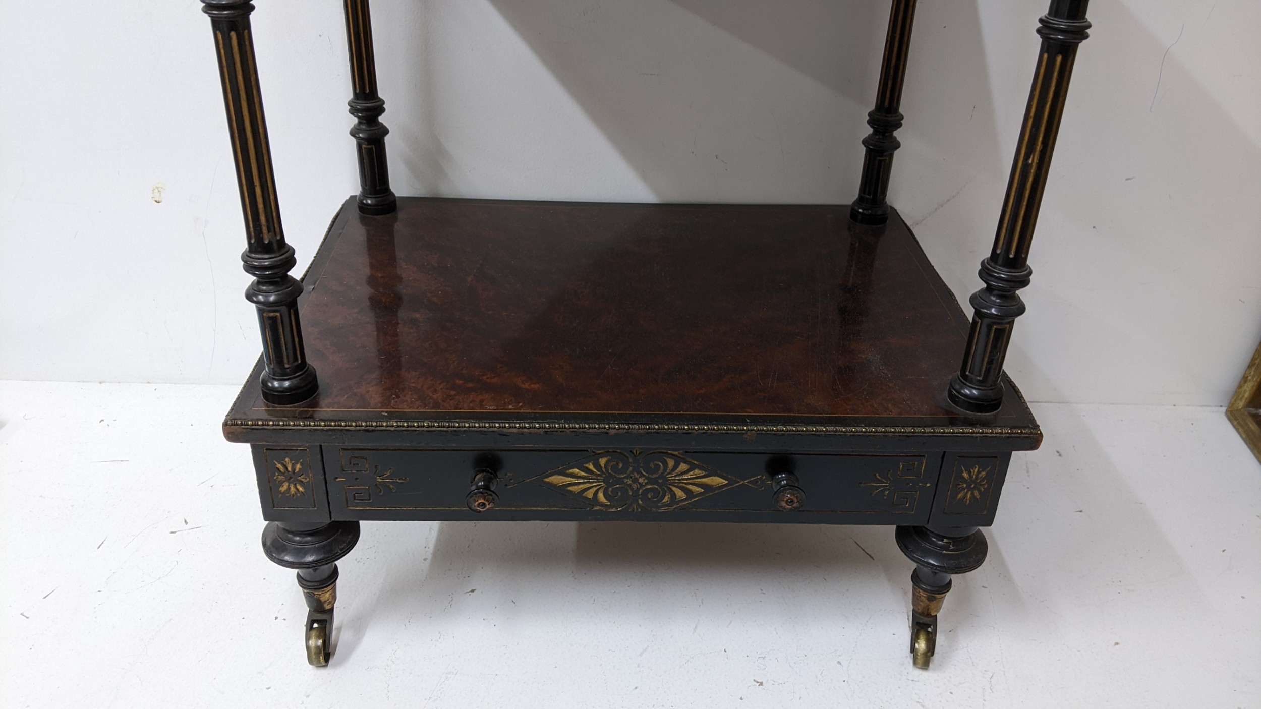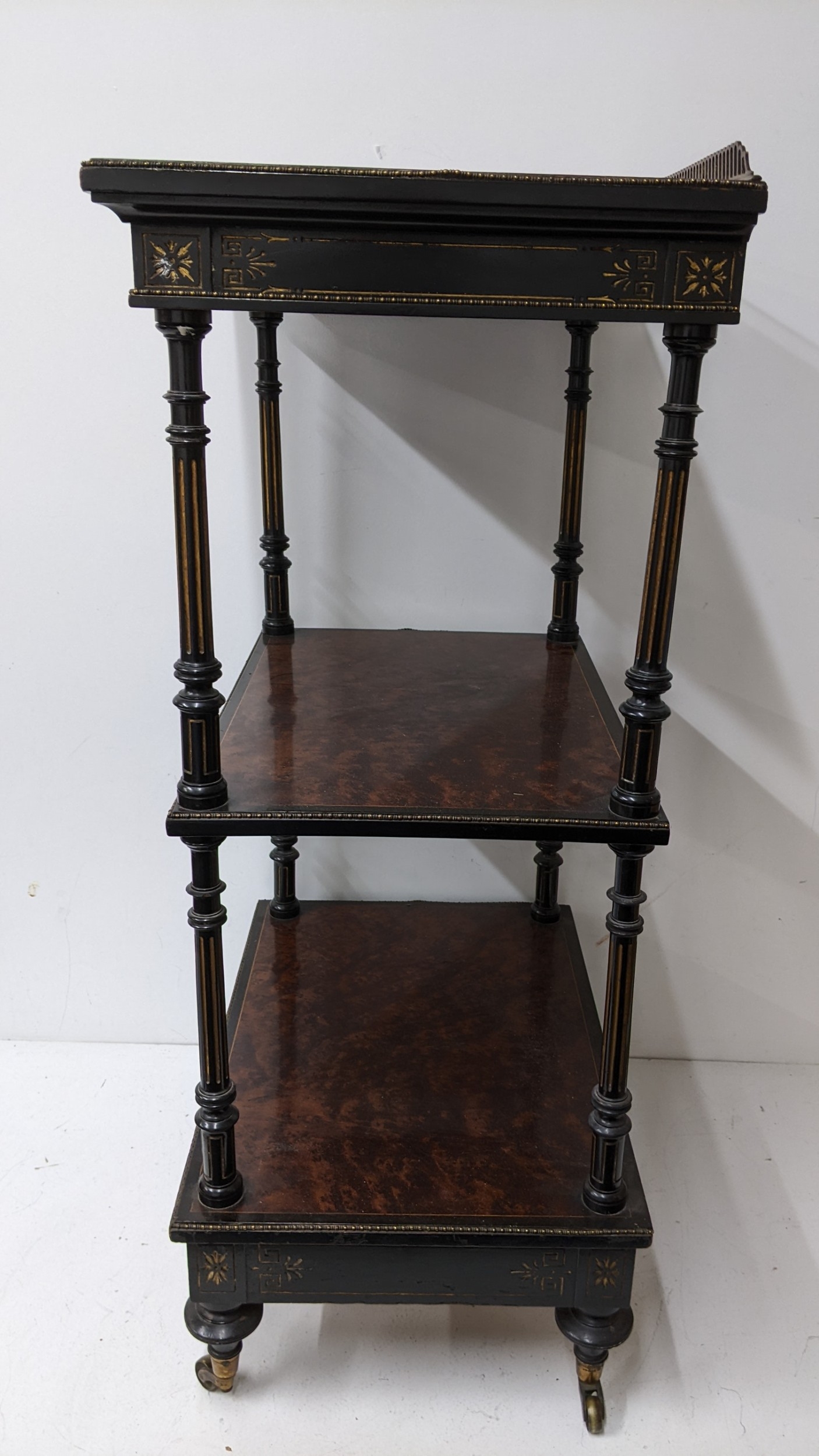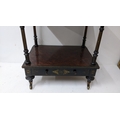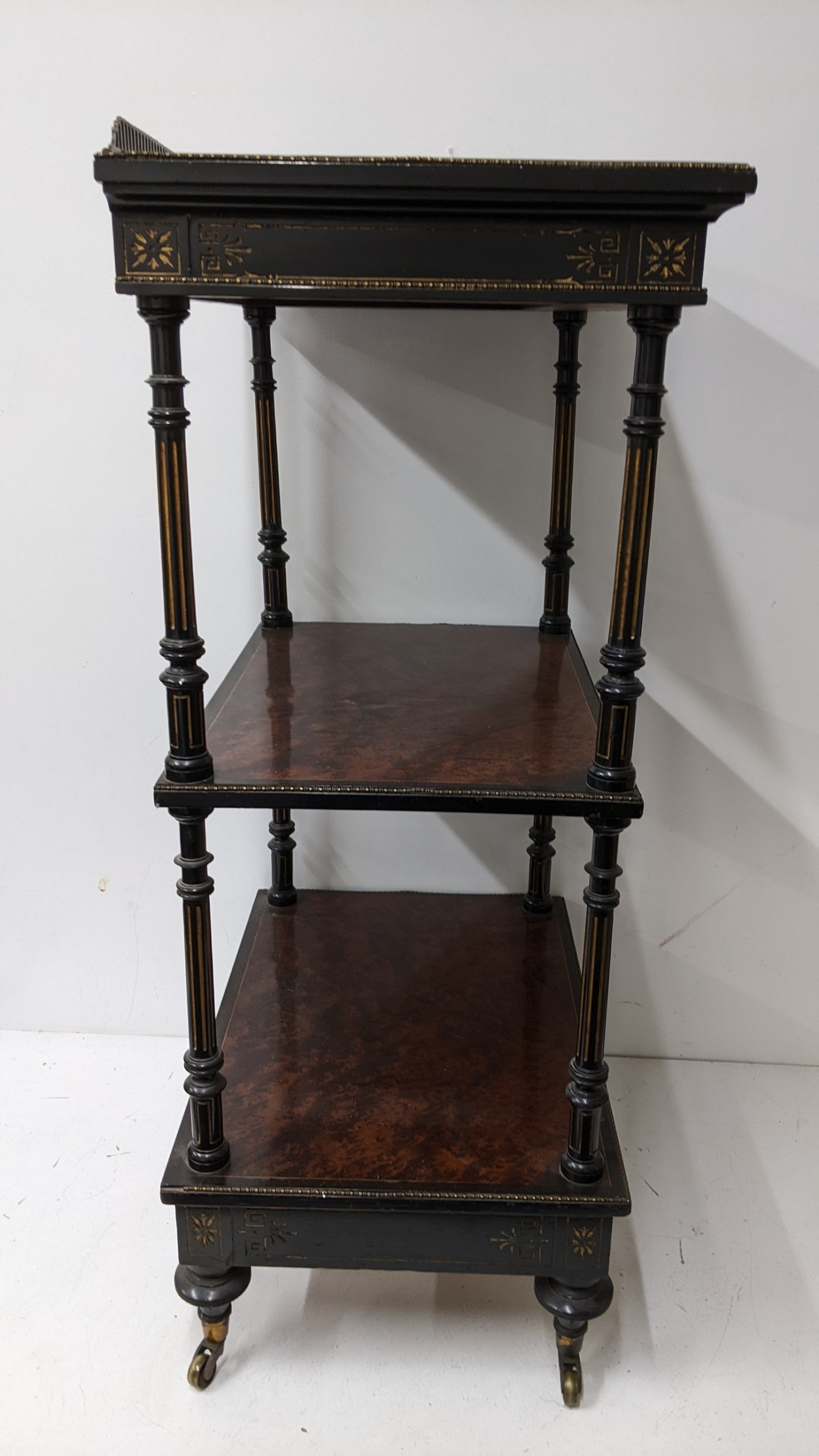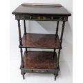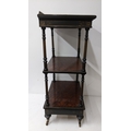 A Gillows Victorian Aesthetic Movement ebonised and amboyna whatnot, the rectangular three-tier top with pierced brass gallery and amboyna-veneered panels, above a single frieze drawer, raised on turned supports and terminating in brass castors, 98cm high x 54.5cm wide