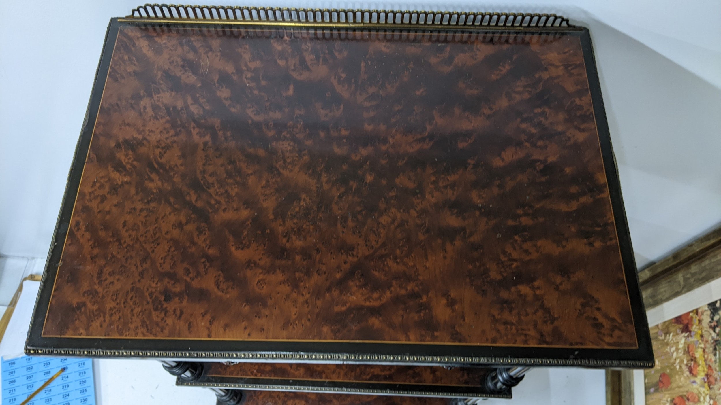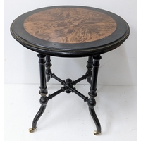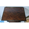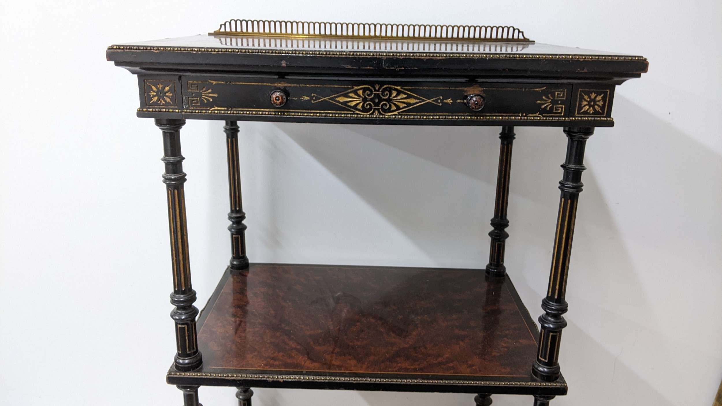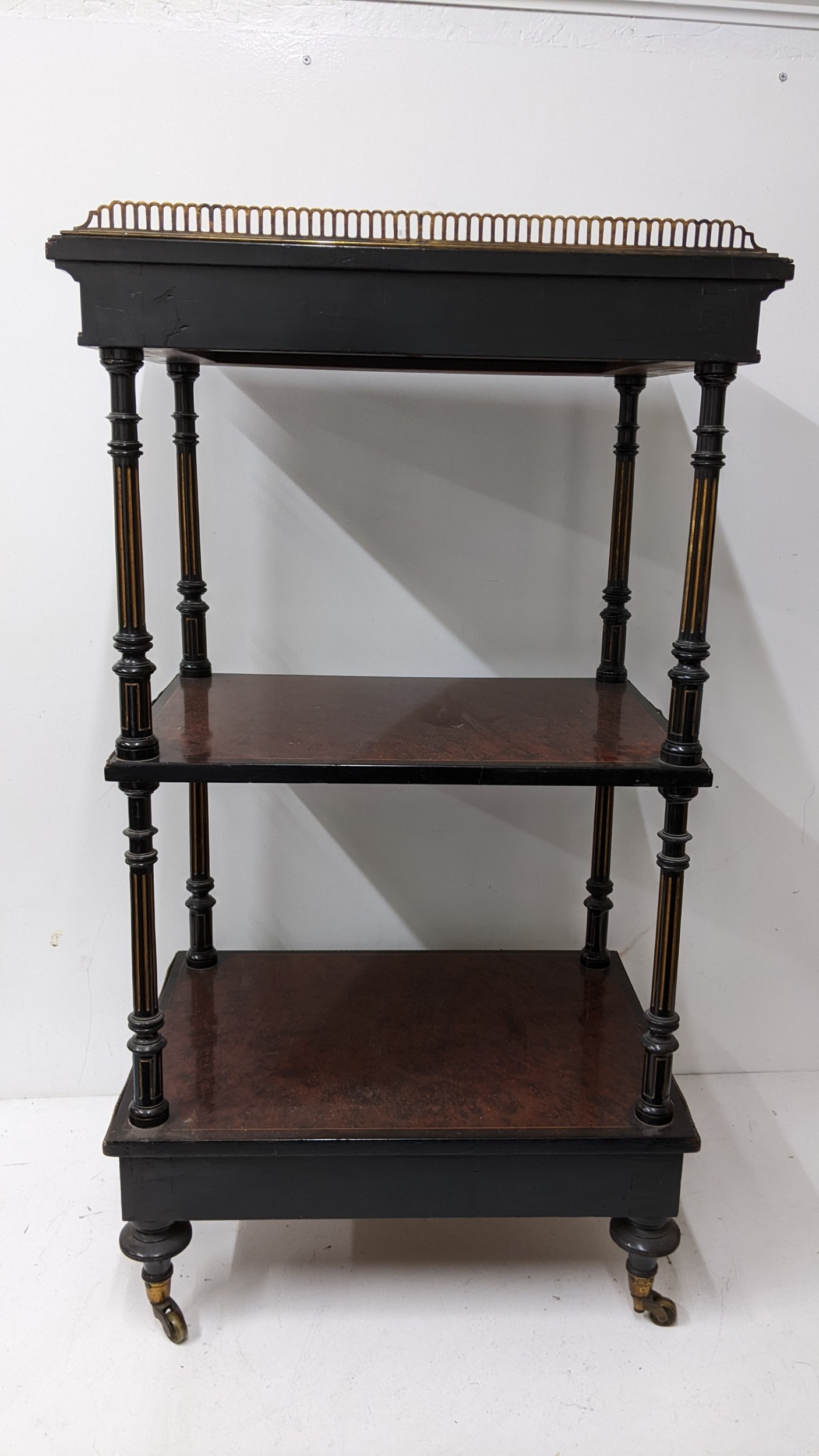 A Gillows Victorian Aesthetic Movement ebonised and amboyna whatnot, the rectangular three-tier top with pierced brass gallery and amboyna-veneered panels, above a single frieze drawer, raised on turned supports and terminating in brass castors, 98cm high x 54.5cm wide