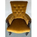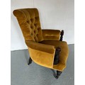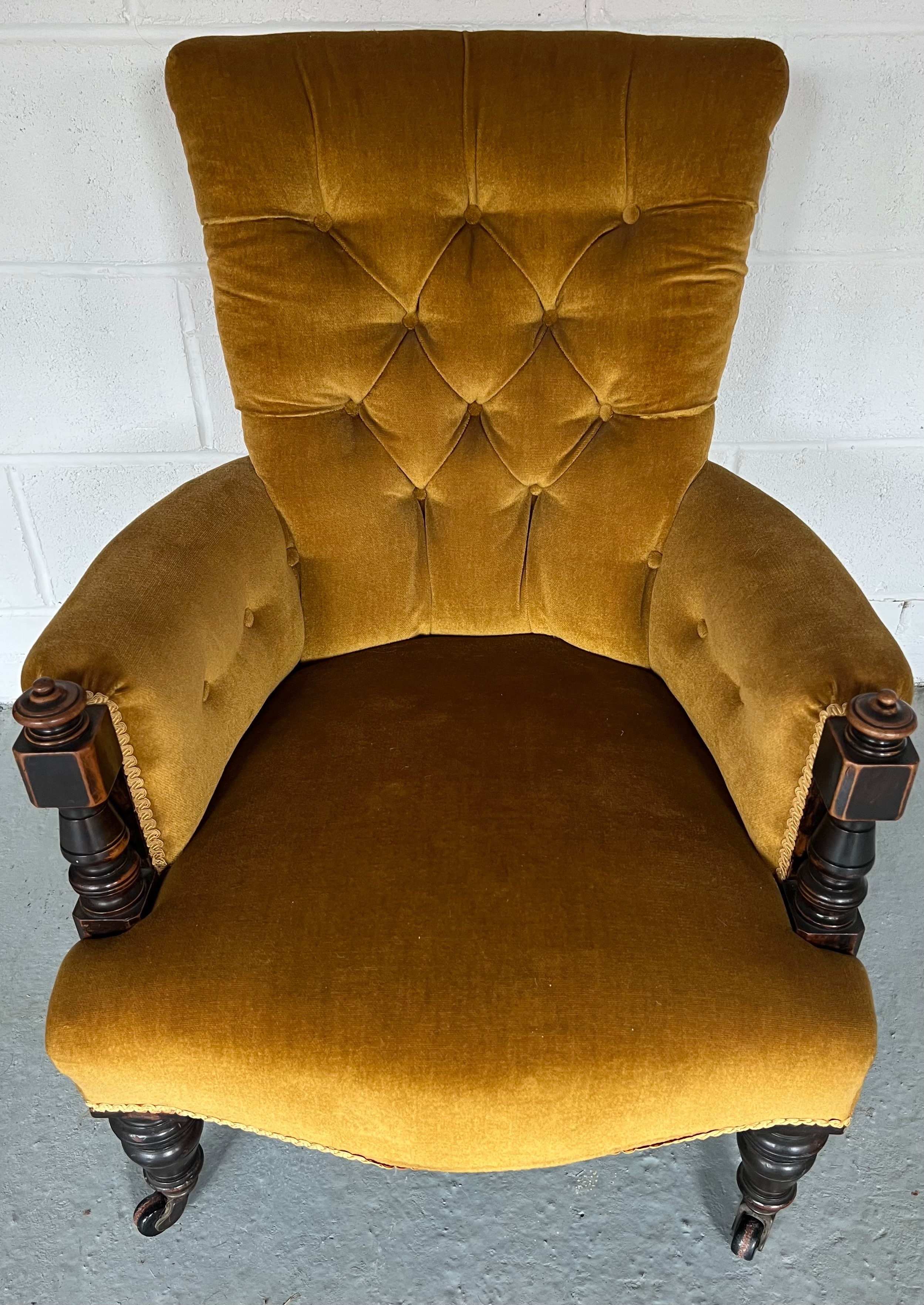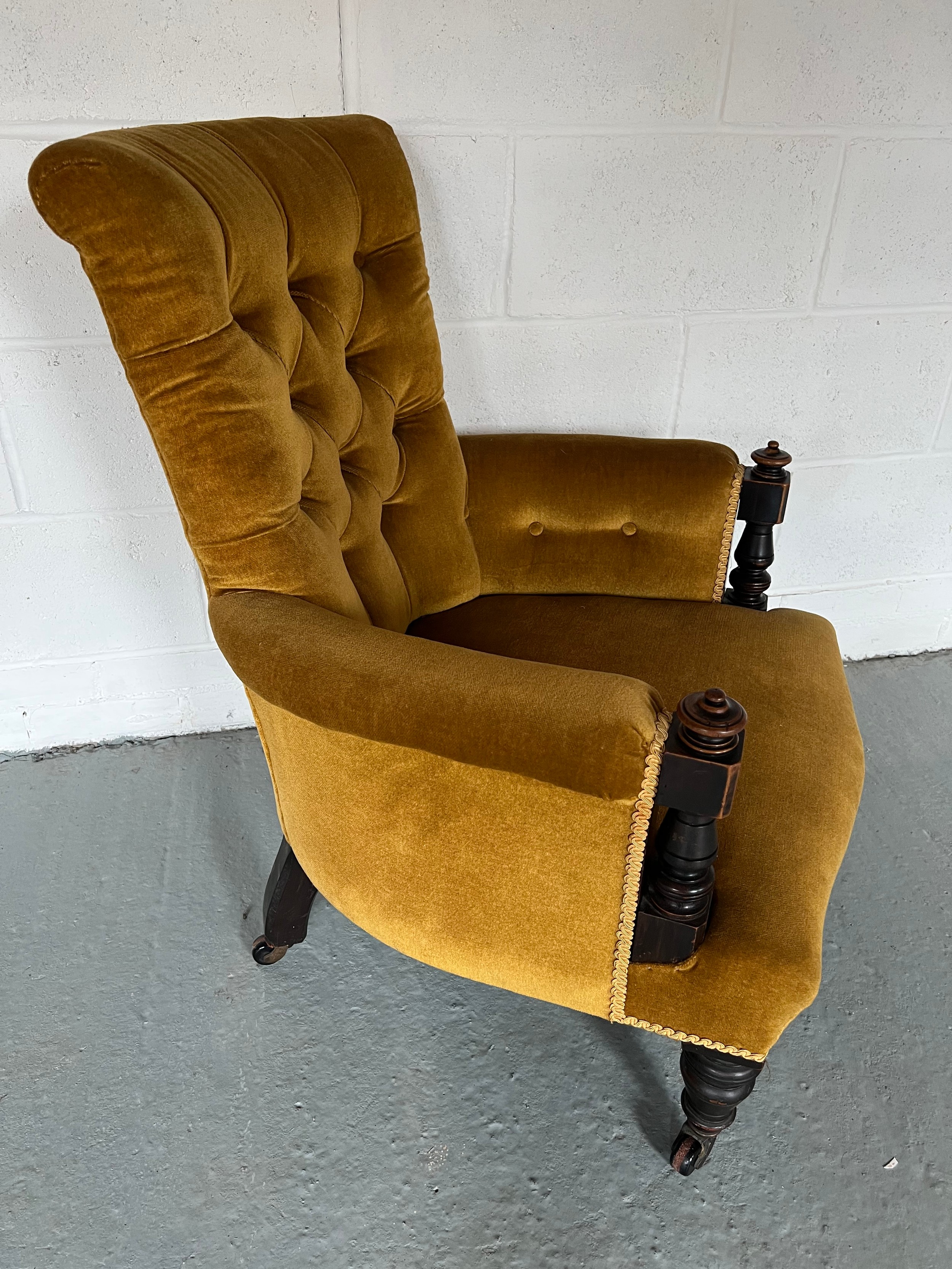 An upholstered armchair with turned supports and front legs. 85cm h to back.