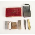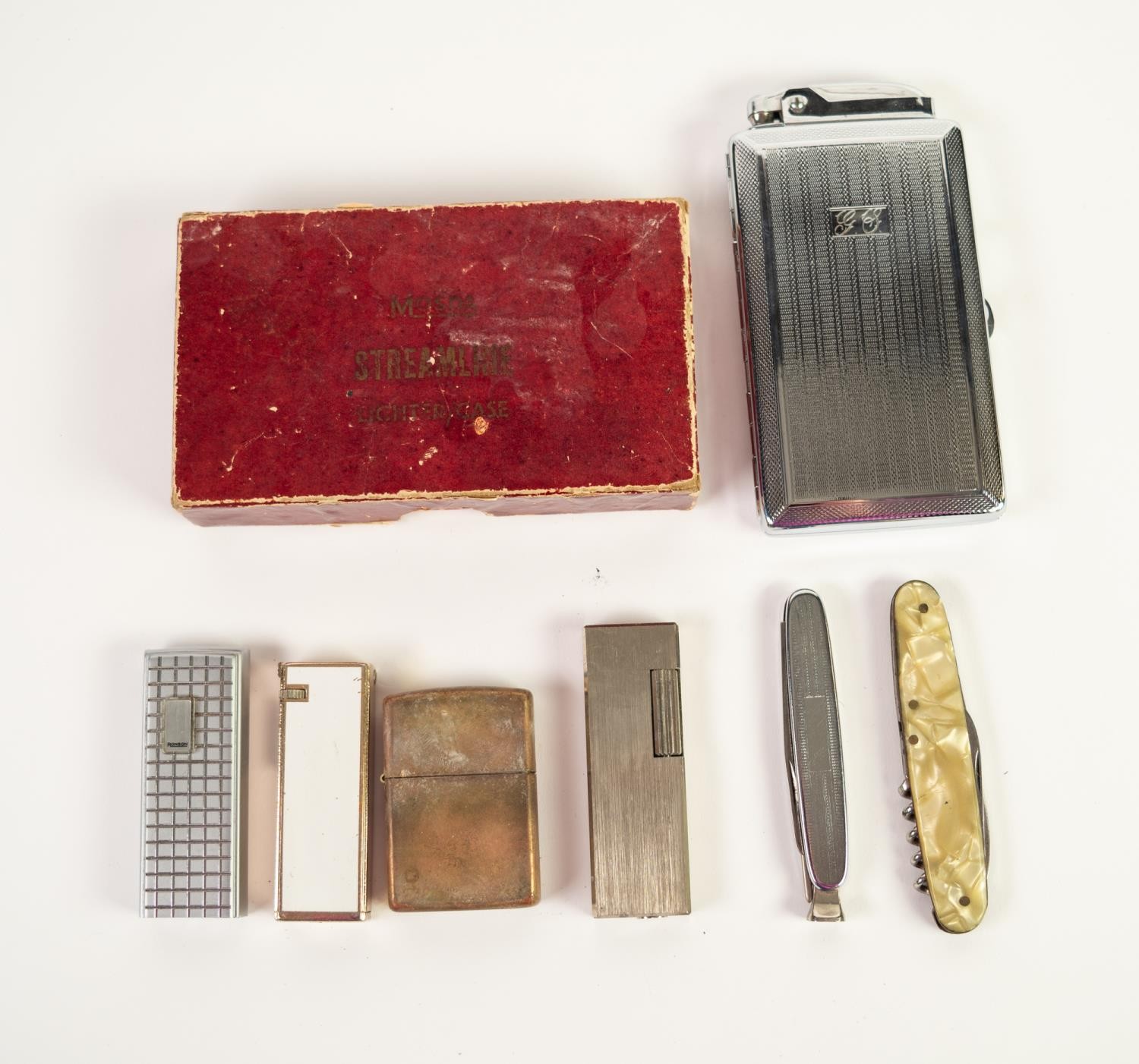 MOSDA BOXED STREAMLINE LIGHTER CASE, chromium plated combined lighter and pocket cigarette case, with engine turned decoration; a ZIPPO and THREE OTHER CIGARETTE LIGHTERS, Ronson, Myon and Champ; a PIPE SMOKER'S TAMPER AND TWO IMPLEMENTS, in clasp knife type fitting and a CLASP KNIFE with two blades and corkscrew (7)
