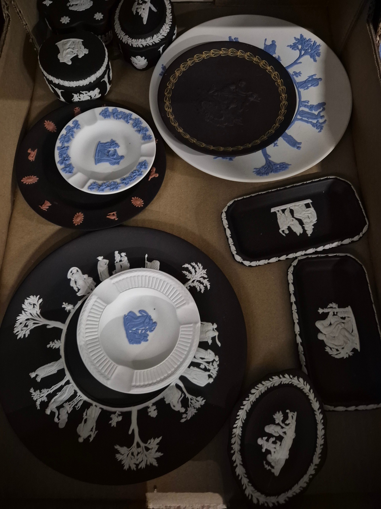 A box of assorted Wedgwood Jasperware.