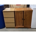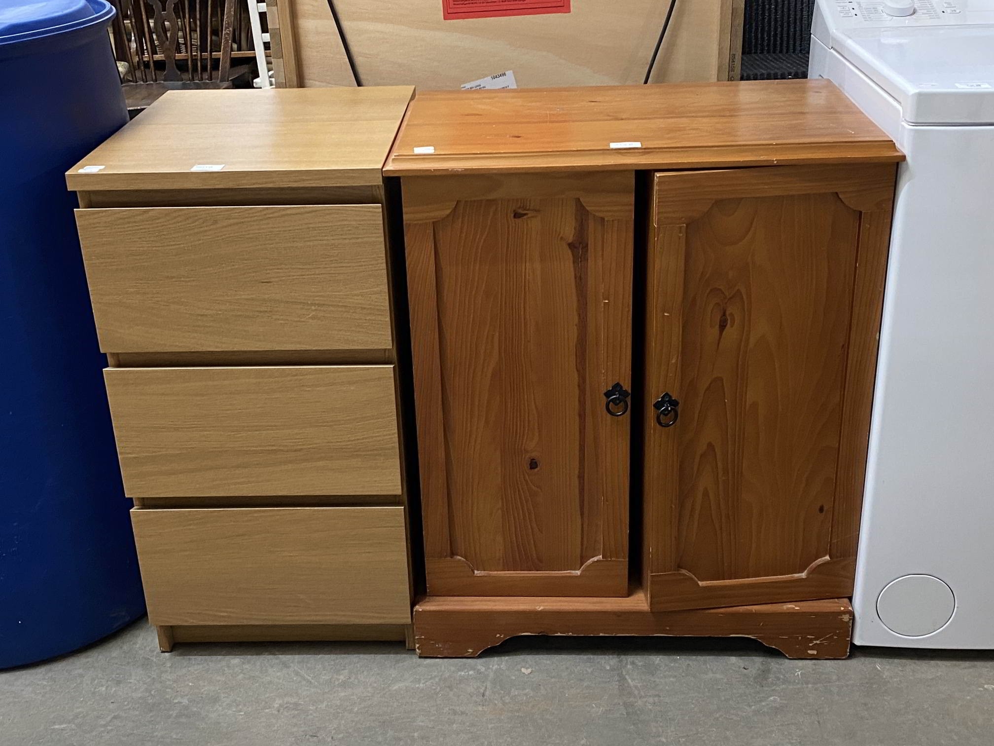 Beech three drawer chest 78H 41W 49D & a pine 2 door cupboard 80H 65W 38D