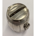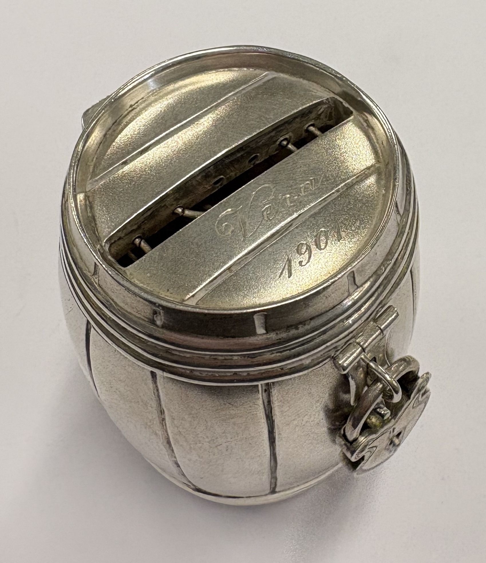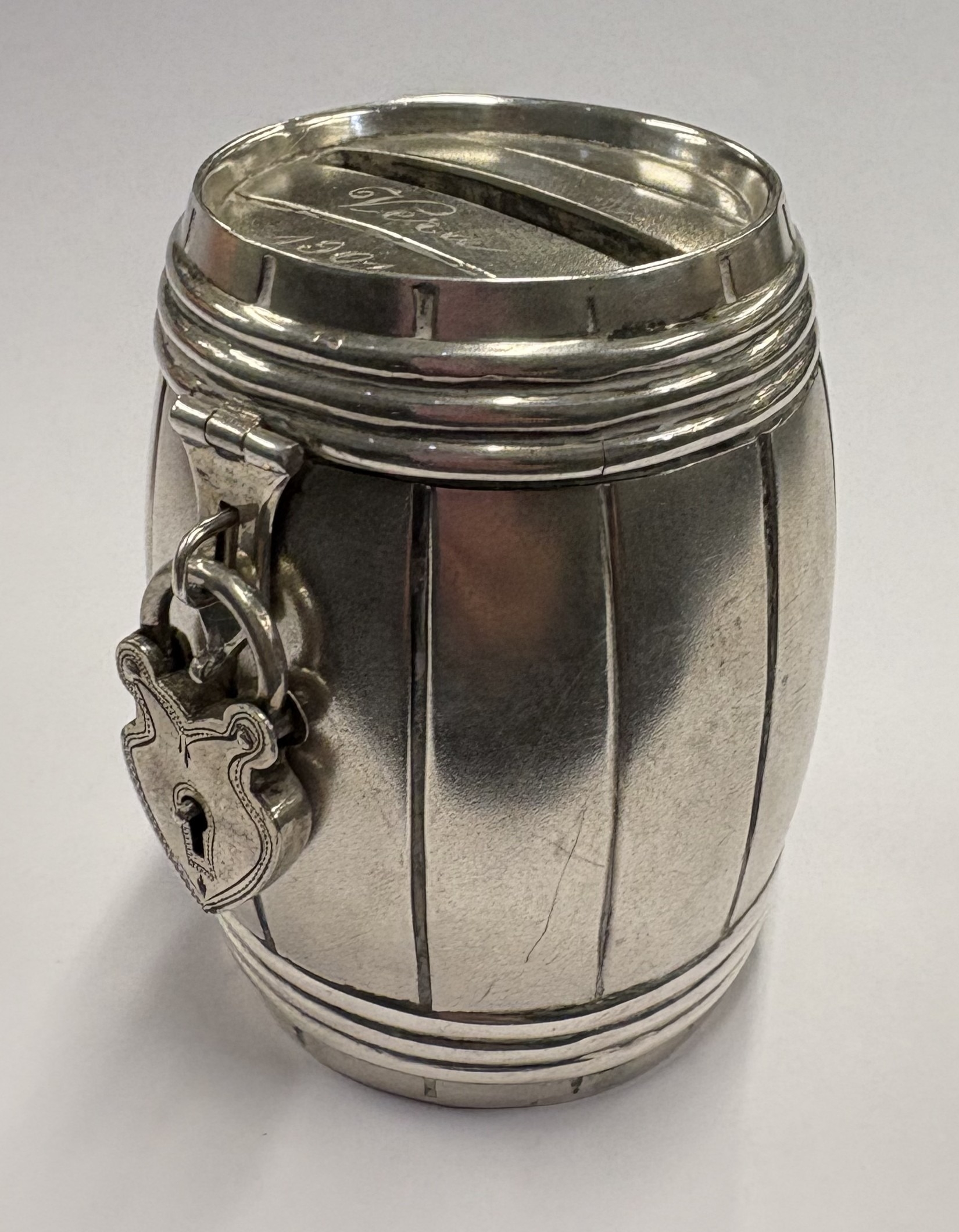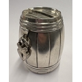 A novelty barrel-shaped 19th/20th Century Continental silver money box, marked to base. Approx. 68 grams. Est. £200 - £300.