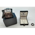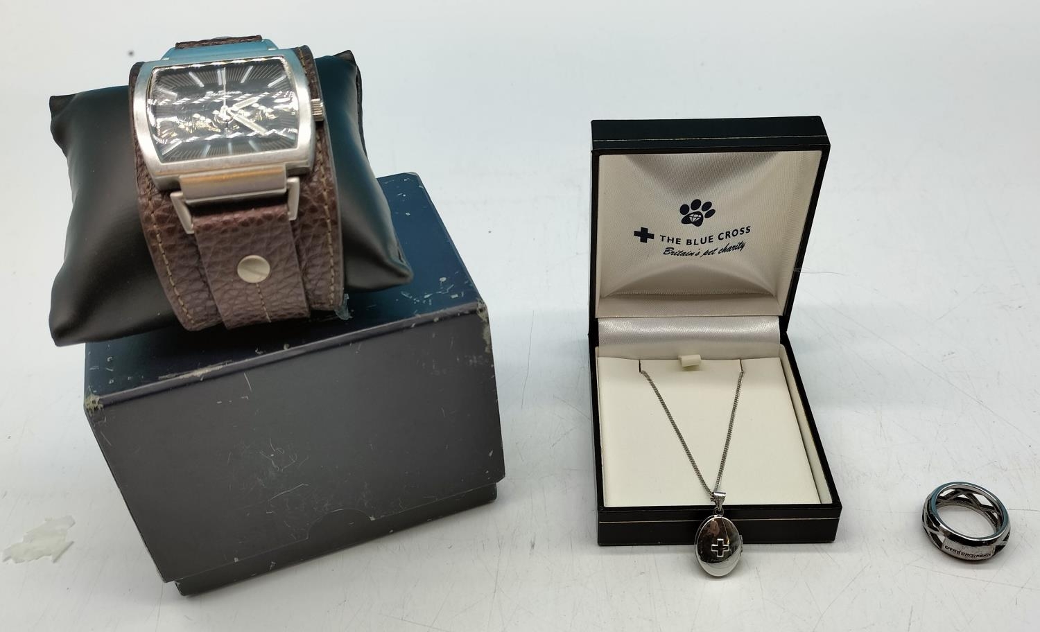Boxed Ben Sherman Watch with Leather Strap, Blue Cross Pendant and Necklace plus White Metal Ring. Size Q.