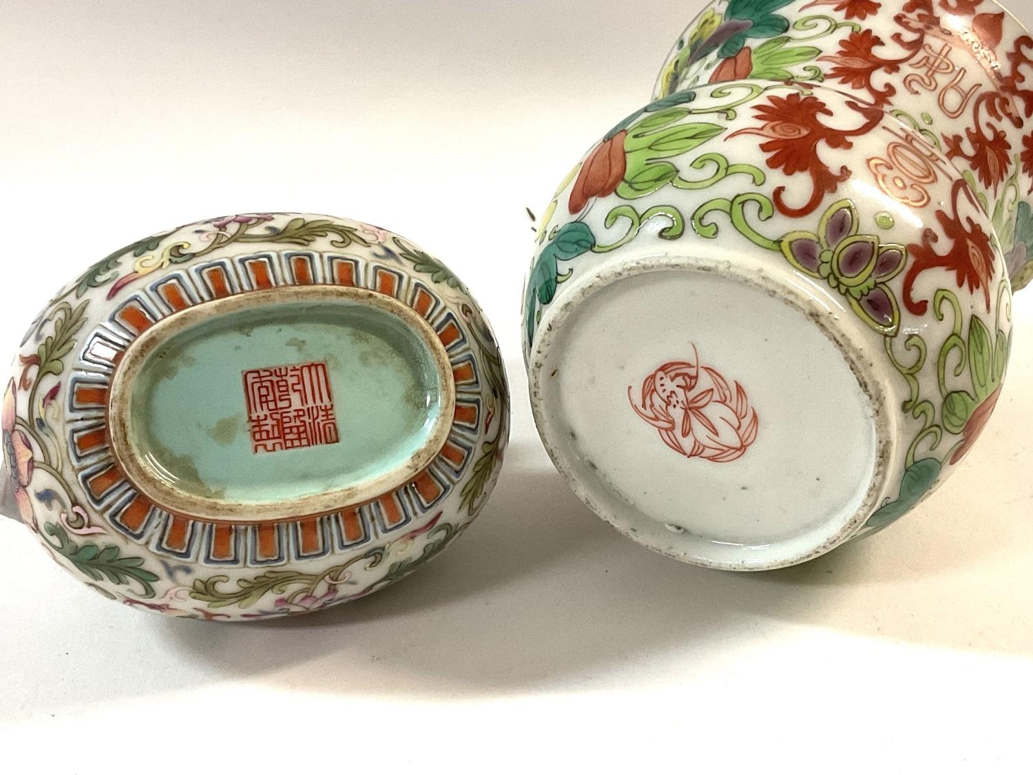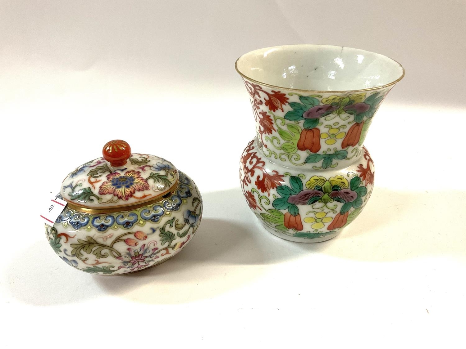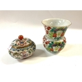 A small Chinese porcelain famille rose decorated pot and cover together with a small wide rimmed posy vase.
