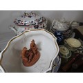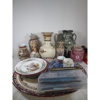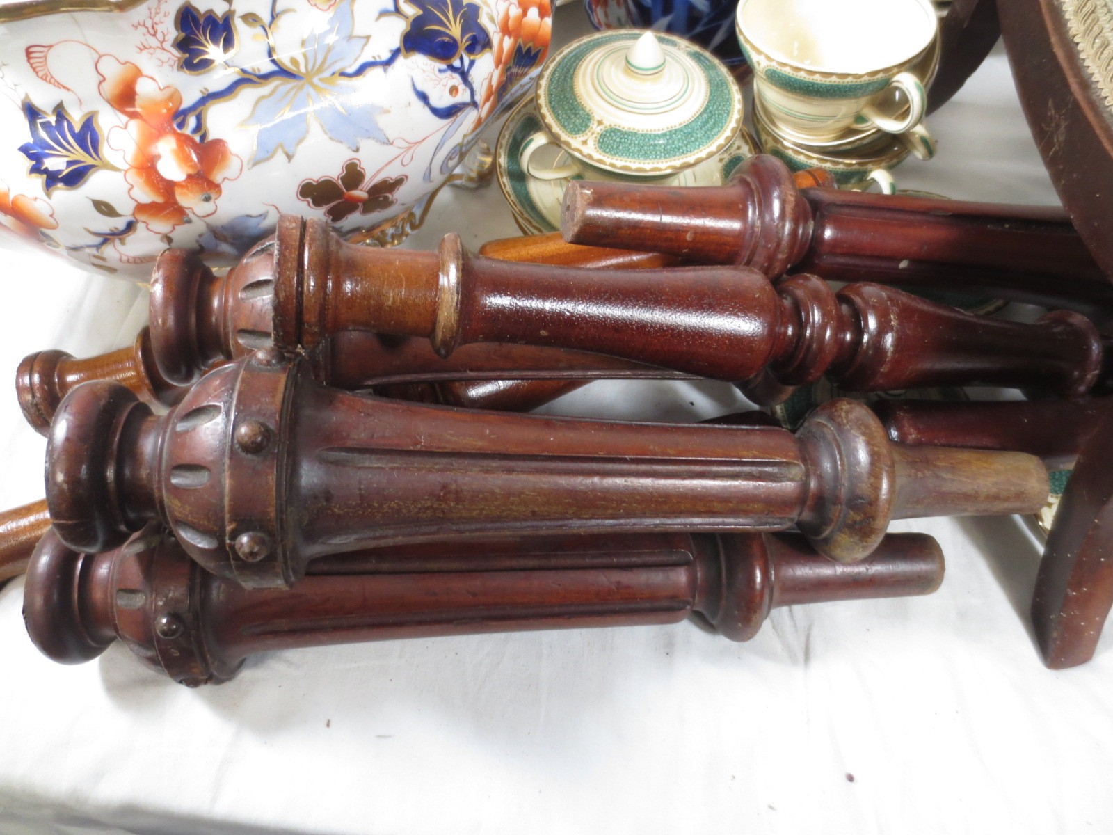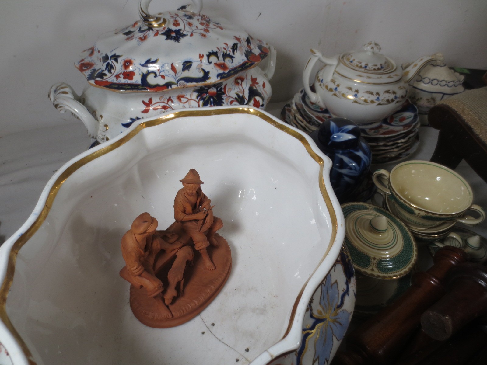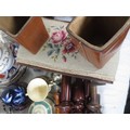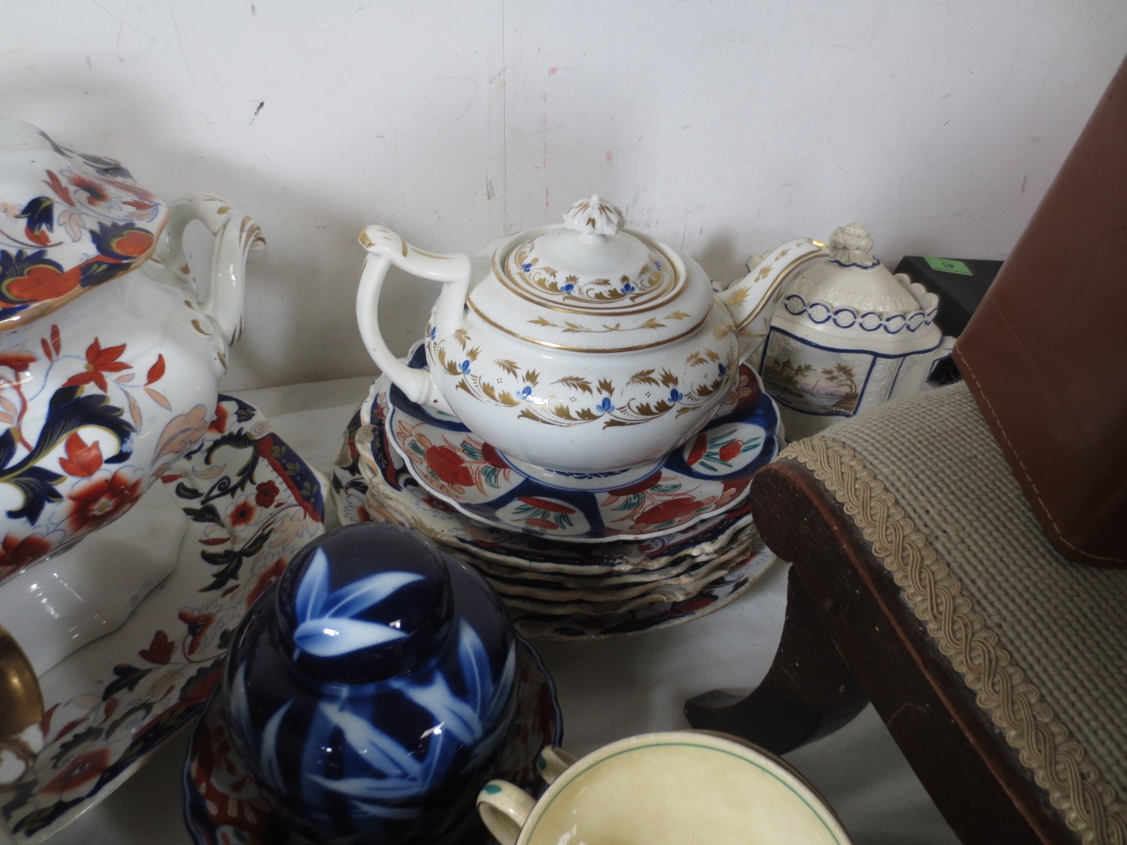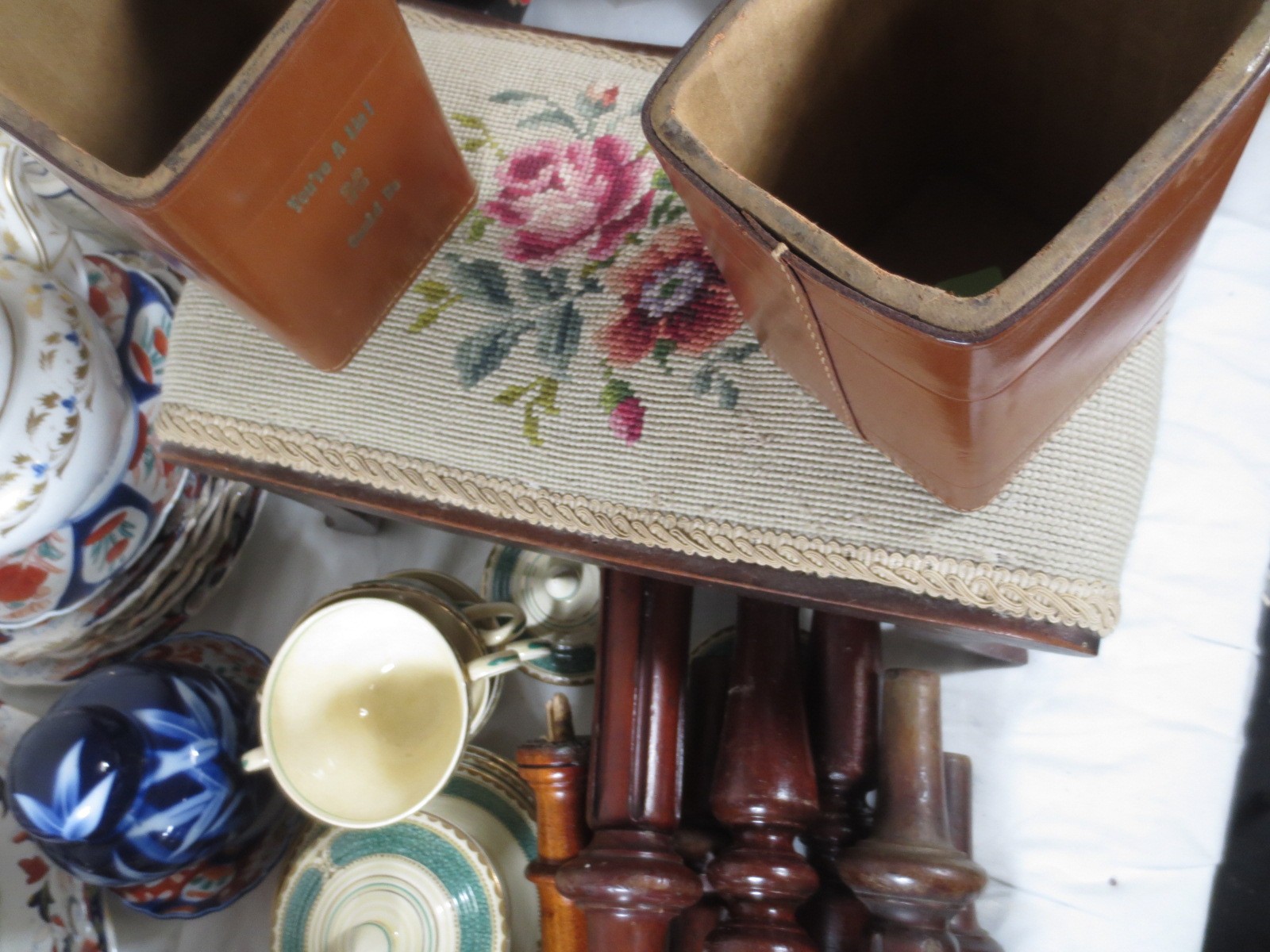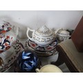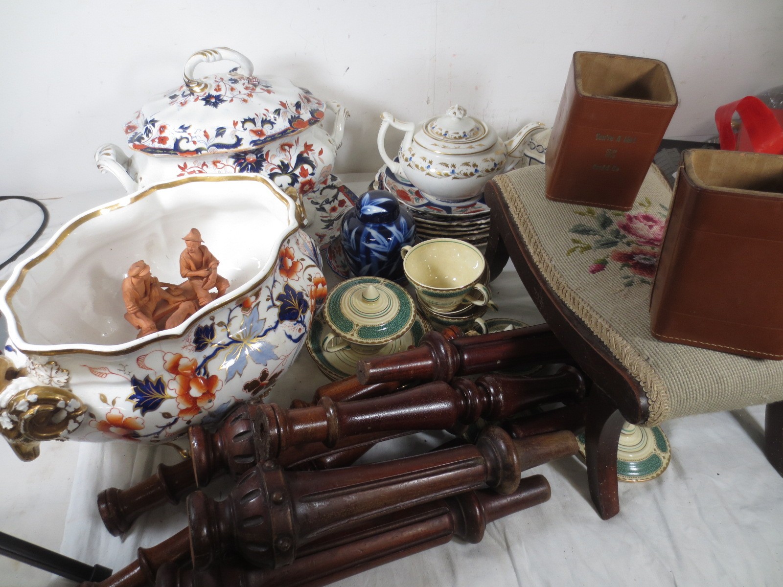 Two crates of china, pottery and mixed items, a large Imari tureen (a/f stapled repair) other mixed Imari plates, some Booths Ribstone ware, two leather desk tidies, a small footstool, turned furniture legs, etc