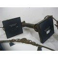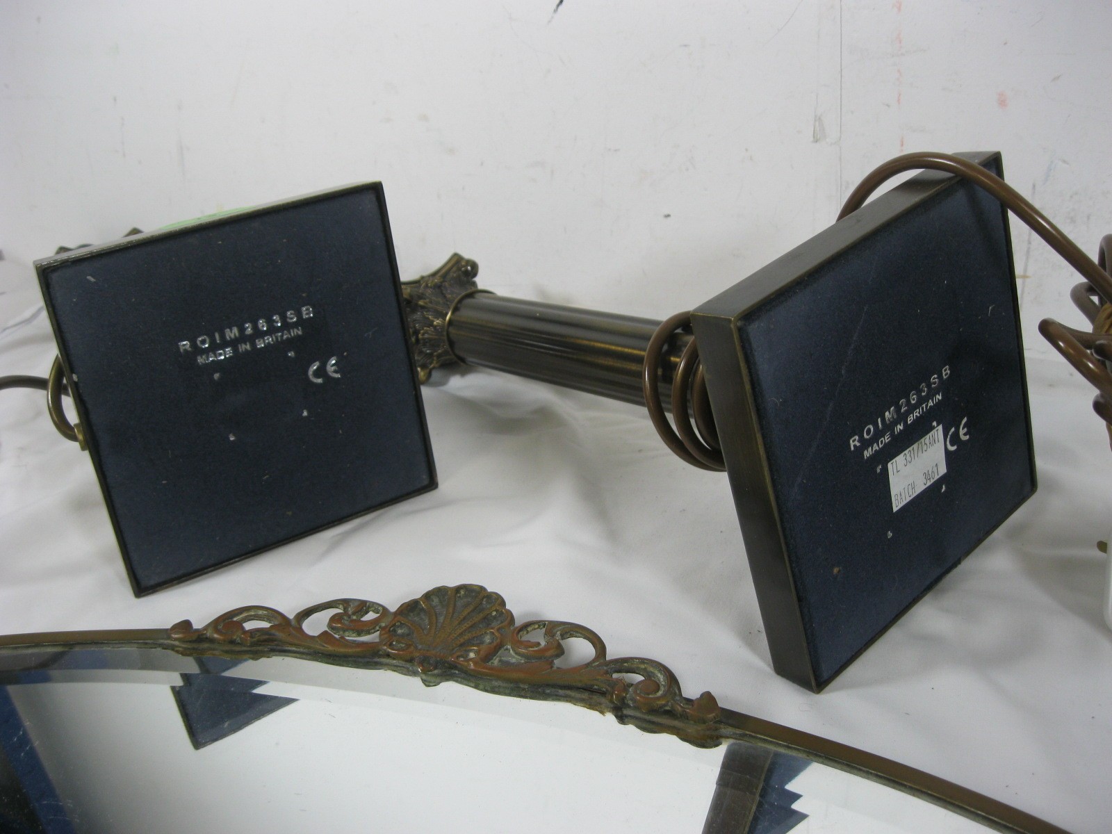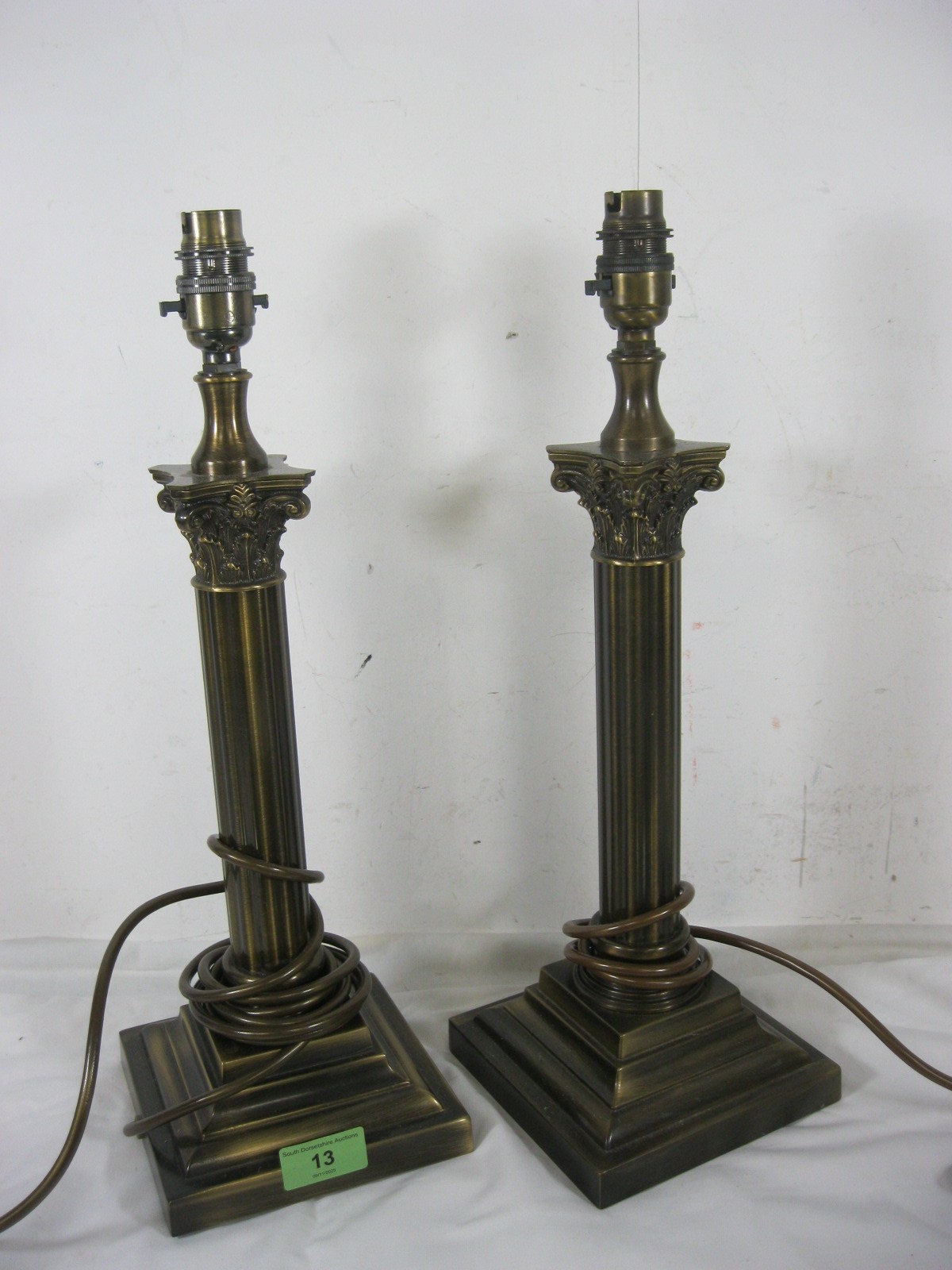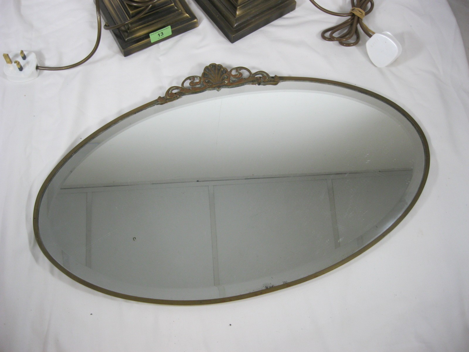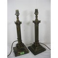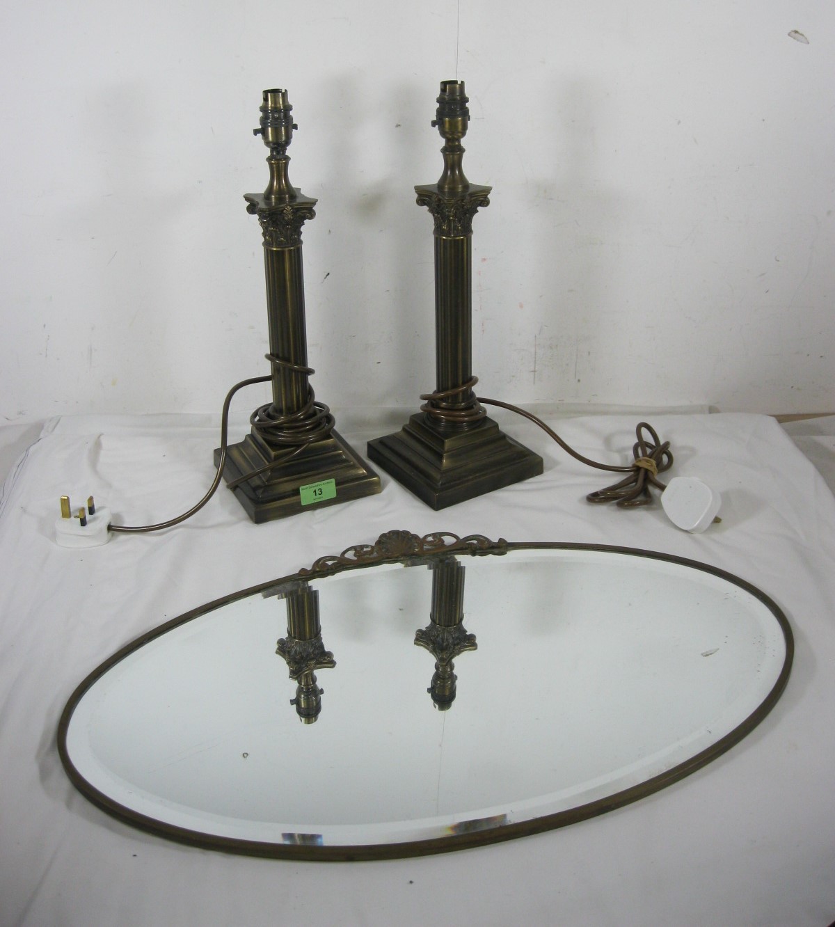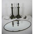 A pair of bronze effect table lamps as Corinthian columns standing at 42cm including bulb fittings, together with an oval wall mirror in a metal frame