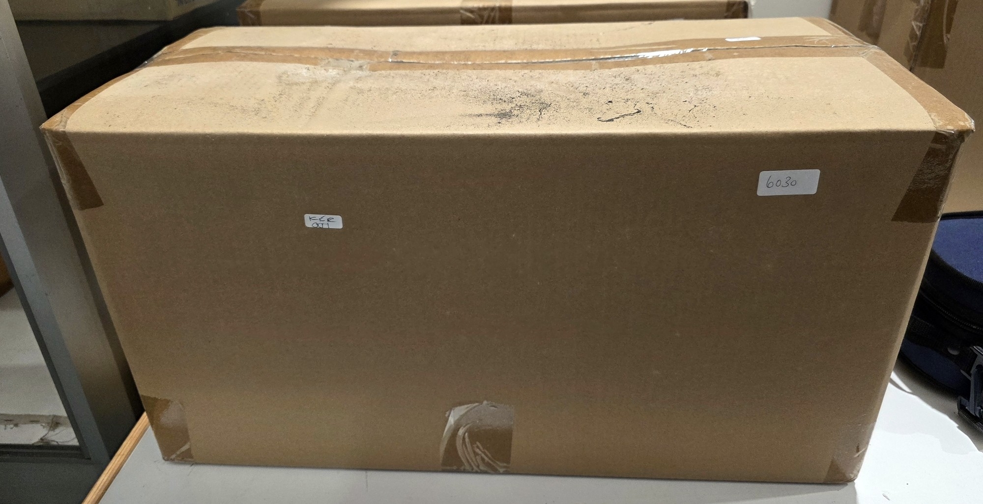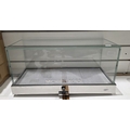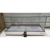 Contemporary Michael Kors counter top shop display cabinet of rectangular form, comprising five glass panel side, the front panel with applied chrome-effect ‘ Michael Kors ‘ logo, on a lockable pull out chrome-effect base, with key, 26cm high x 53.5cm wide x 21cm deep (still sealed in original packaging box)