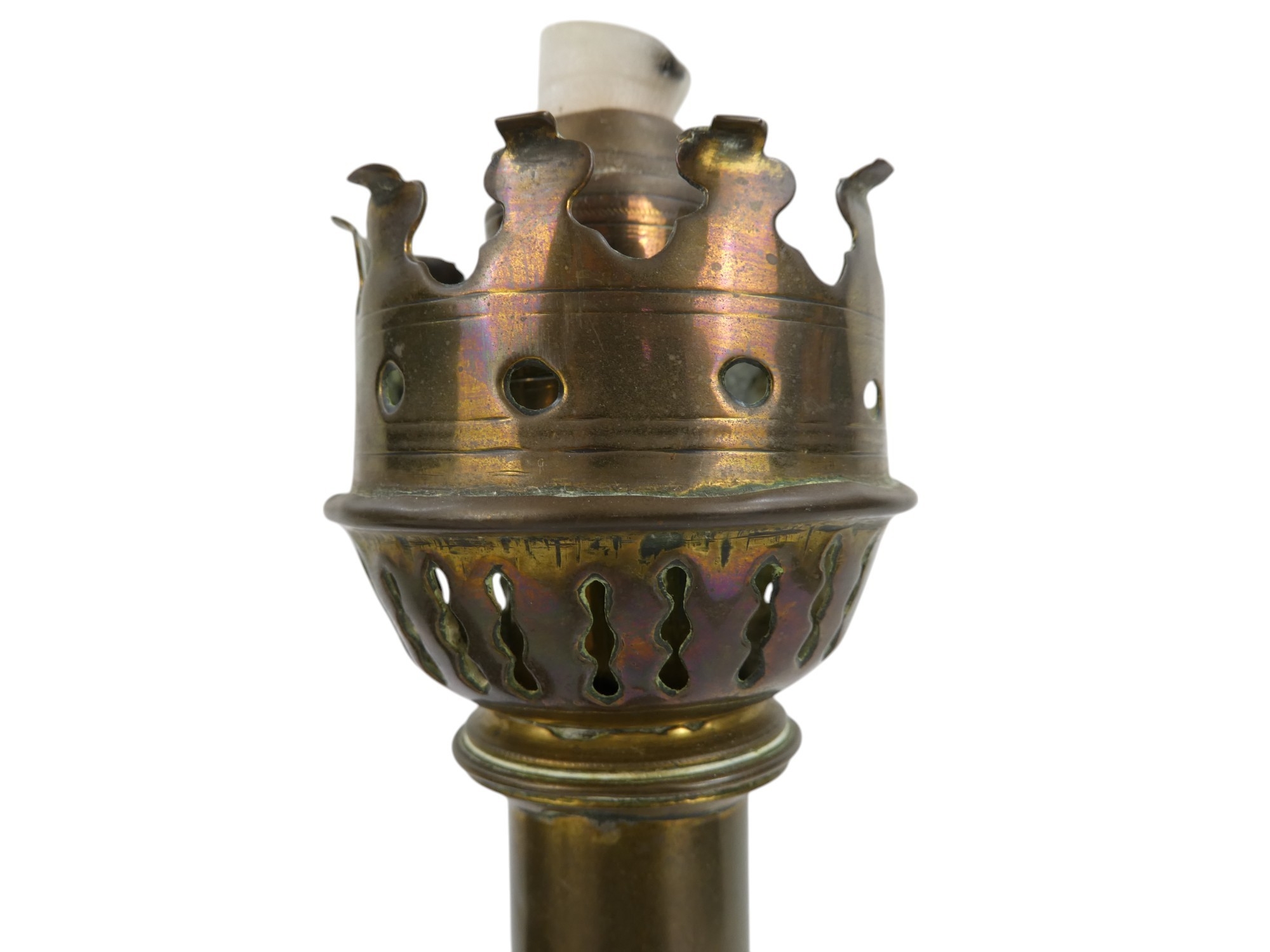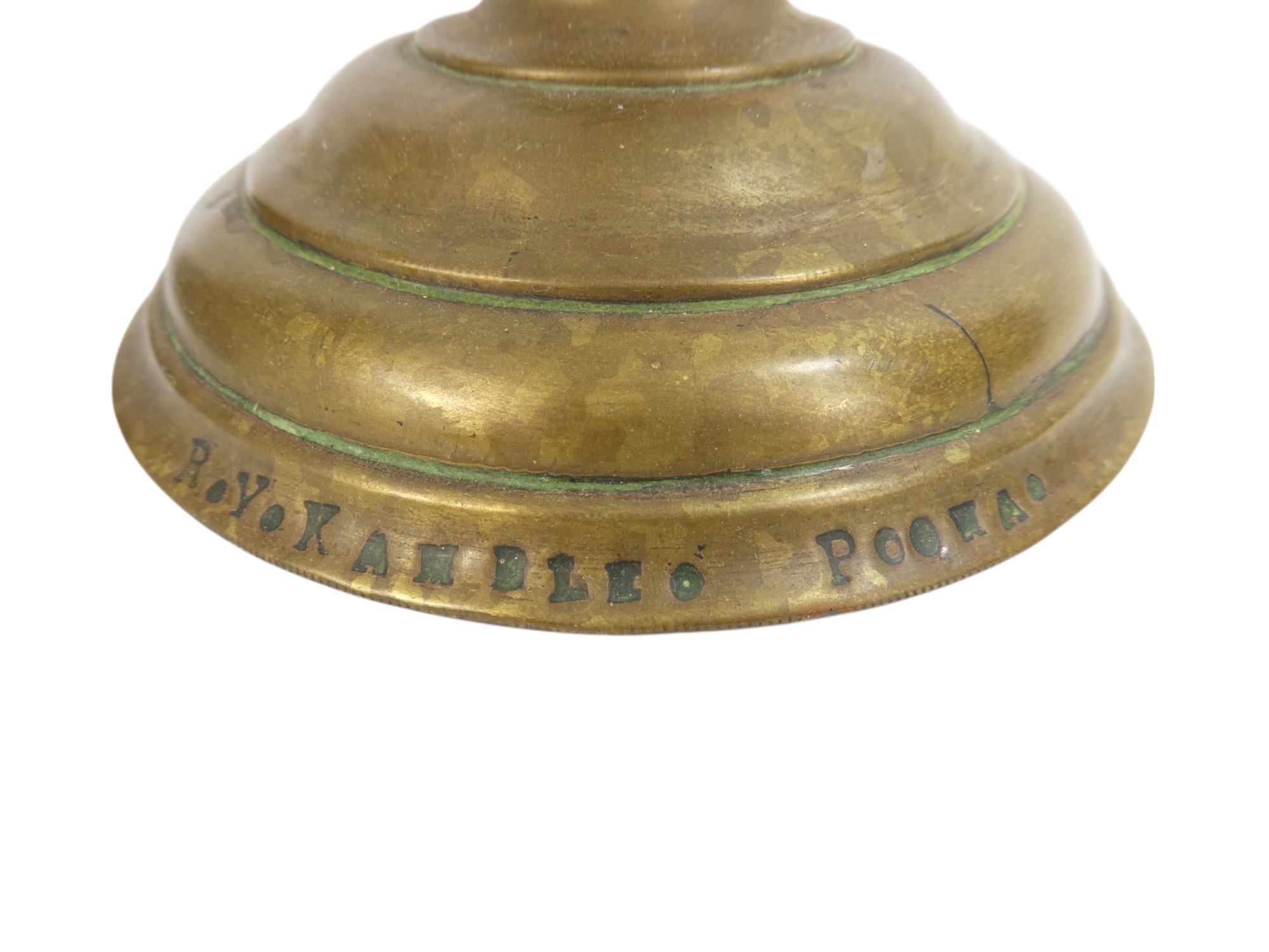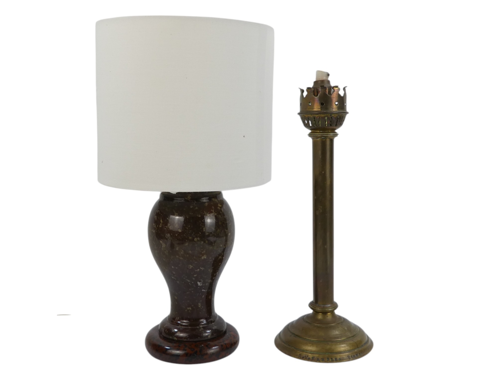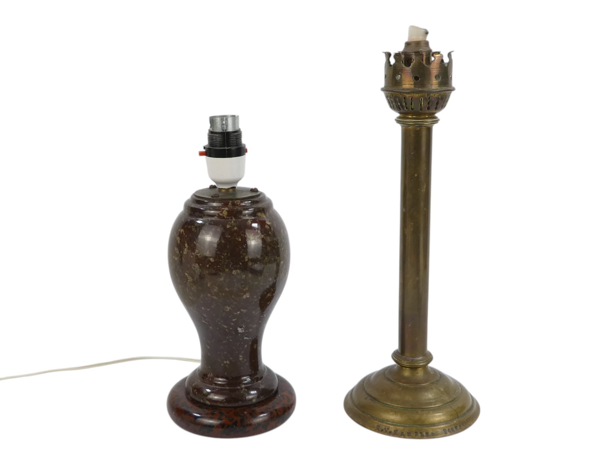A 20th century turned serpentine table lamp - of baluster form and with circular base, 22cm high, together with a brass chapel candlestick.