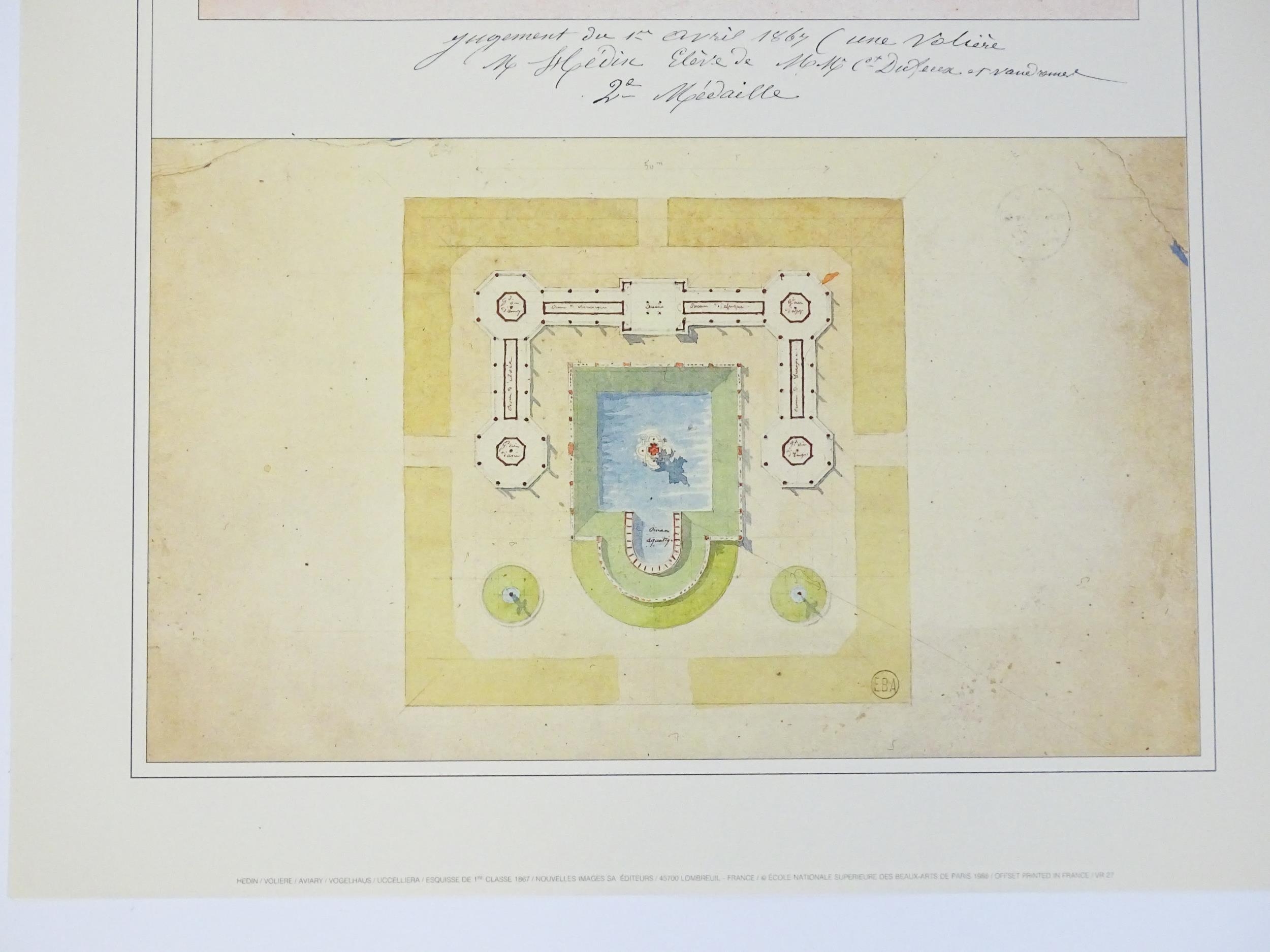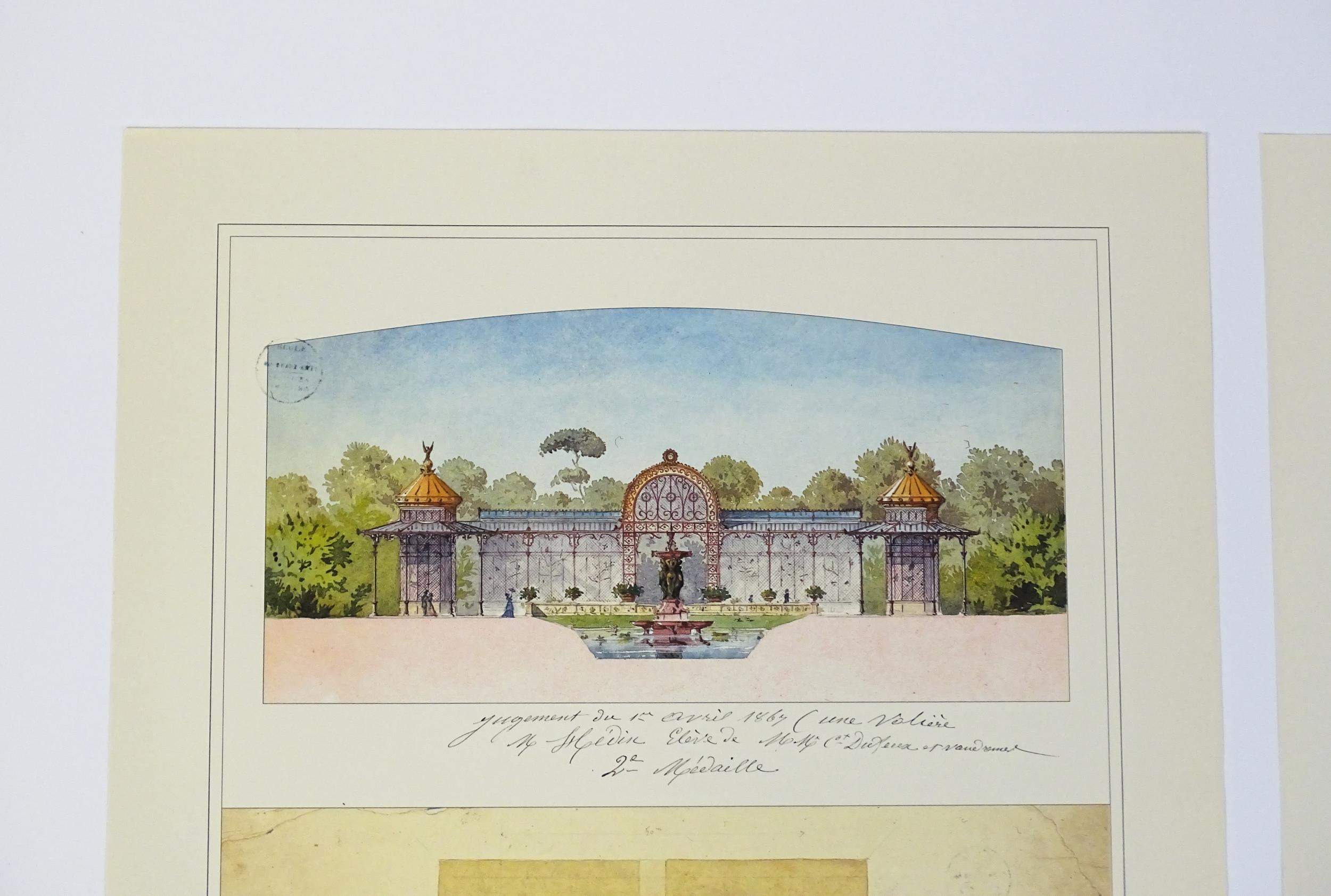 20th century, French School, Colour prints, Two architectural studies / plans to include Pont sur un Chemin / Bridge on a Railroad after Charles August Huillard, Aviary after Andre-Arthur Hedin. Approx. 18 1/2" x 15 1/4" (2)
