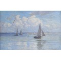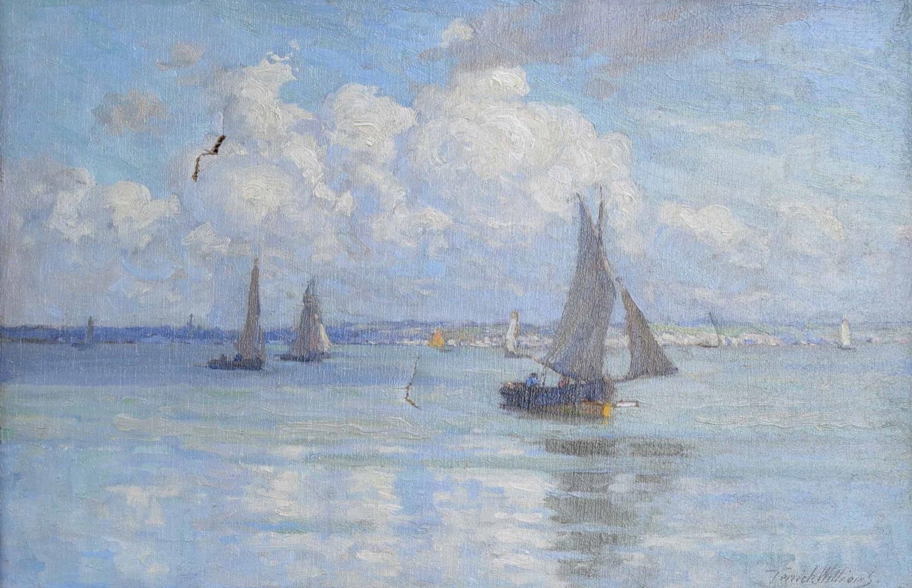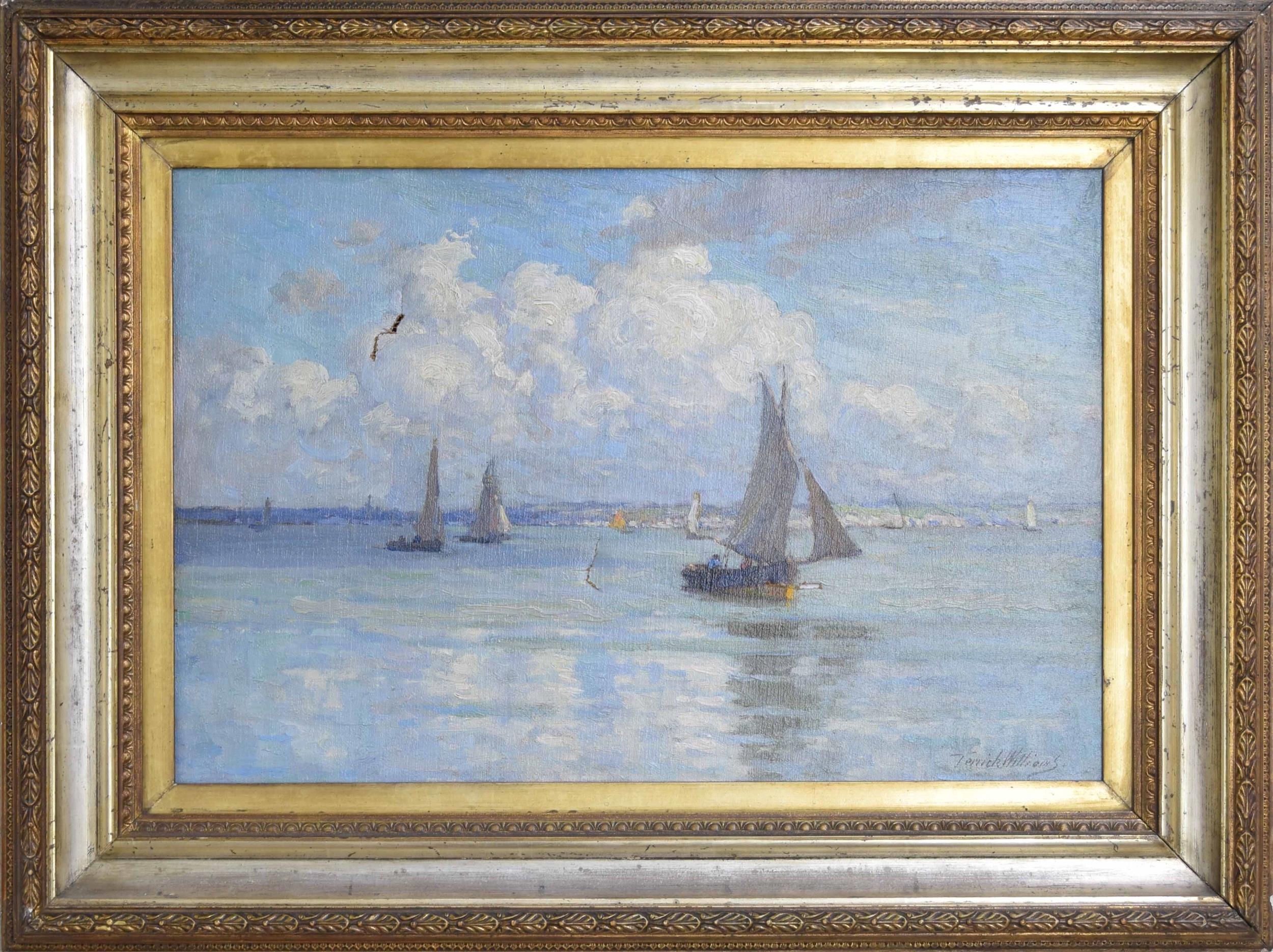 John Terrick Williams RA., RI., ROI., (1860-1936) - Boats off a sunlit coastline, possibly Cornwall, signed also inscribed with the artist name and the following inscription "Art Club Studios", Blackheath, London SE and dated 1900, oil on canvas, 12" x 18"