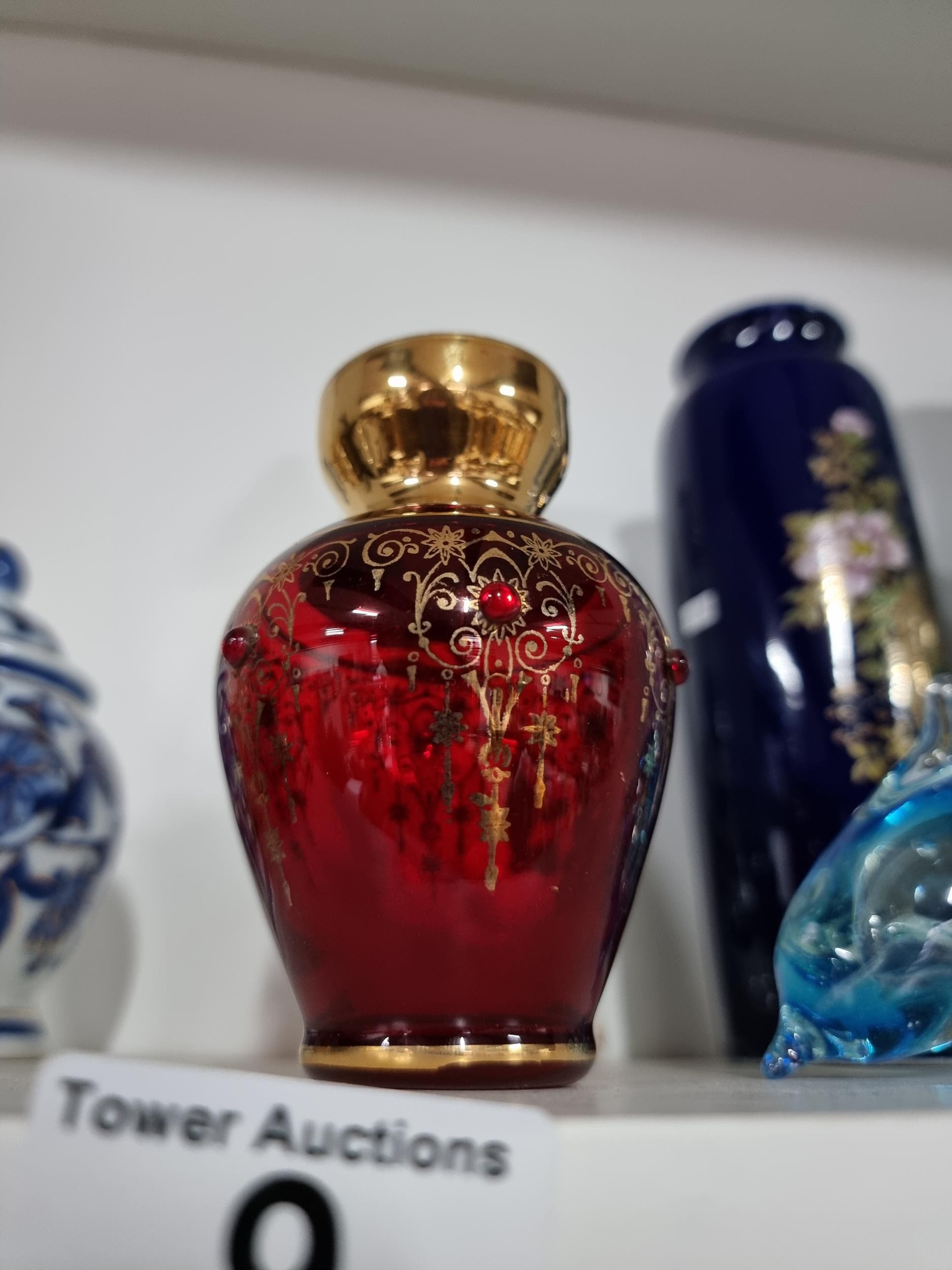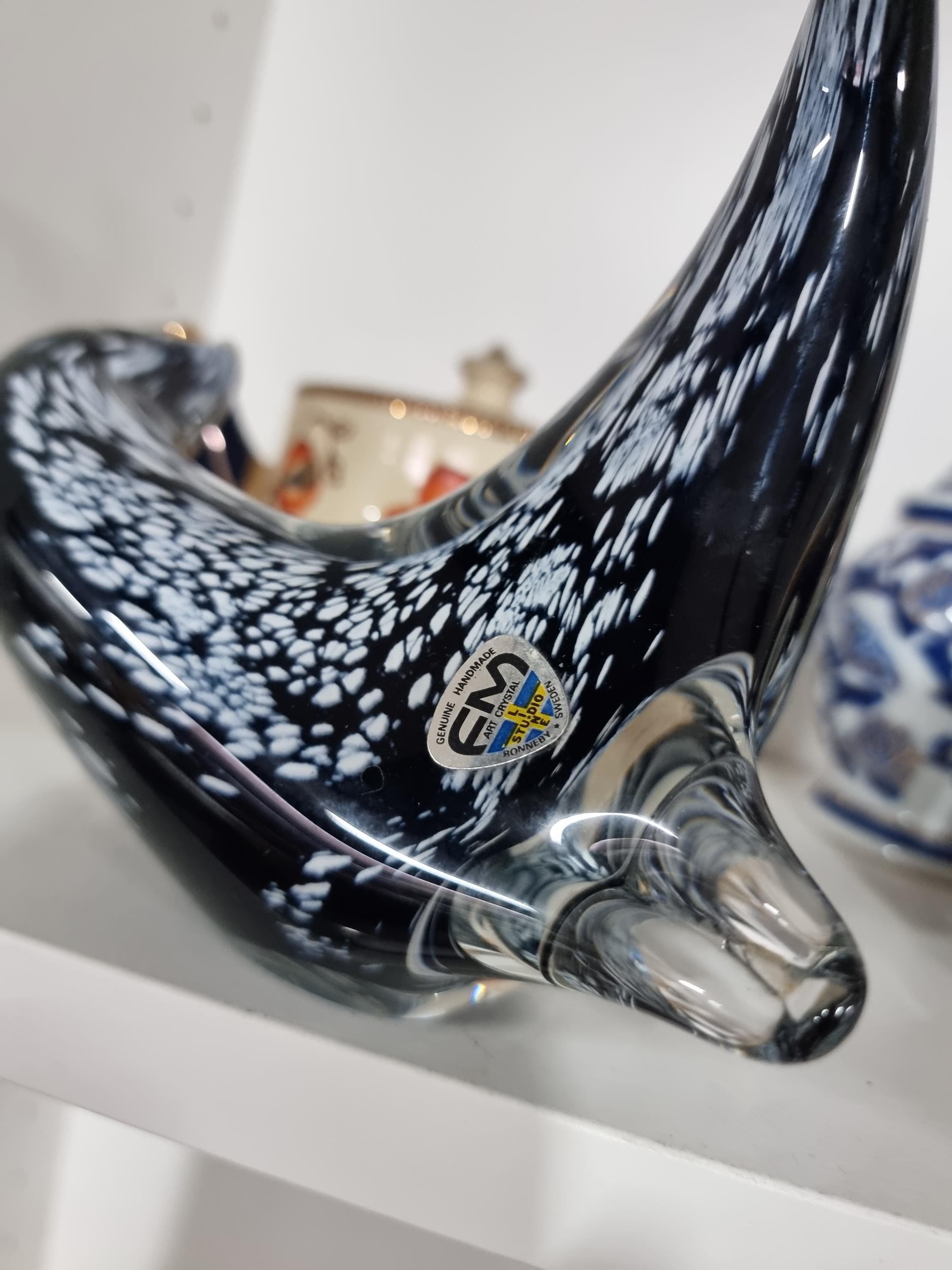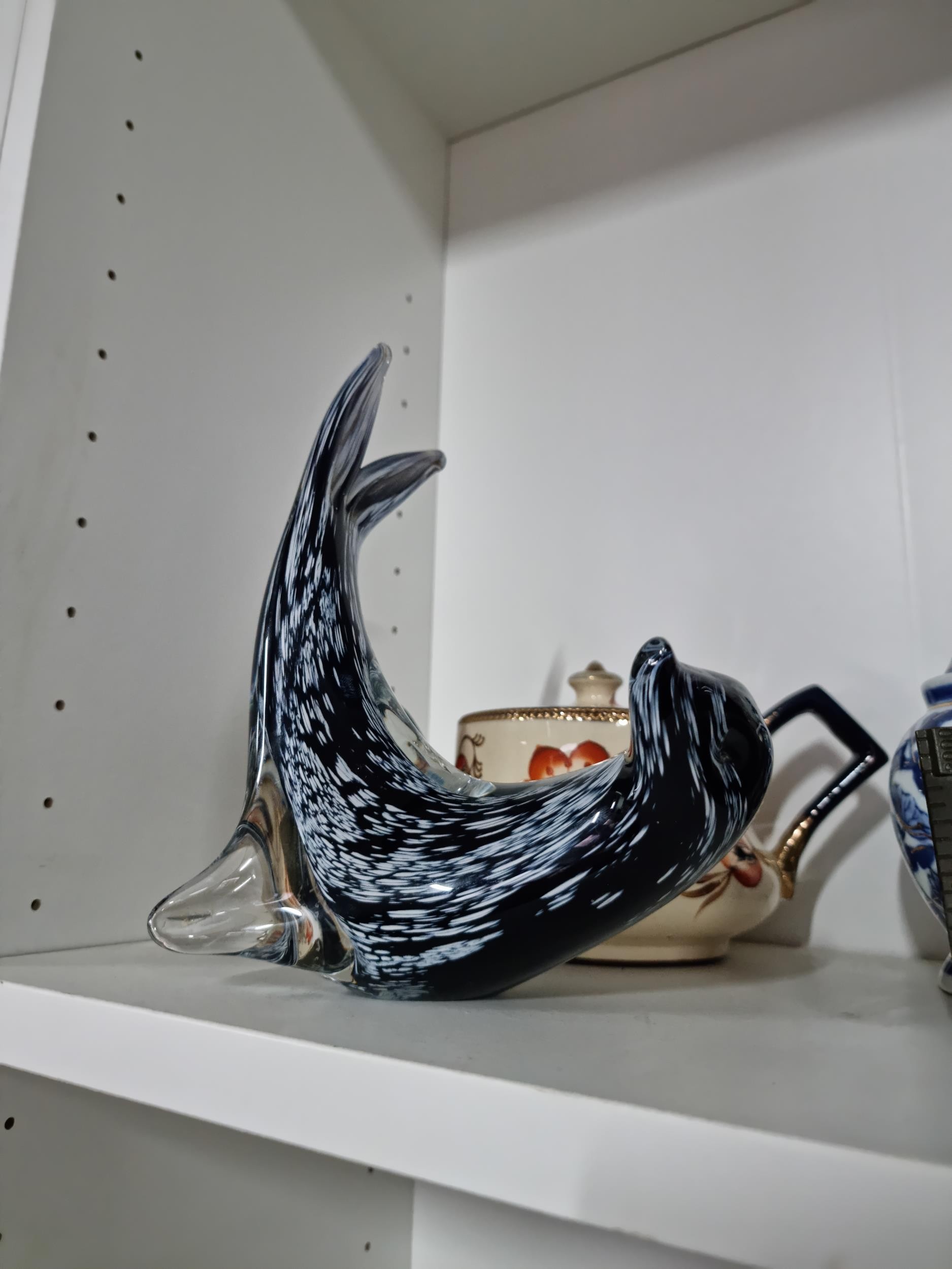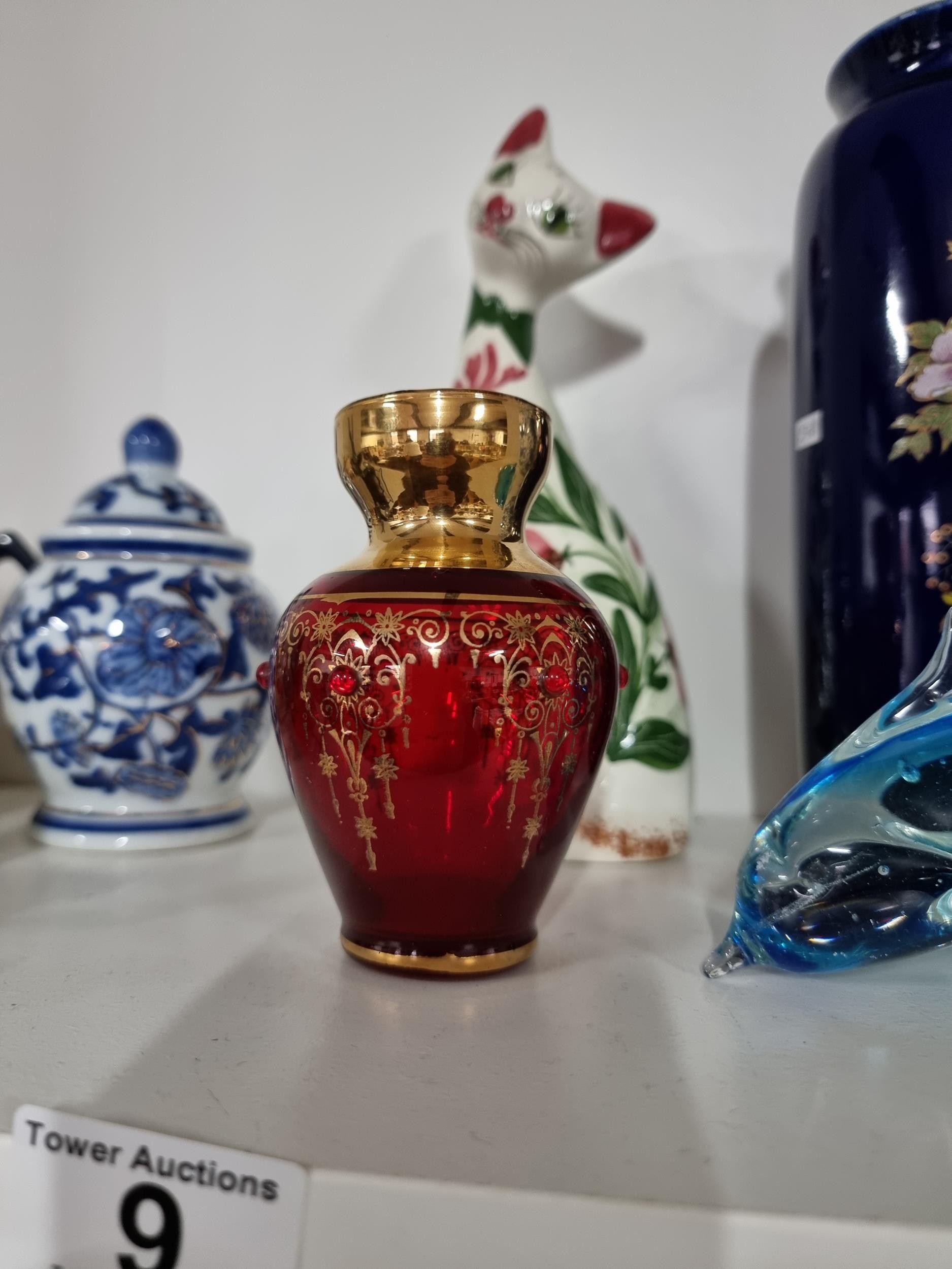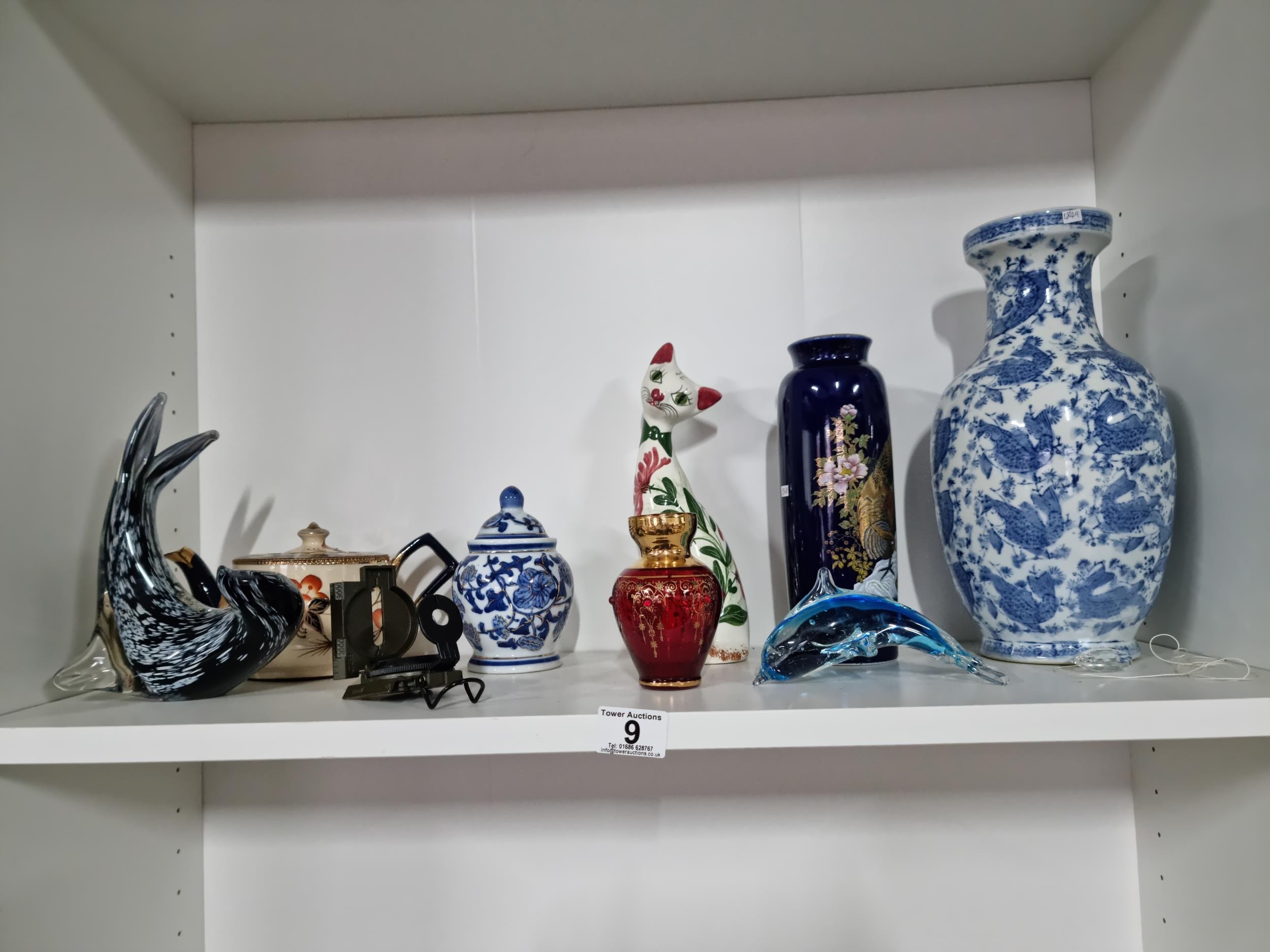 A shelf full of collectables including a good quality handmade art crystal seal by l'ne studio Sweden, a Gaudy Welsh teapot, a god quality moser style gilded red vase, a tall oriental vase with coy carp design and a good quality modern survival compass. Tallest piece stands at 31cm.