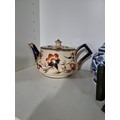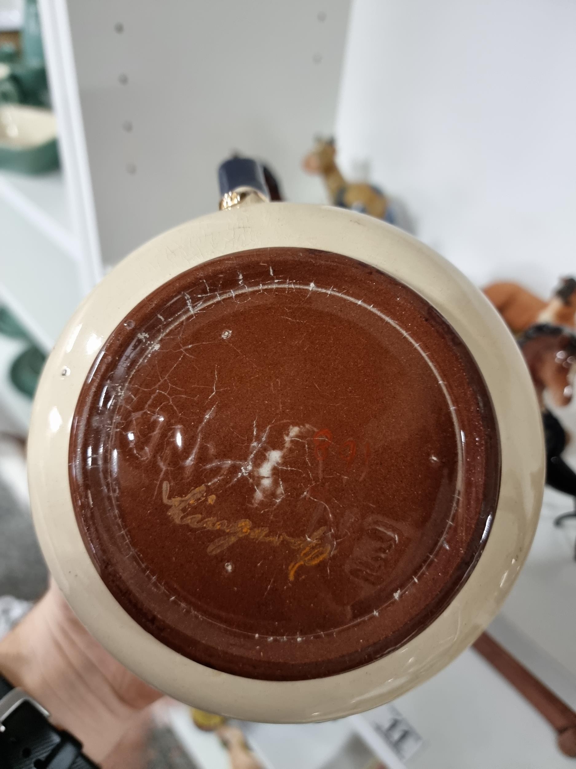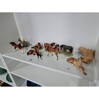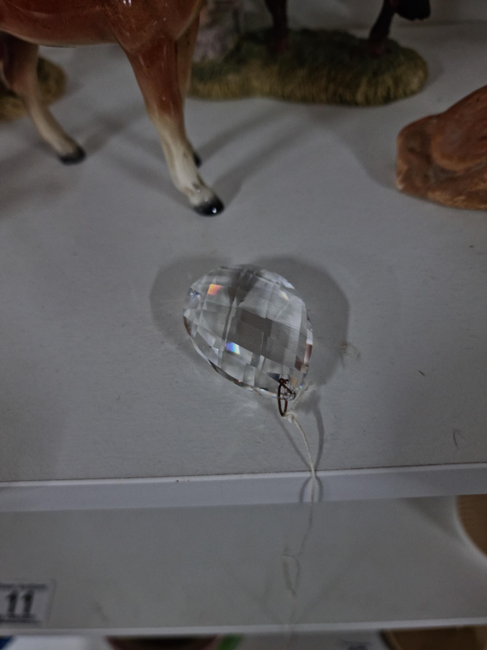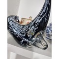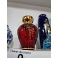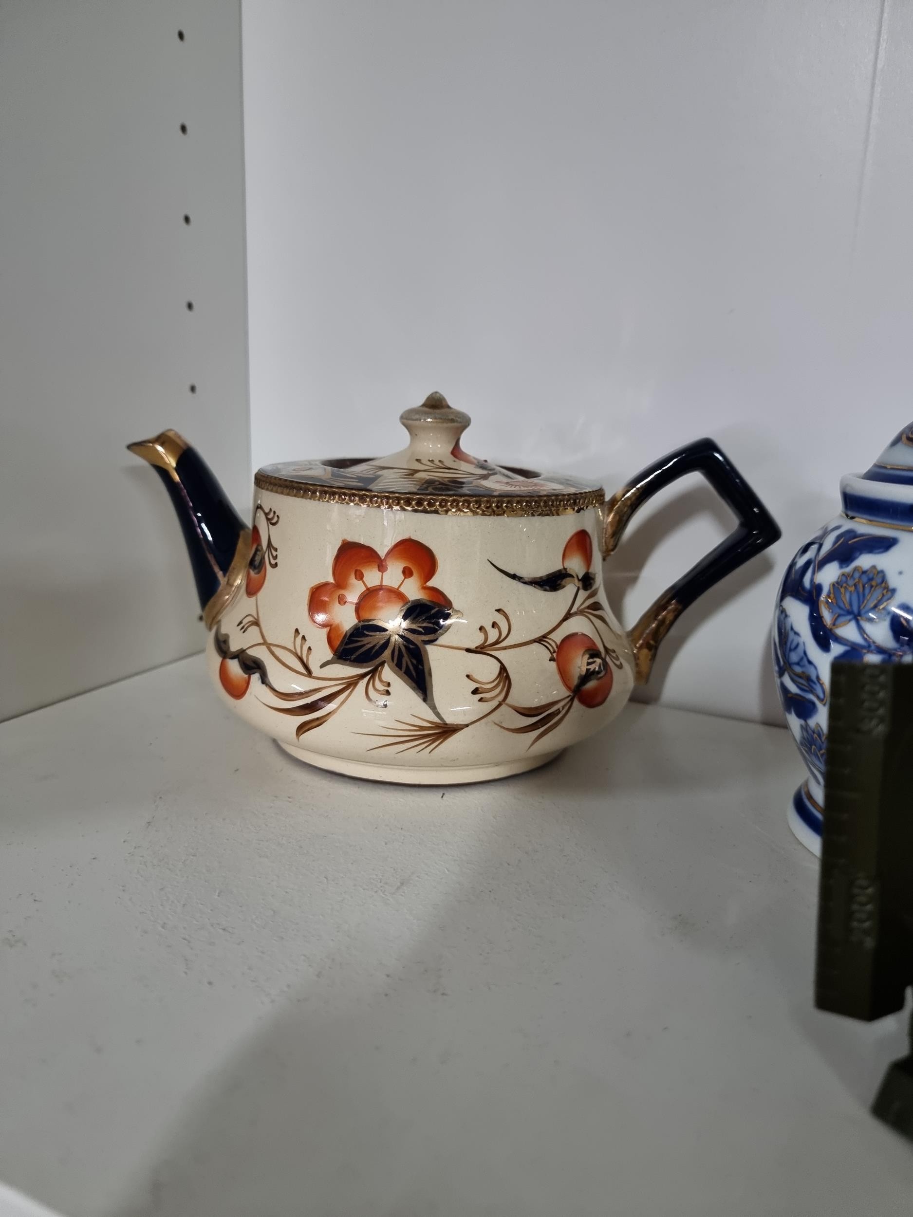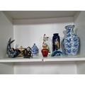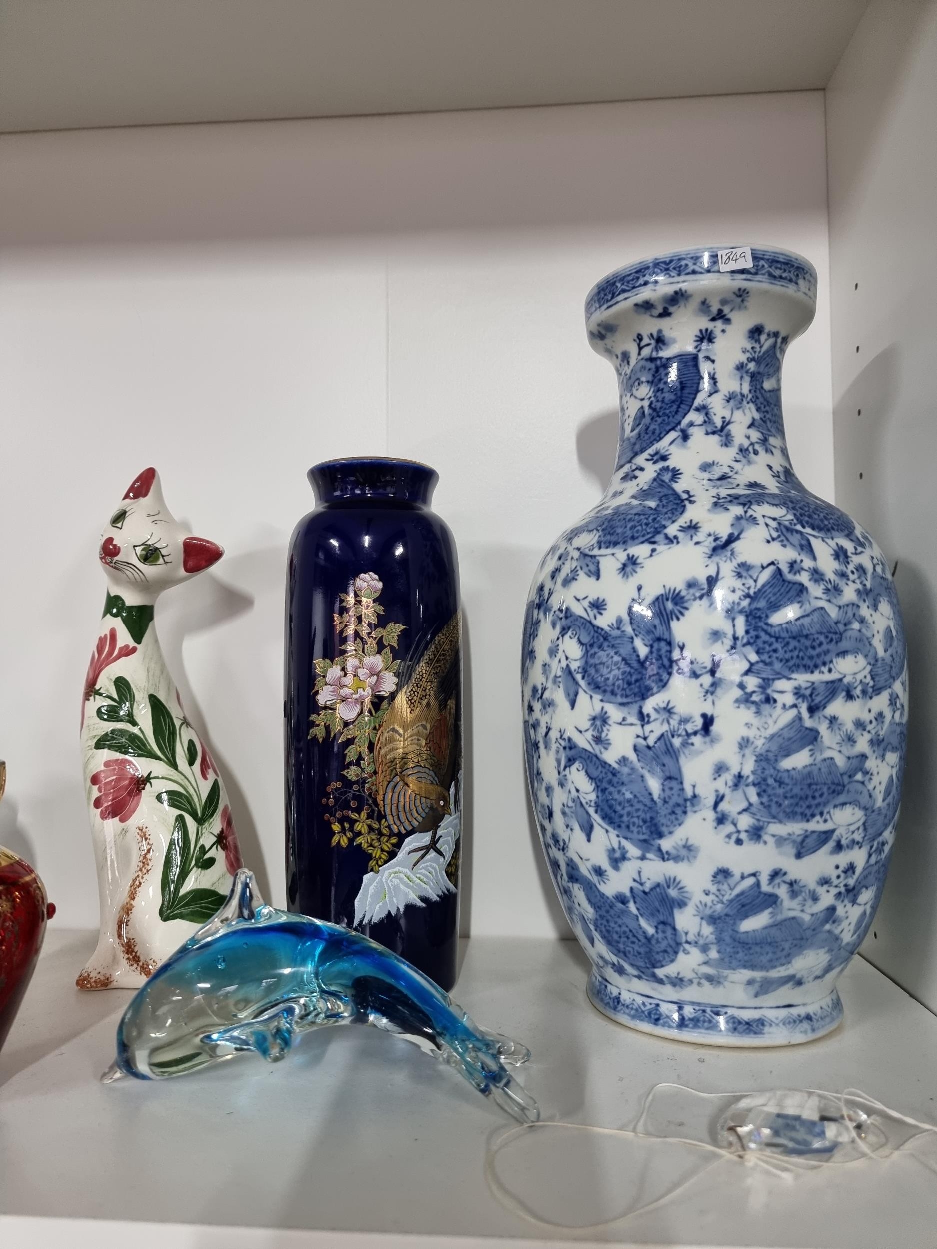 A shelf full of collectables including a good quality handmade art crystal seal by l'ne studio Sweden, a Gaudy Welsh teapot, a god quality moser style gilded red vase, a tall oriental vase with coy carp design and a good quality modern survival compass. Tallest piece stands at 31cm.