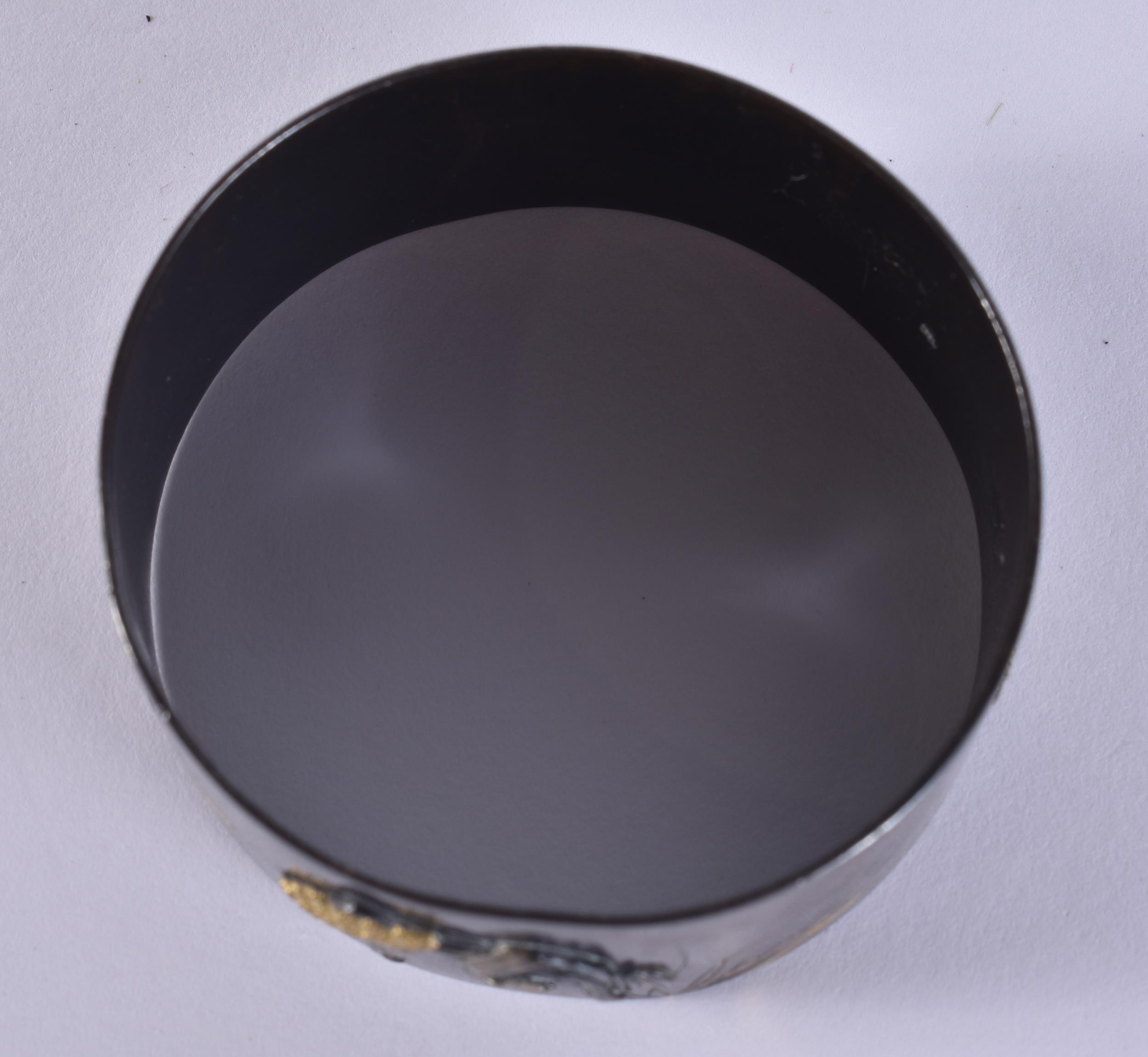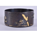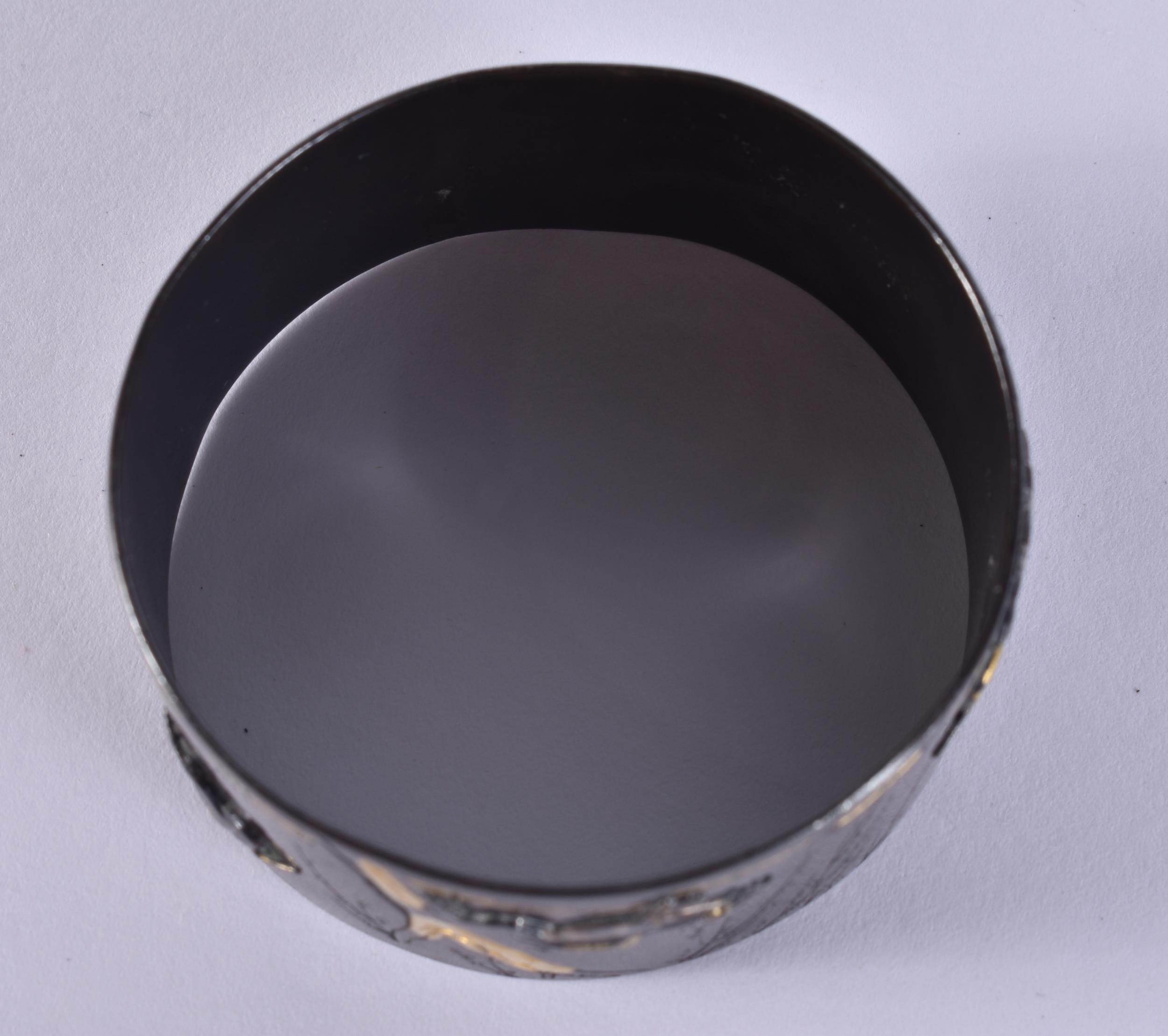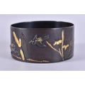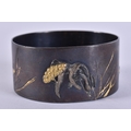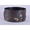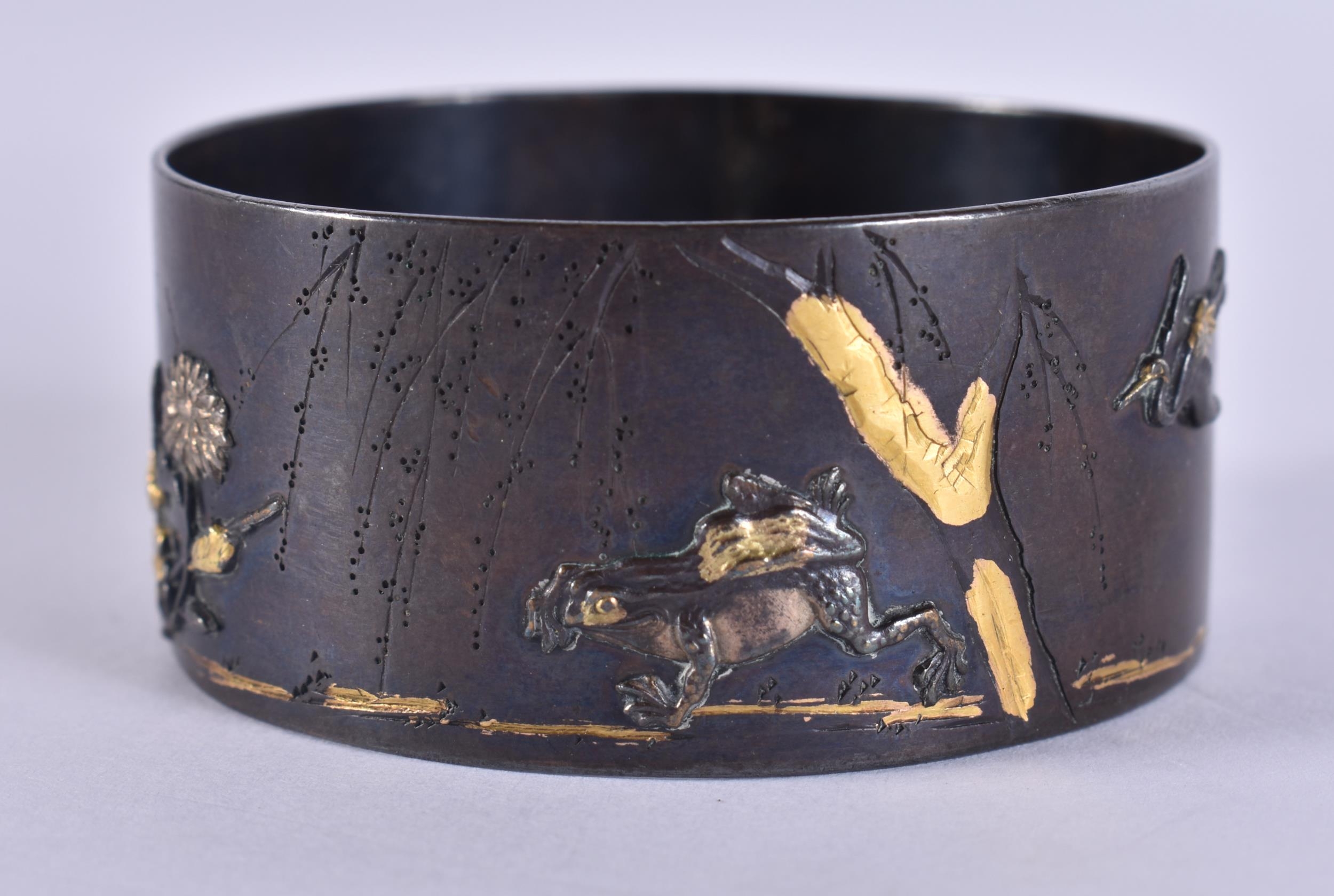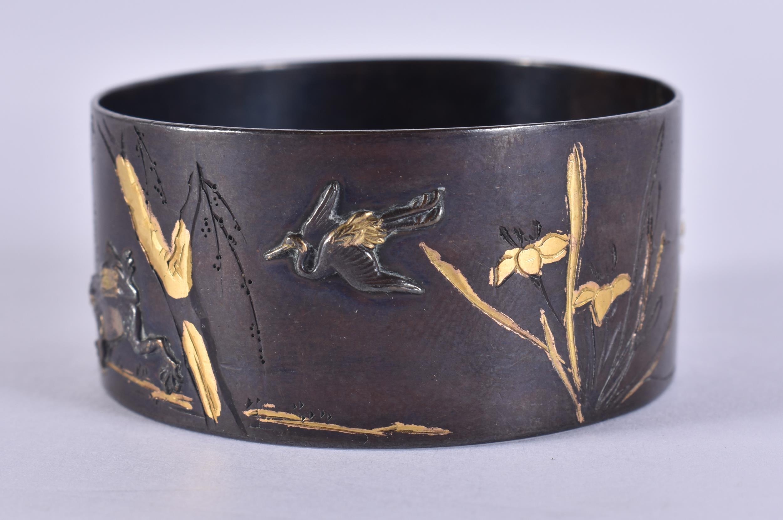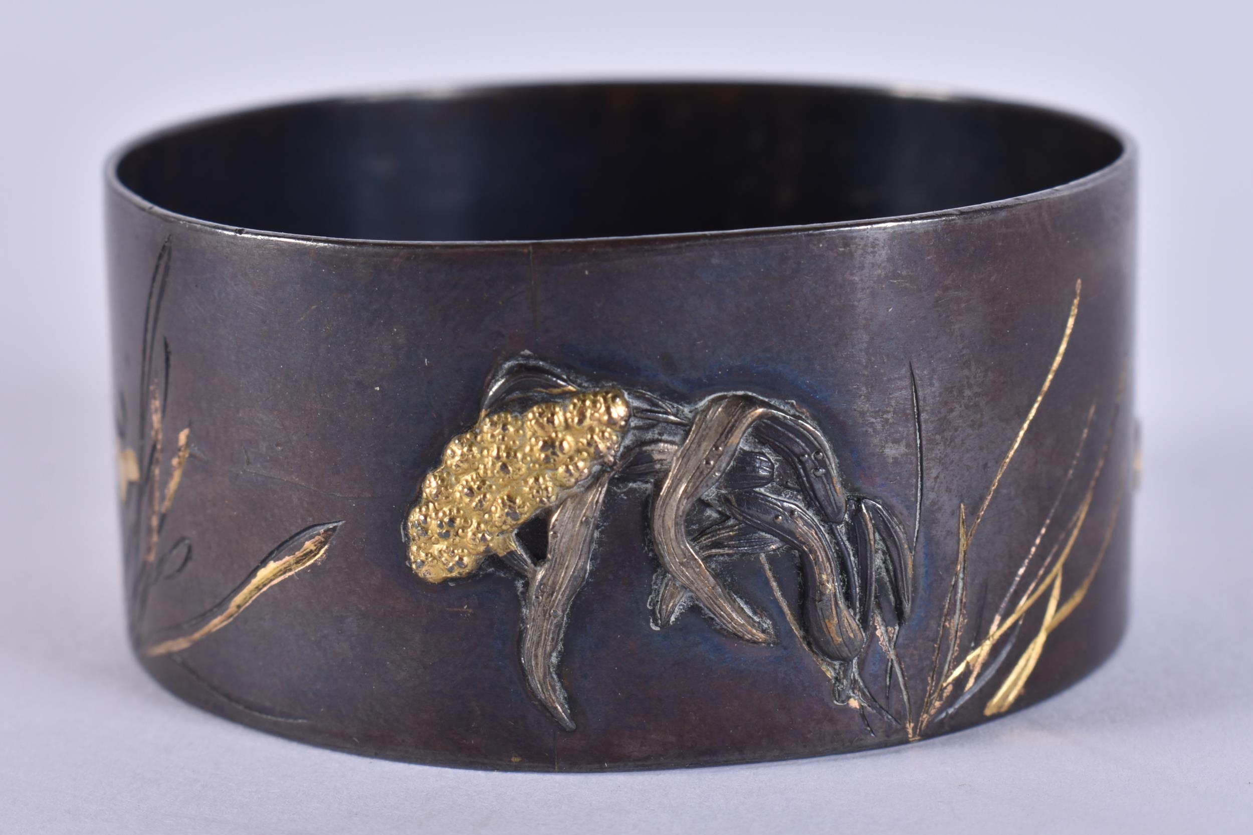 A 19TH CENTURY JAPANESE MEIJI PERIOD ONLAID BRONZE NAPKIN RING decorated with birds and flowers. 5 cm diameter.