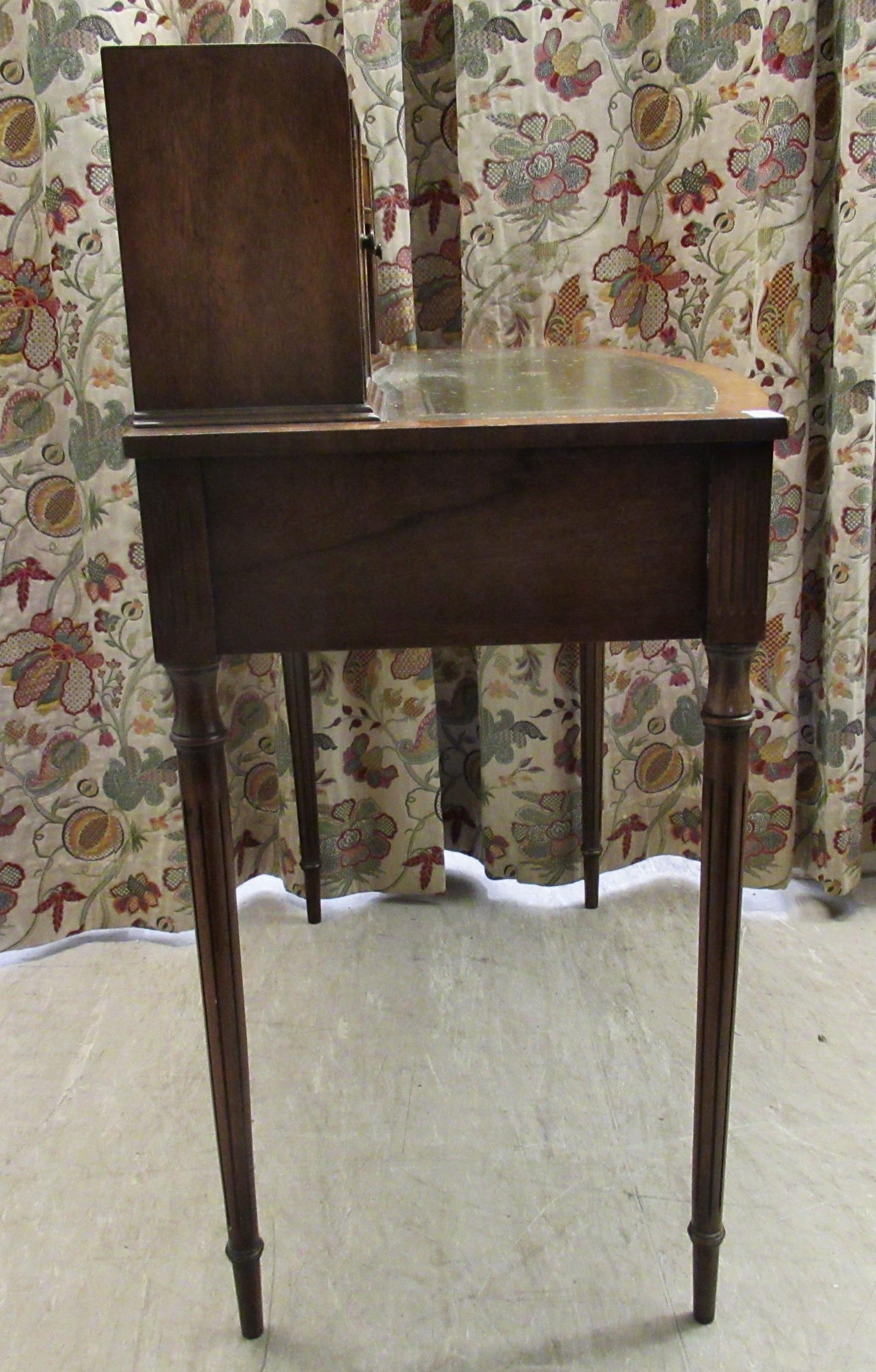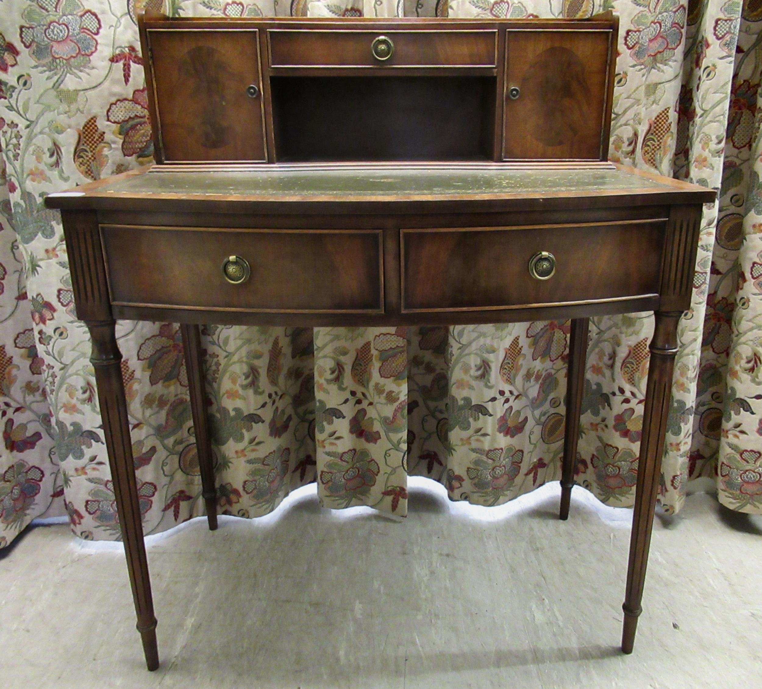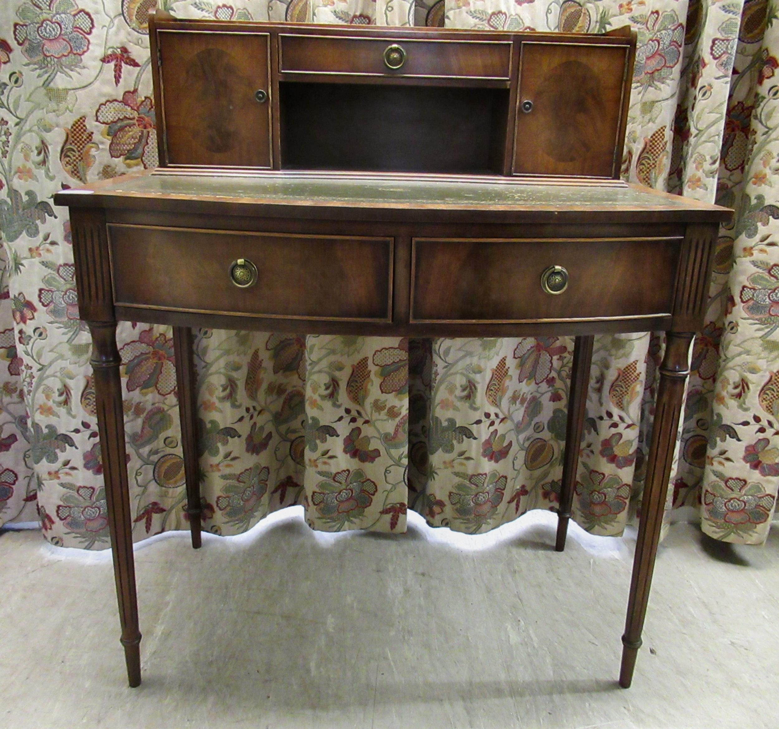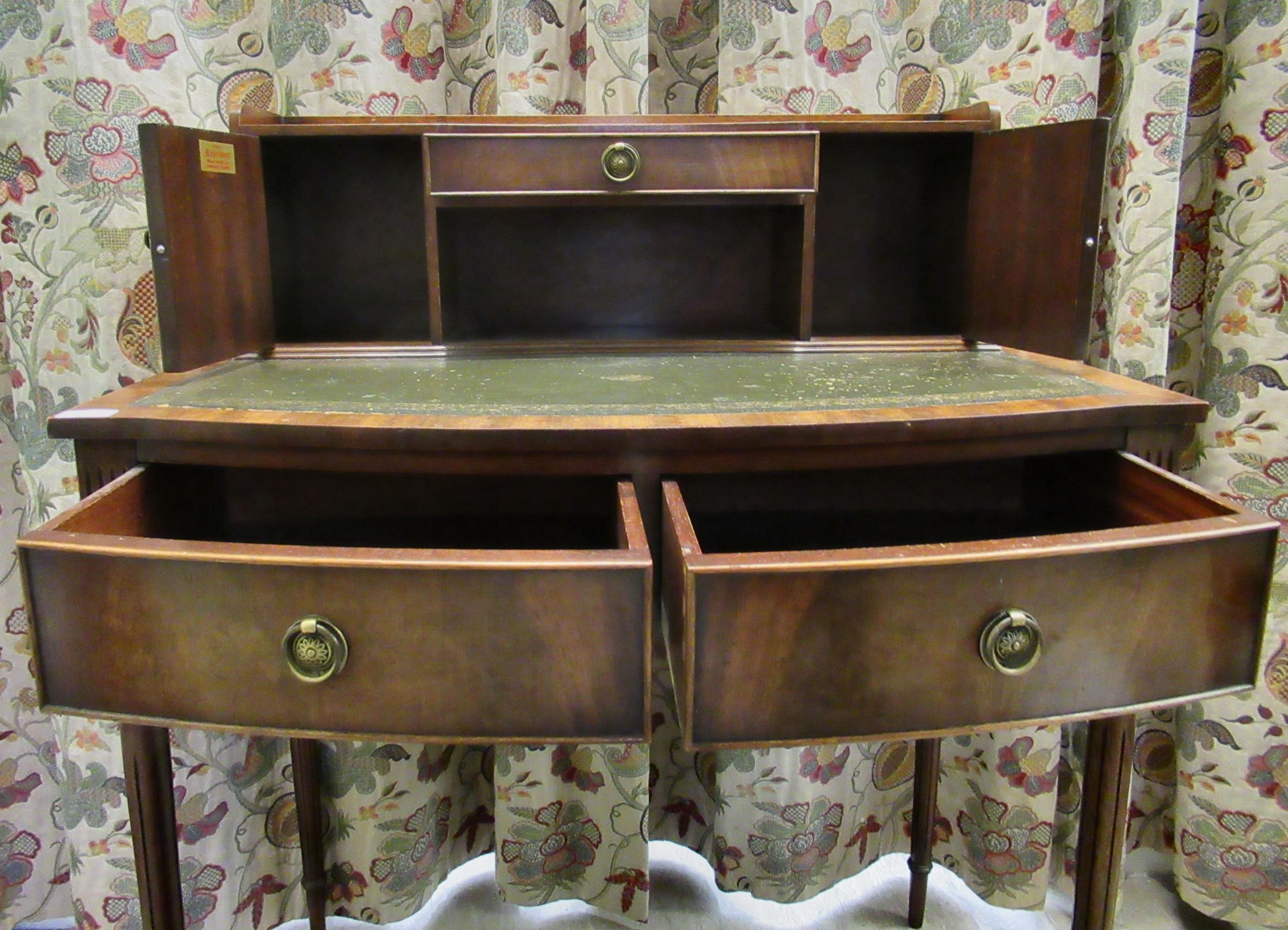 A modern crossbanded mahogany writing desk with an arrangement of drawers/doors/open shelves, the green hide scriber over two bow front frieze drawers, raised on tapered, fluted legs 42"h 34"w